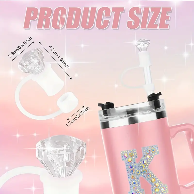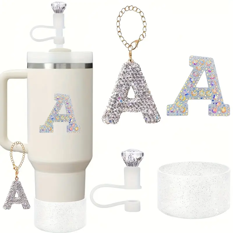 4pcs Water Bottle Accessories Set for Tumbler Cup 30oz/40oz, Diamond Letter Charms, Diamond Straw Cover, Glitter Silicone Boot, Diamond Letter Sticker Perfect for gift