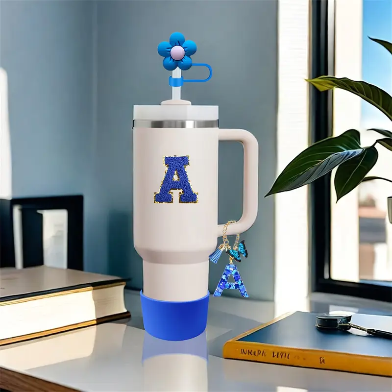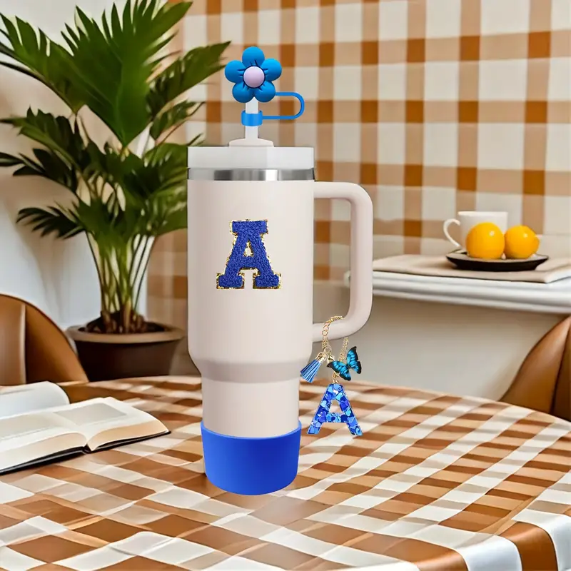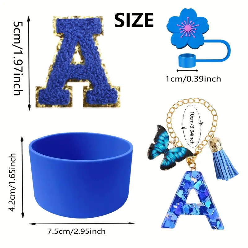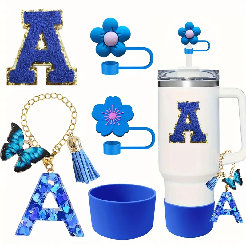 6pcs Blue Cup Accessories Set for Cup 30oz 40oz tumbler with handle, Including Silicone Straw Topper Cover Cap and Boot, Handle Charm, Initials Sticker