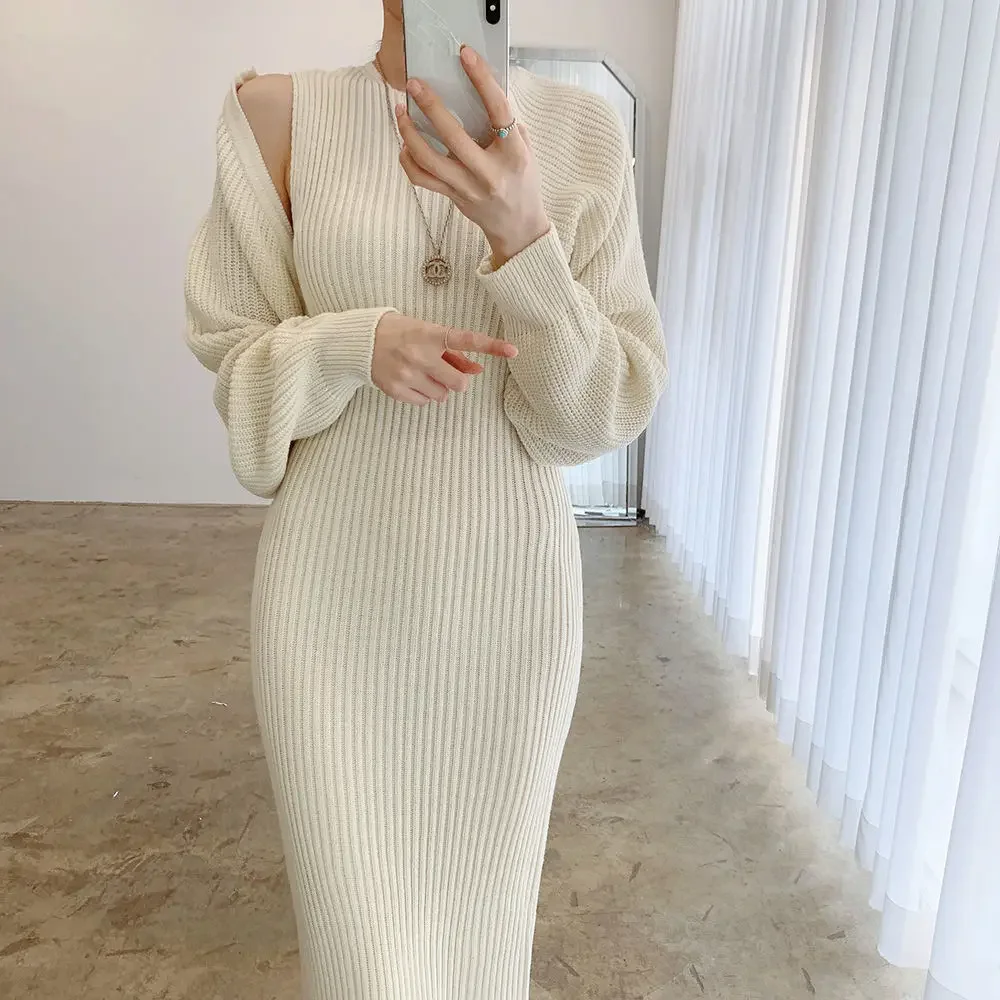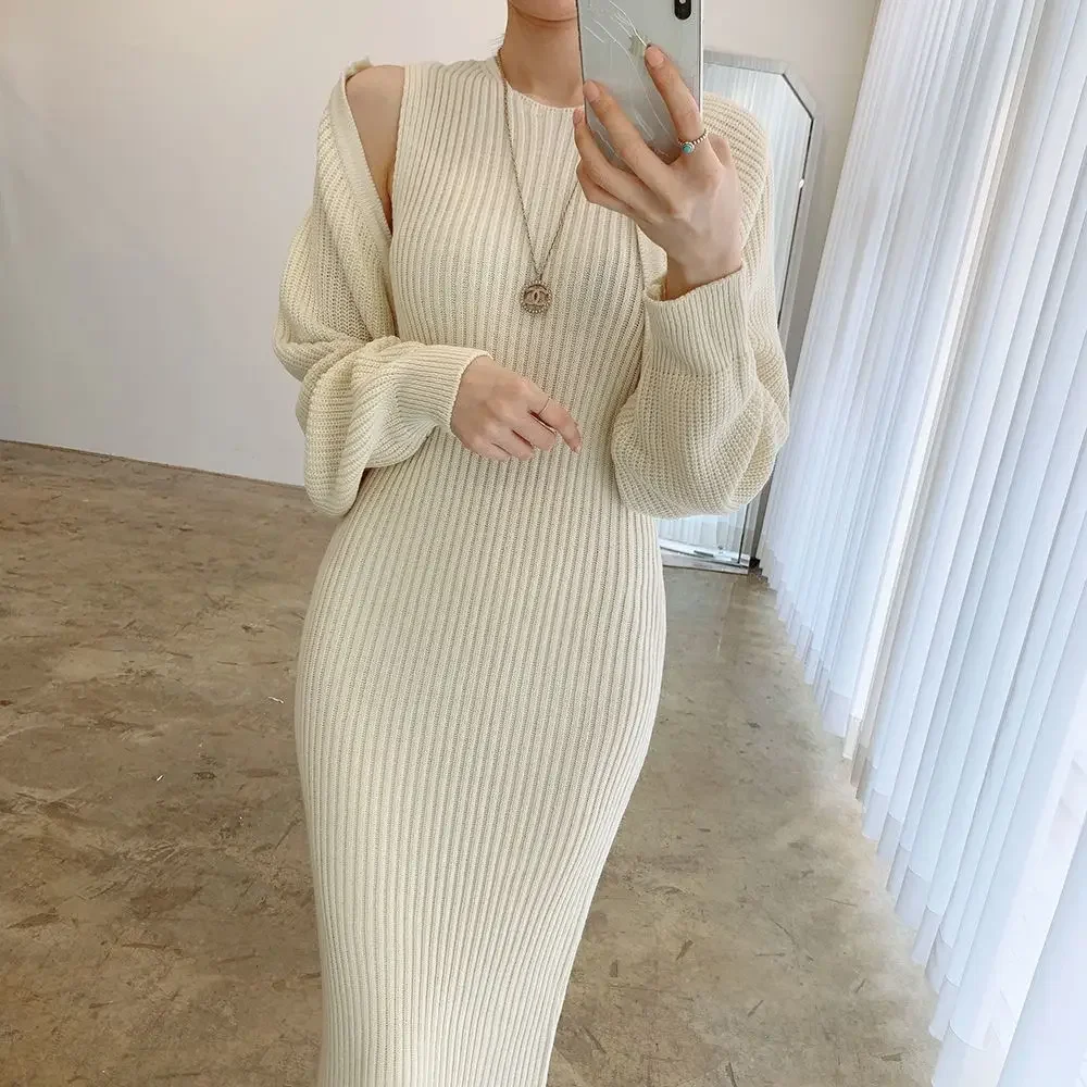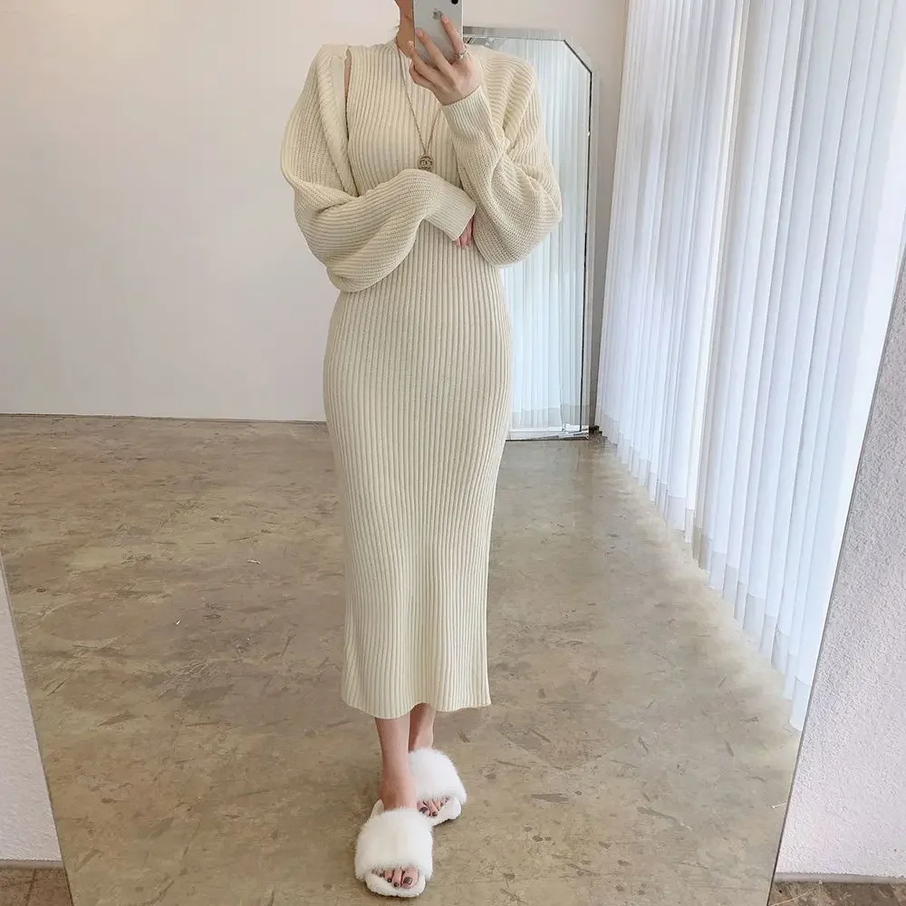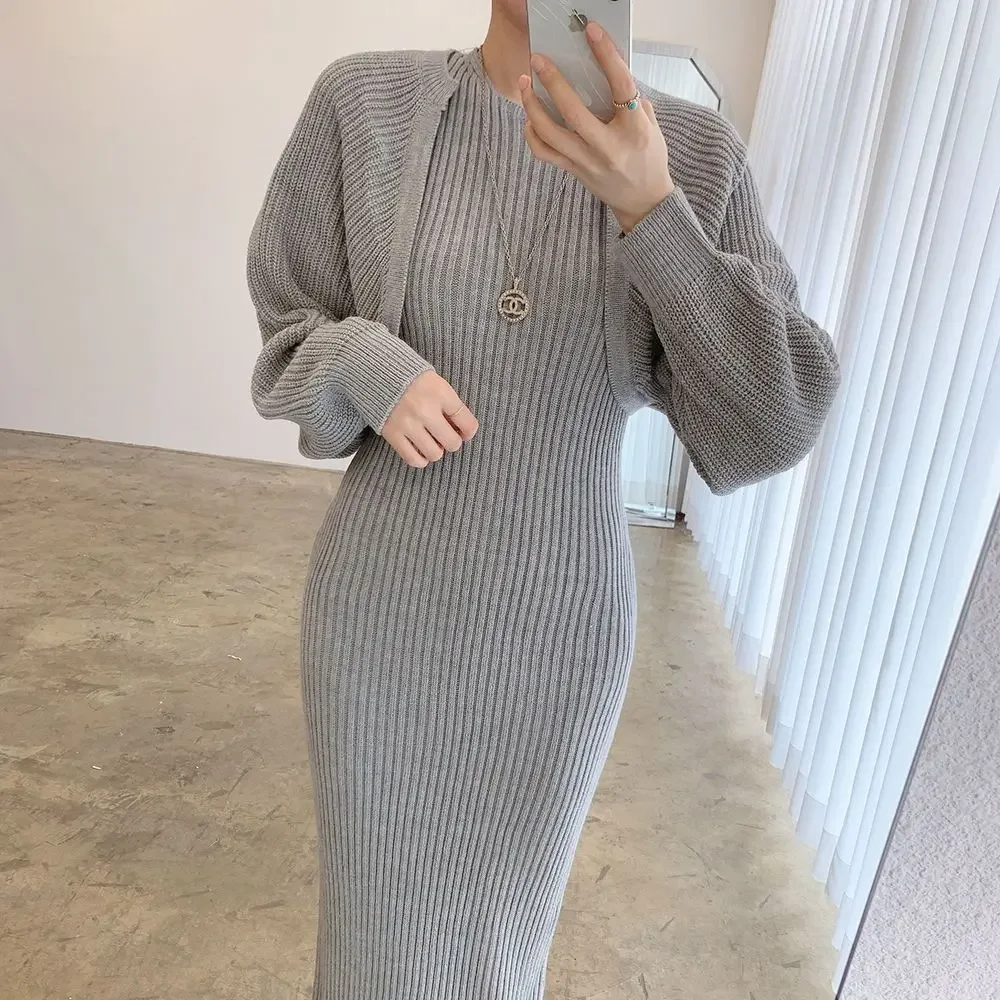 Autumn 2025 Gentle round Neck Slim Fit Bodycon Vest Dress + Long Sleeve Short Knitted Shawl Set Women's Fashion Skirt Suit