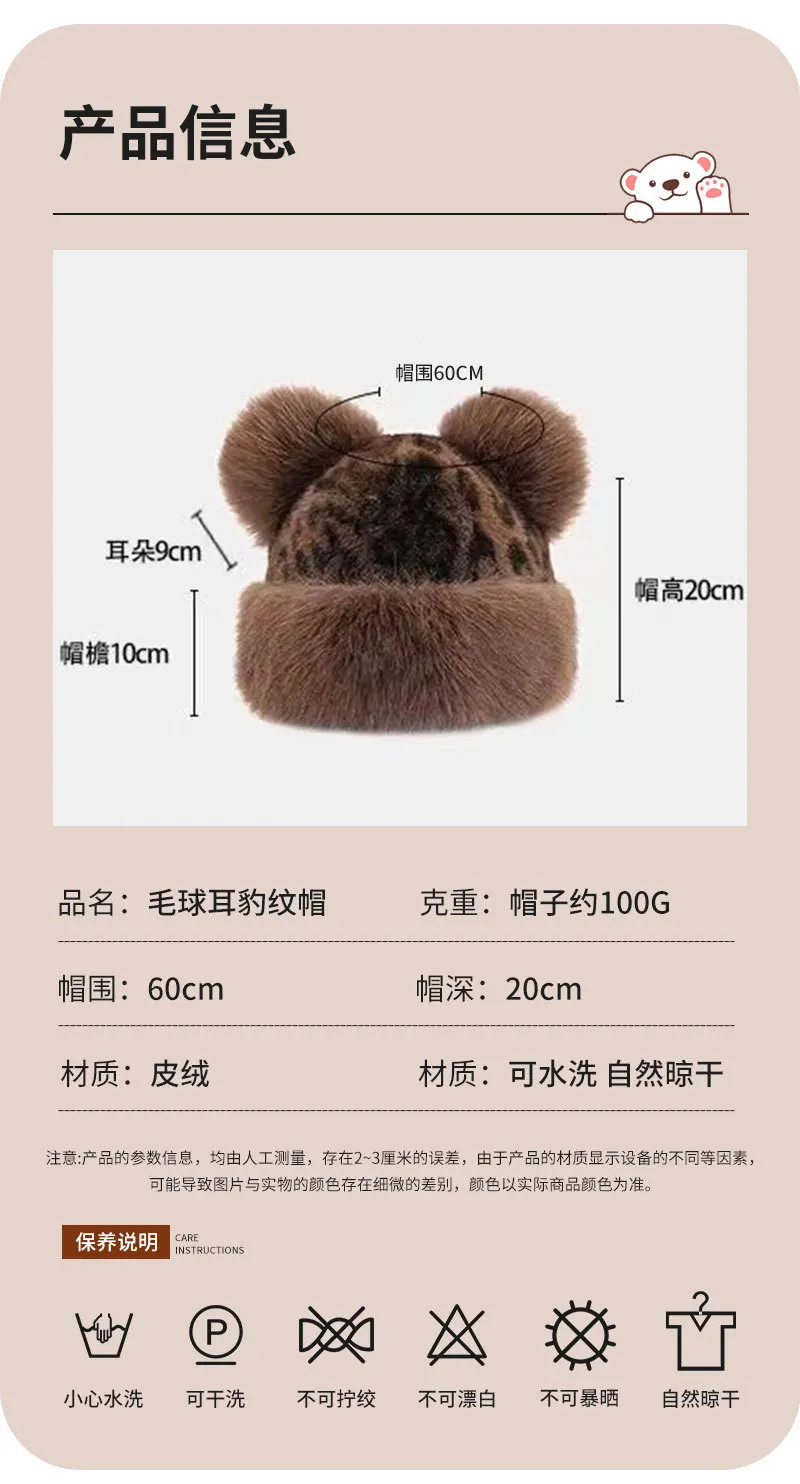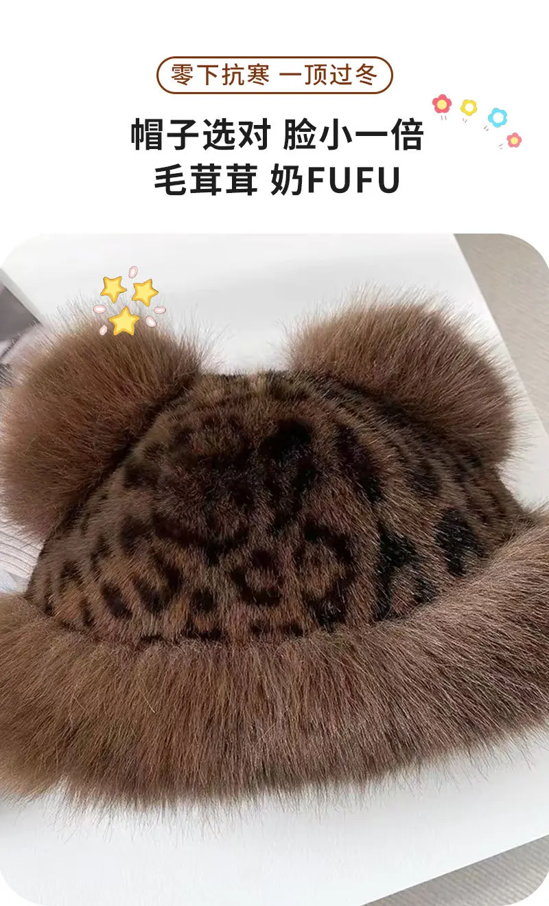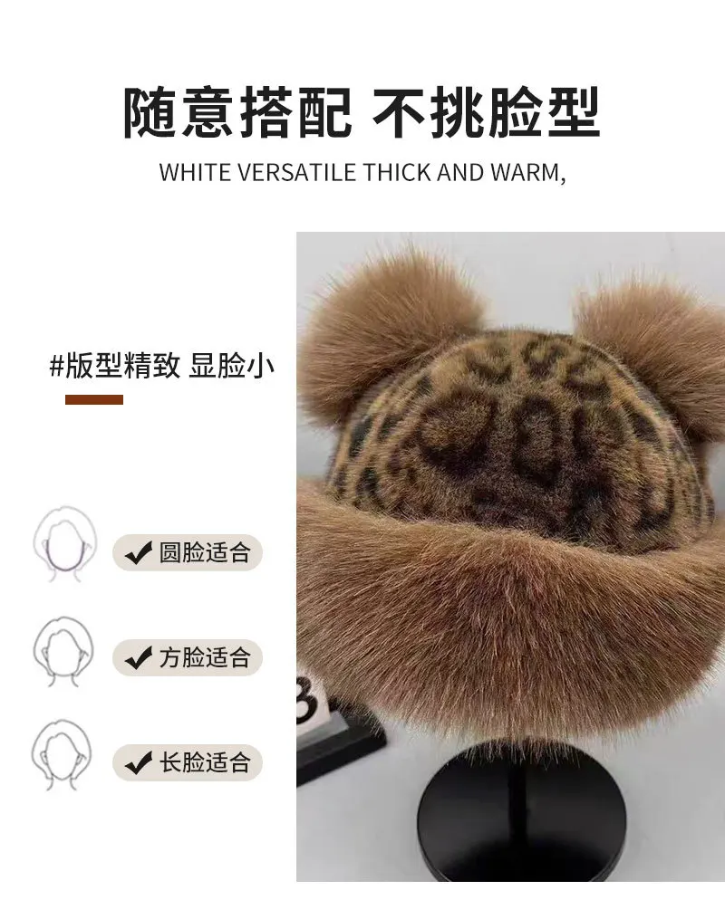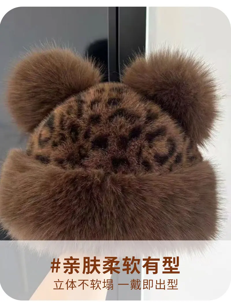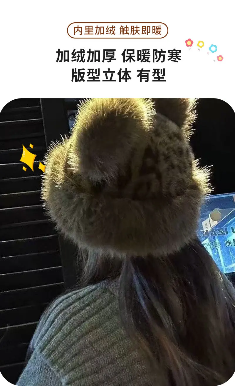 Autumn and Winter Korean Plush Ear Protector Pot Hat for Women with Leopard Pattern Little Bear Ears