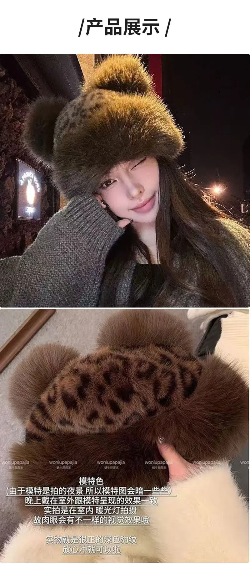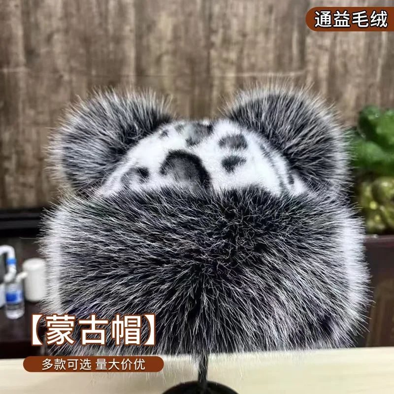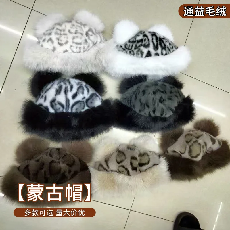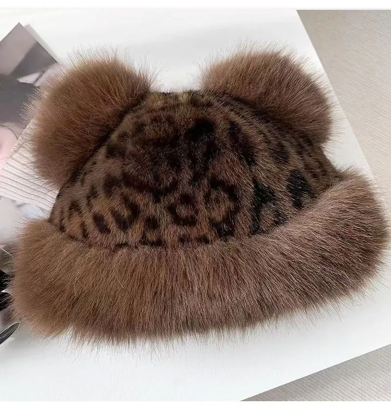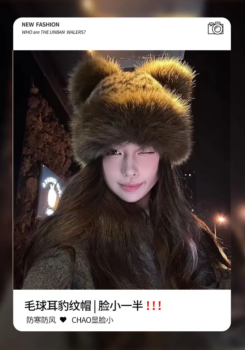 Autumn and Winter Korean Plush Ear Protector Pot Hat for Women with Leopard Pattern Little Bear Ears