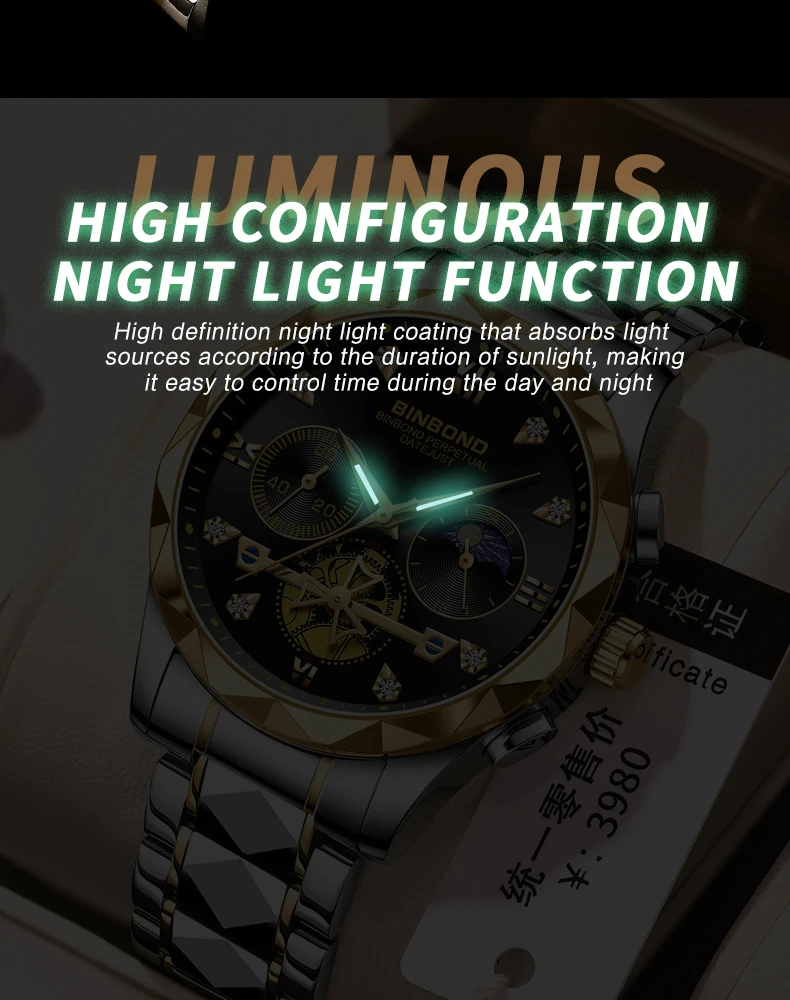BINBOND Relojes deportivos para hombre, reloj de negocios luminoso resistente al agua, reloj de cuarzo para hombre, reloj de acero inoxidable a la moda para hombre