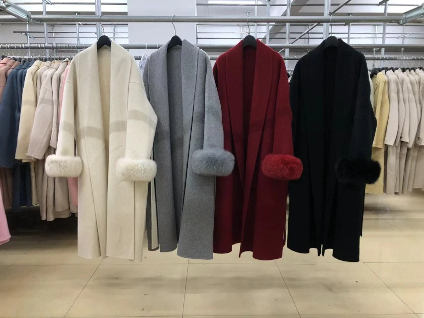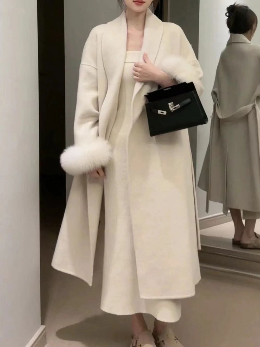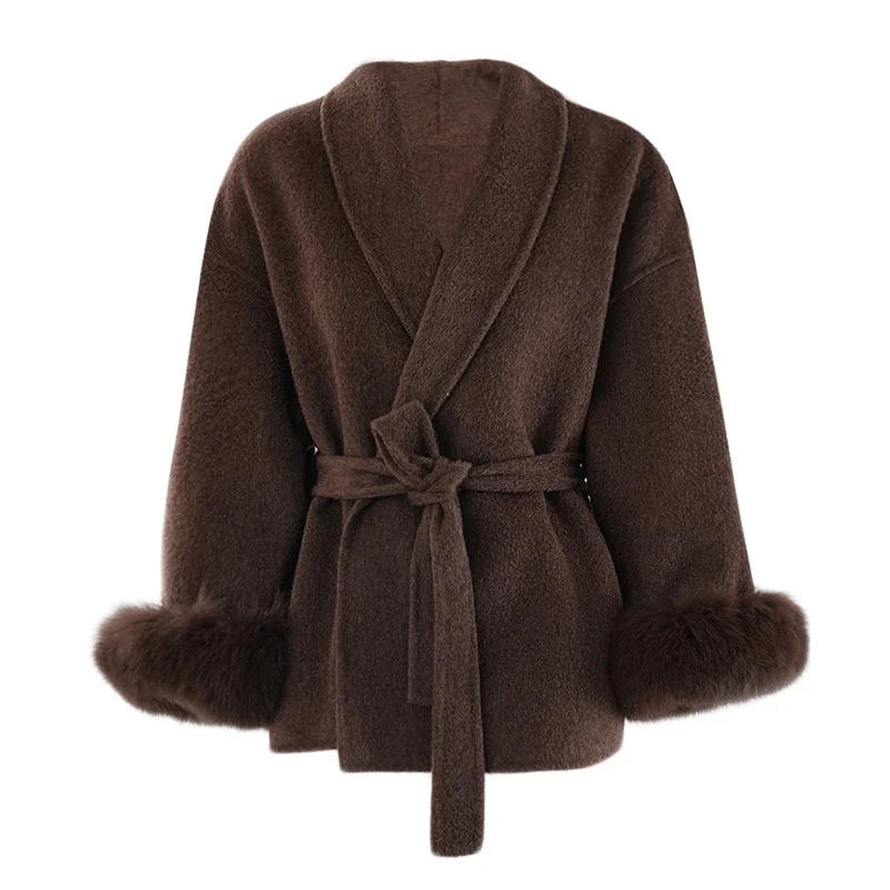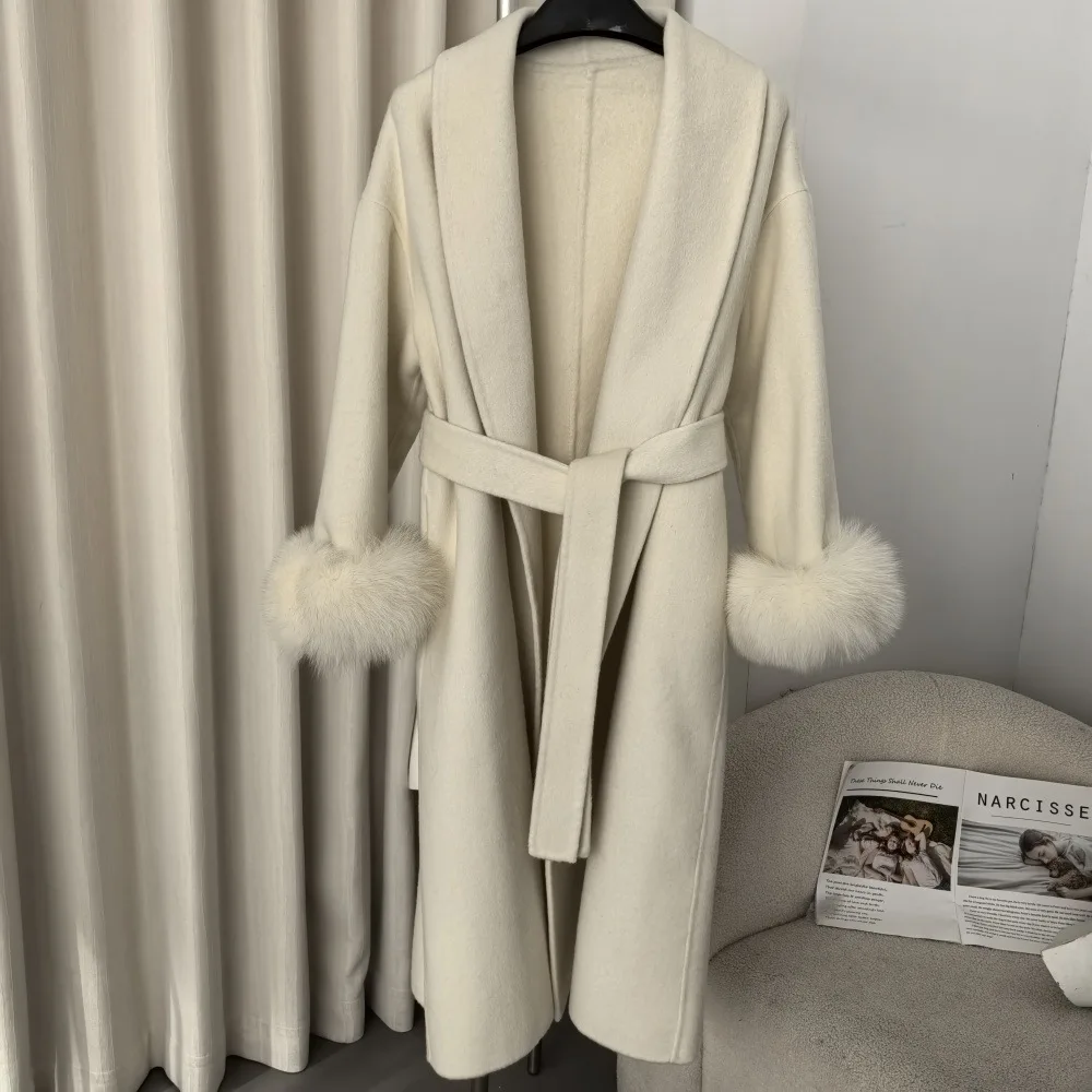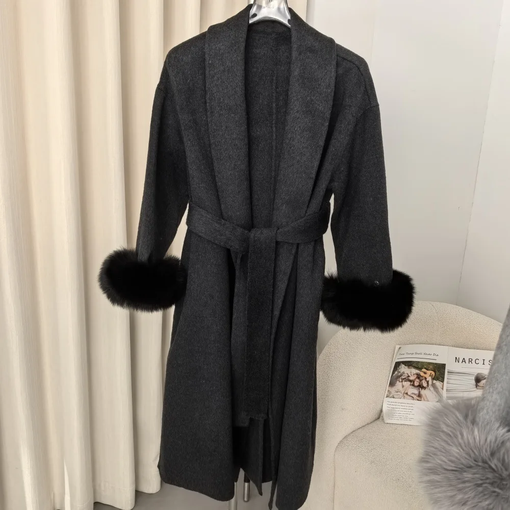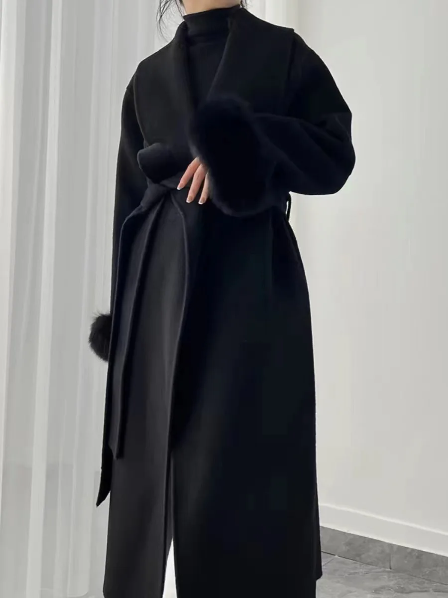 BJTZ Fox Hair Cuffs Double-sided Cashmere Coat Women 2024 Autumn/winter Mid-length Lace-up Loose Coat Fashion Simple