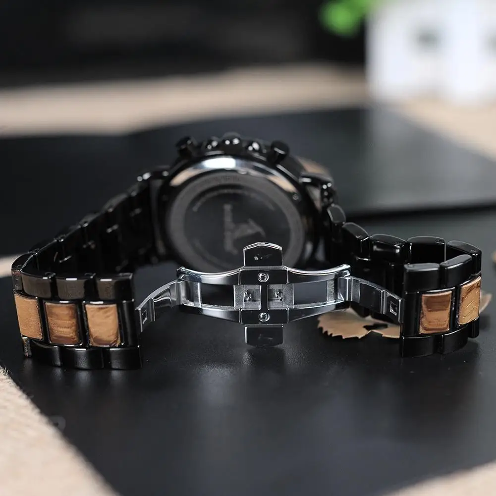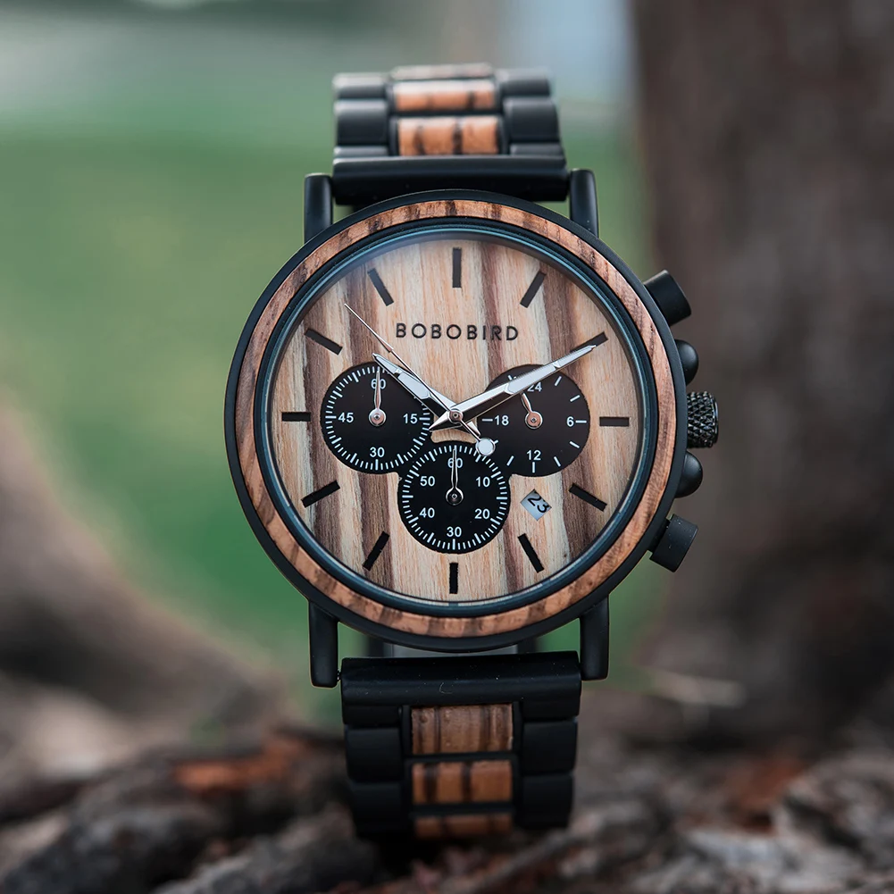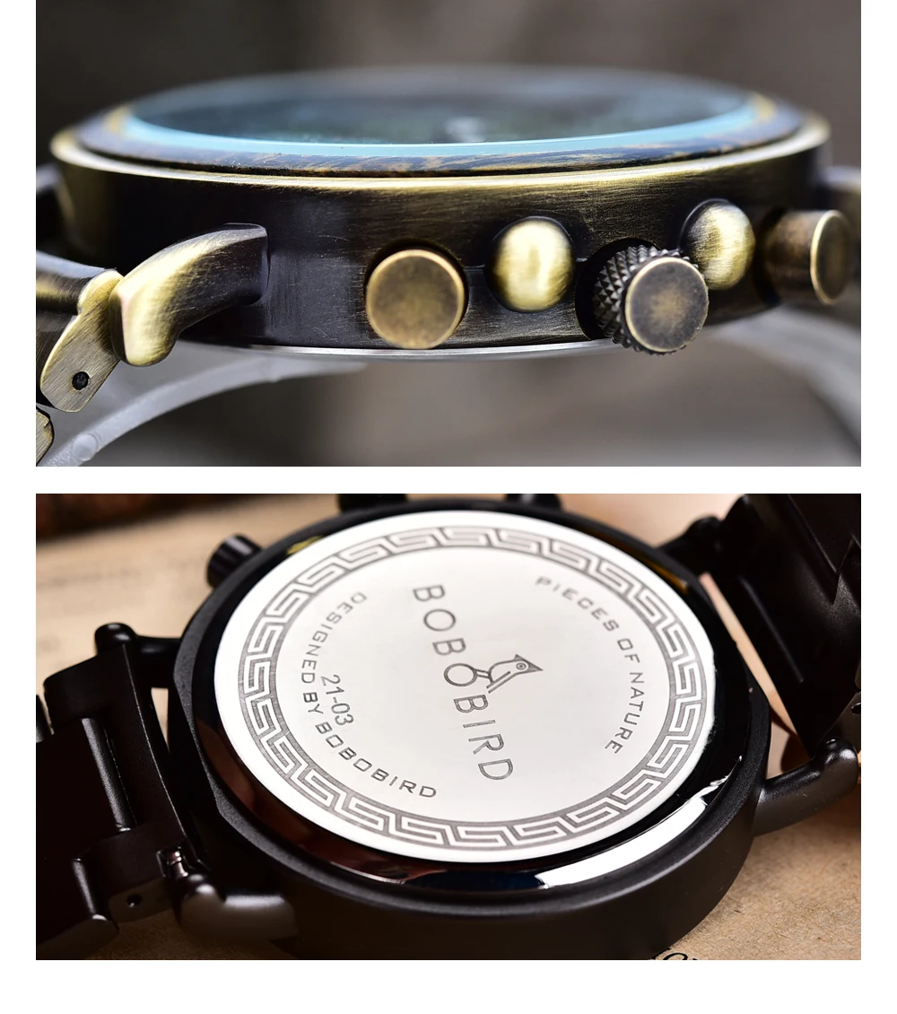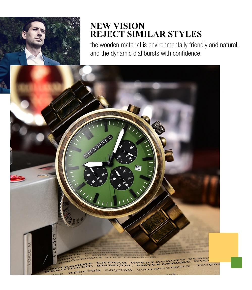 BOBO BIRD Men Watch Fashion Green Wooden Metal Quartz Watches Wristwatch Chronograph Auto Date Display Timepiece Great Gift Box