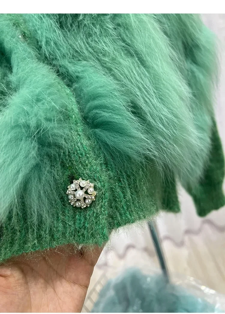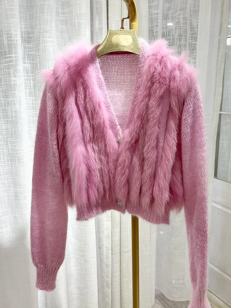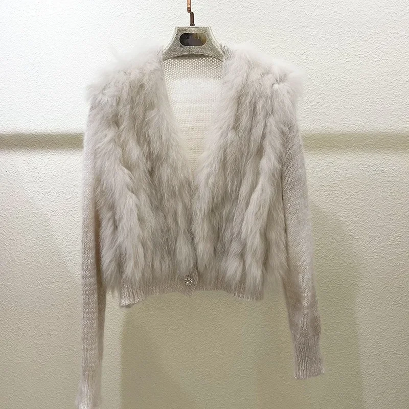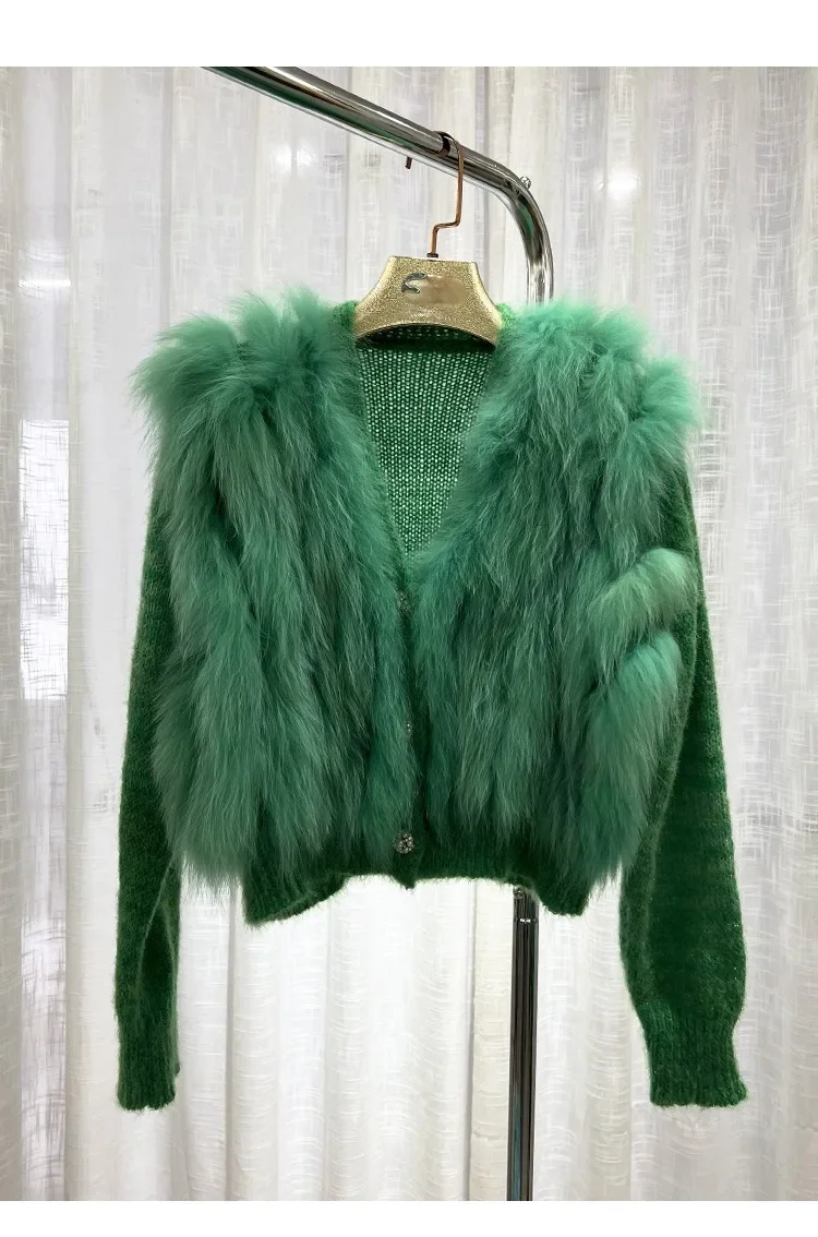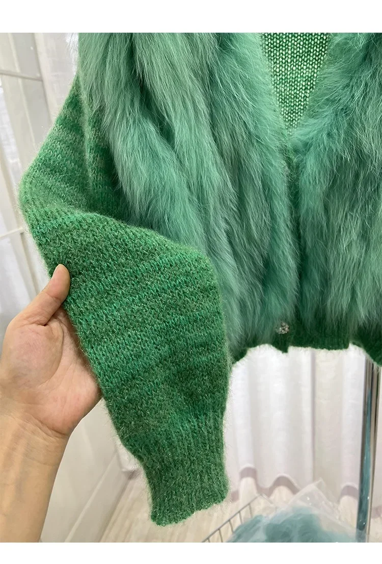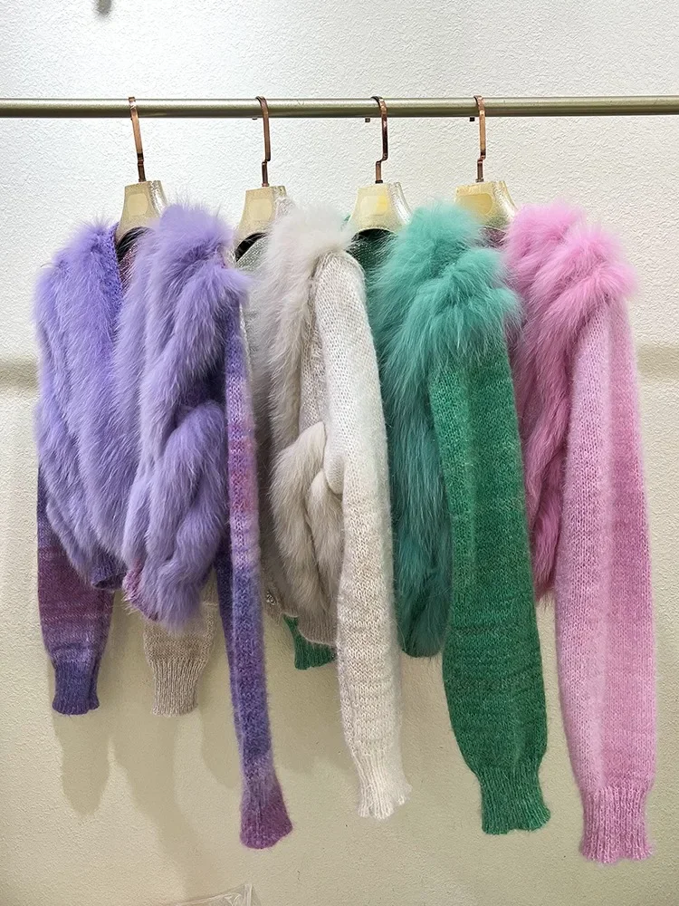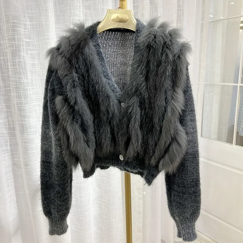 Cardigan Coat with Real Fox Fur Fur Loose Natural Fox Fur Jacket Female Cropped Sweaters 2024 Fashion Women Spring Short Knitted