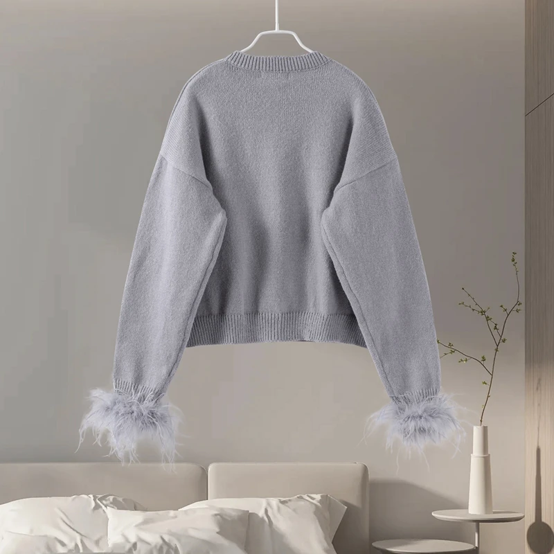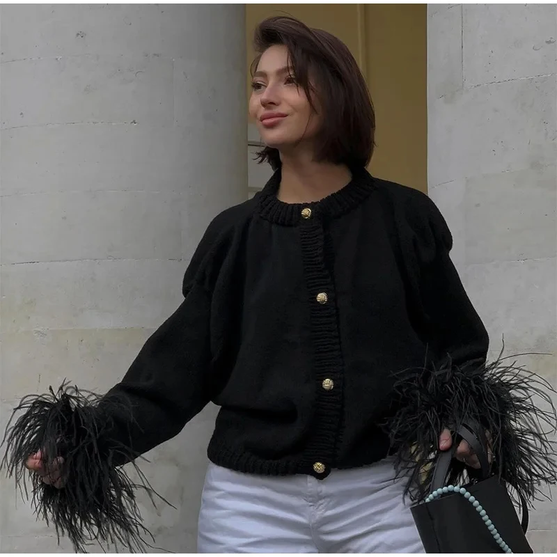 Casual Feather Knitted Cardigan Women Loose Long Sleeve Single Breasted Patchwork Sweater 2025 Autumn Lady Street Knitwear