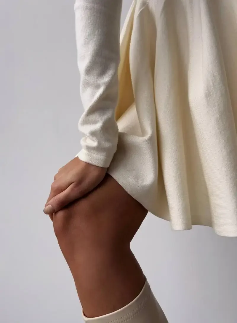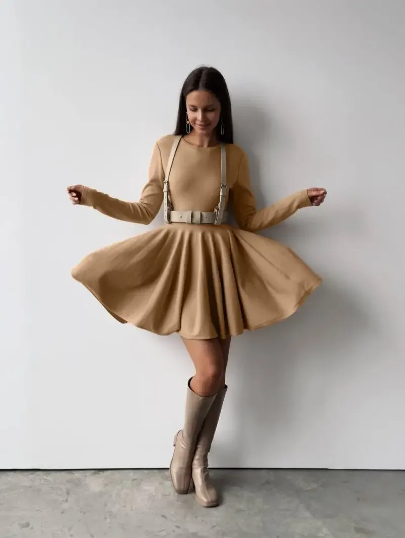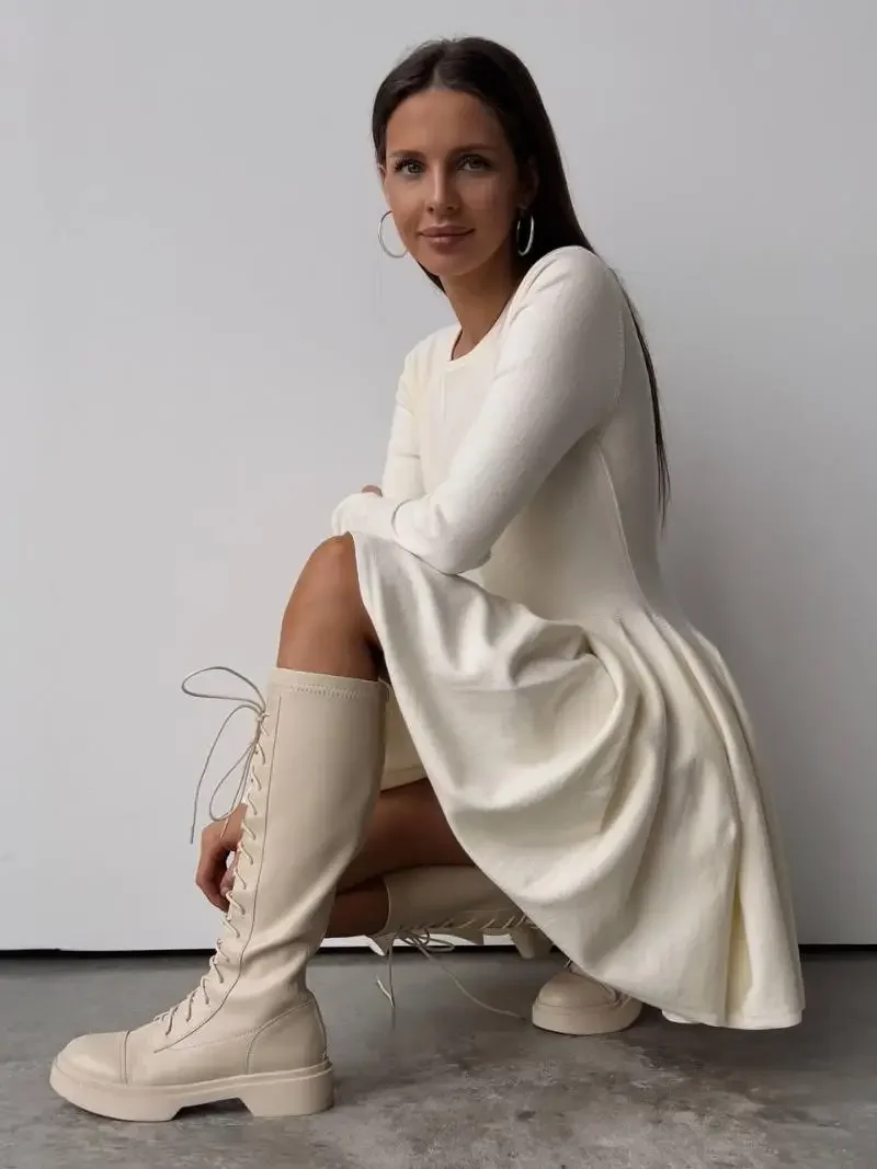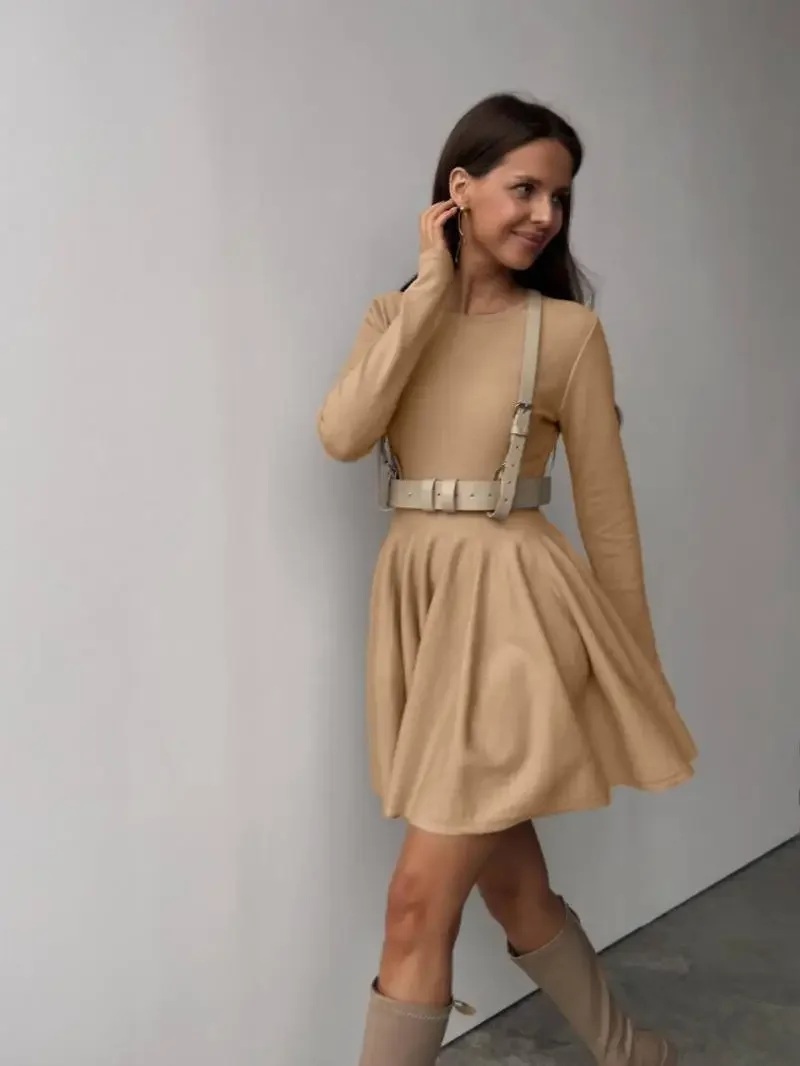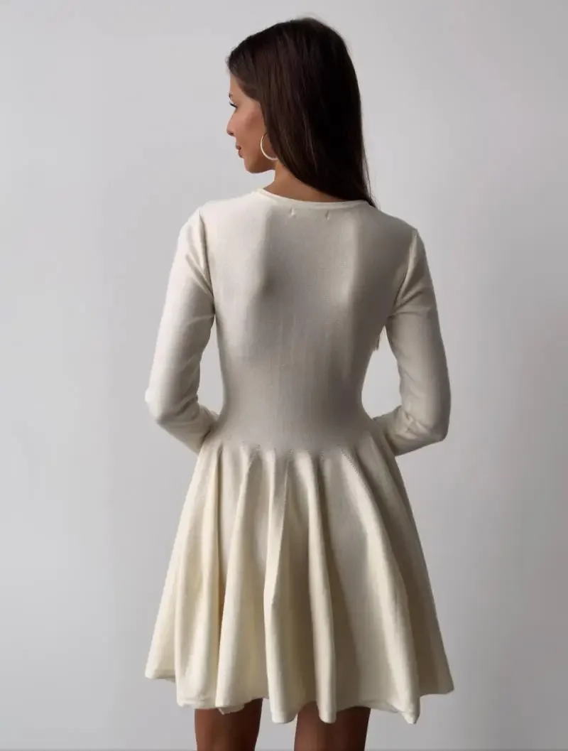 Duomofu Knit Mini Dresses Women Autumn Winter Long Sleeve Sweater Dress Female Elegant Fashion Slim A Line Pleated Dress Vestido