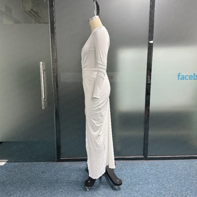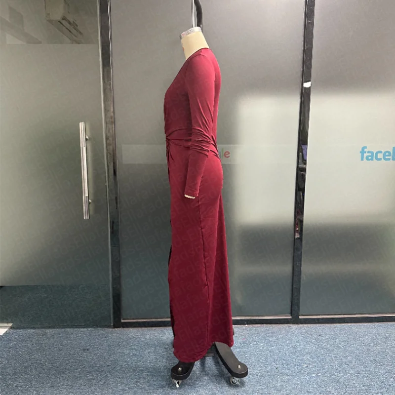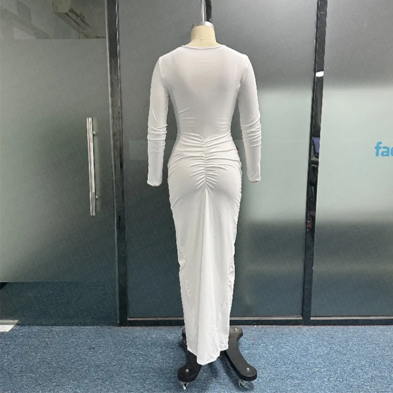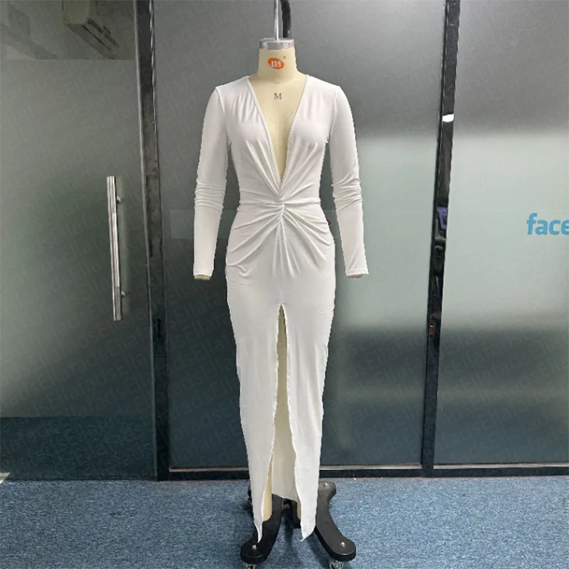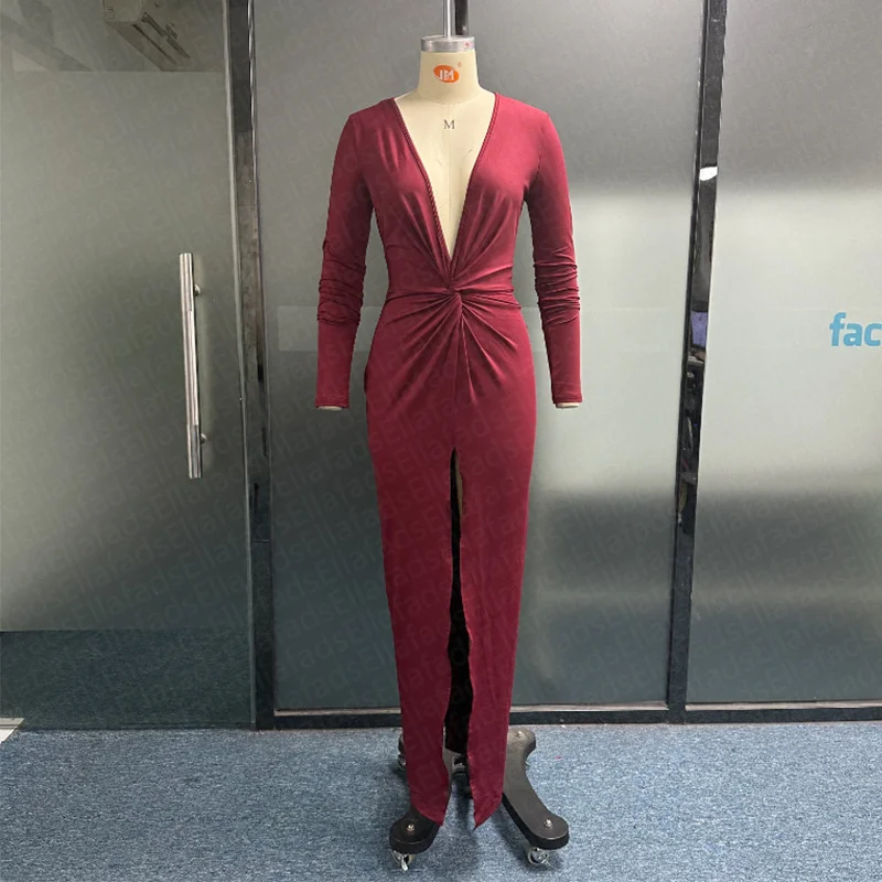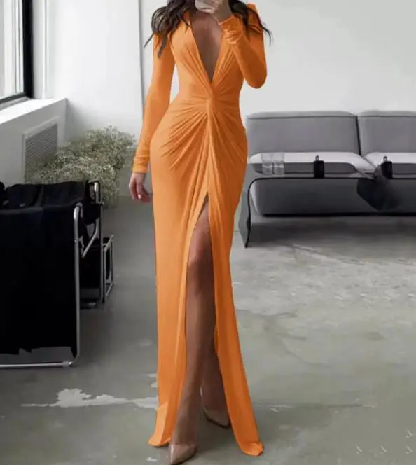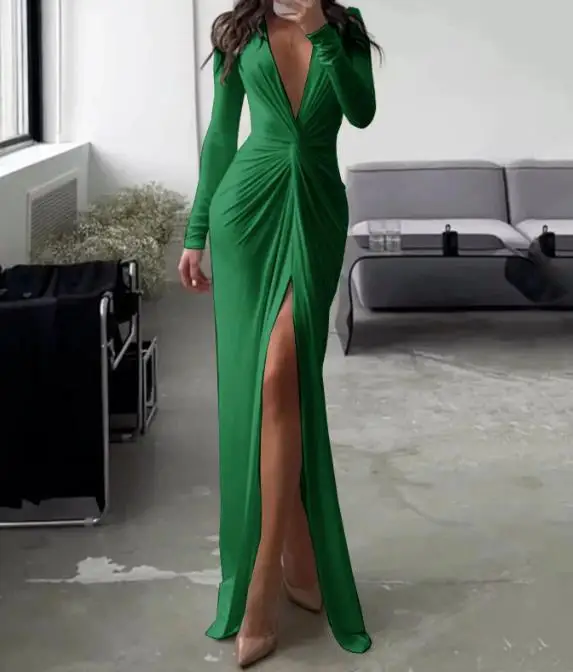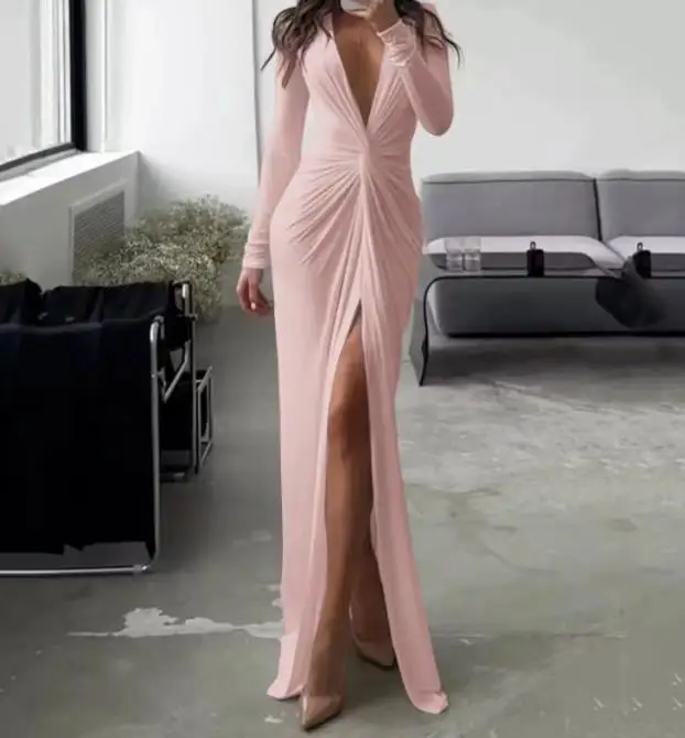 Elegant and Pretty Women's Dress 2024 V-Neck Long Sleeve Solid Slim Pleated Dress Pleated Slit Long Sleeve Date Party Dress