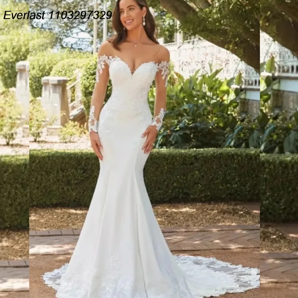 EVLAST Vestido de novia elegante de sirena 2025 Vestido de novia con escote en forma de corazón y manga larga con apliques de encaje y flores en 3D TMD06