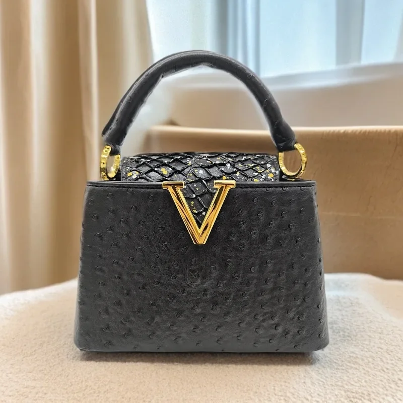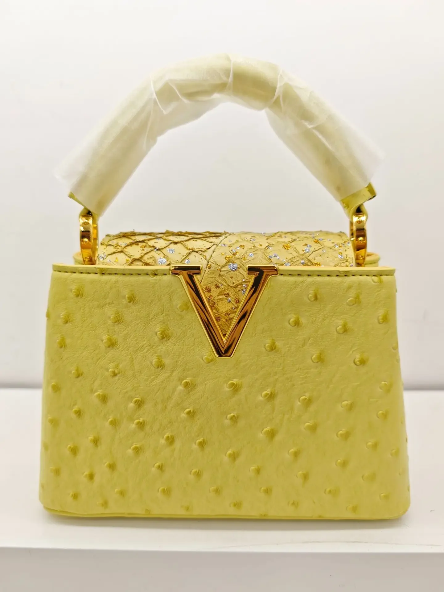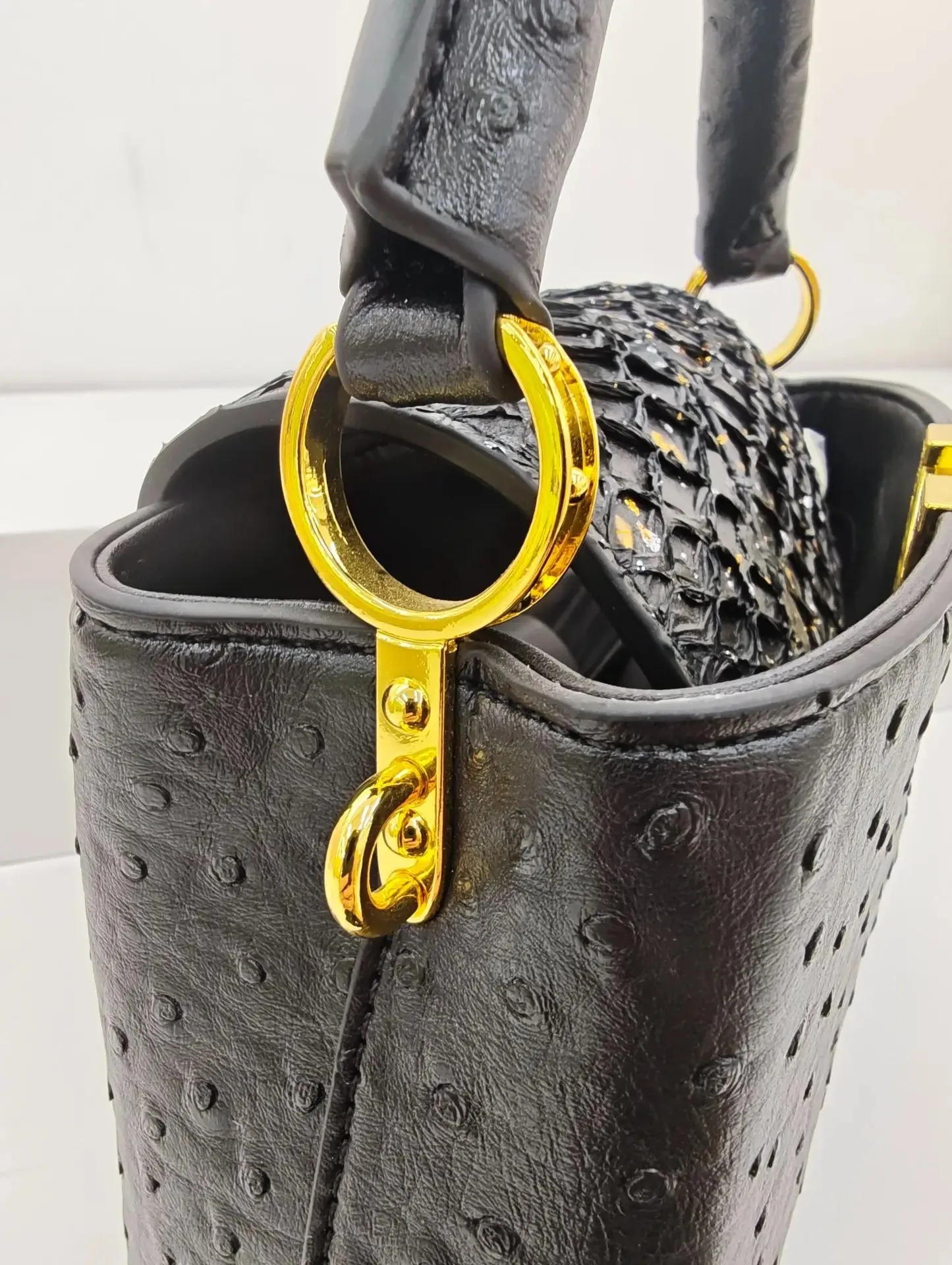 Fashionable High-End Leather Ostrich Pattern Handbag Shoulder Bag Crossbody Bag Women's Bag Vintage Style Bucket Shape