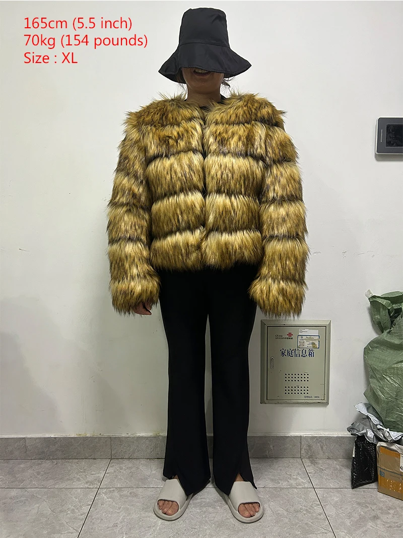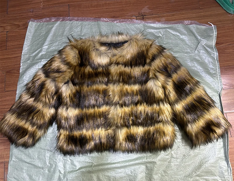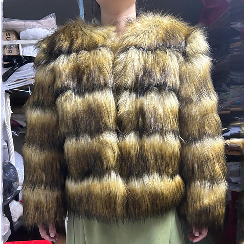 High Quality Cropped Faux Raccoon Fur Coat Women Winter Fashion O Neck Long Sleeve Fluffy Short Faux Fur Jacket Crop Top Outwear