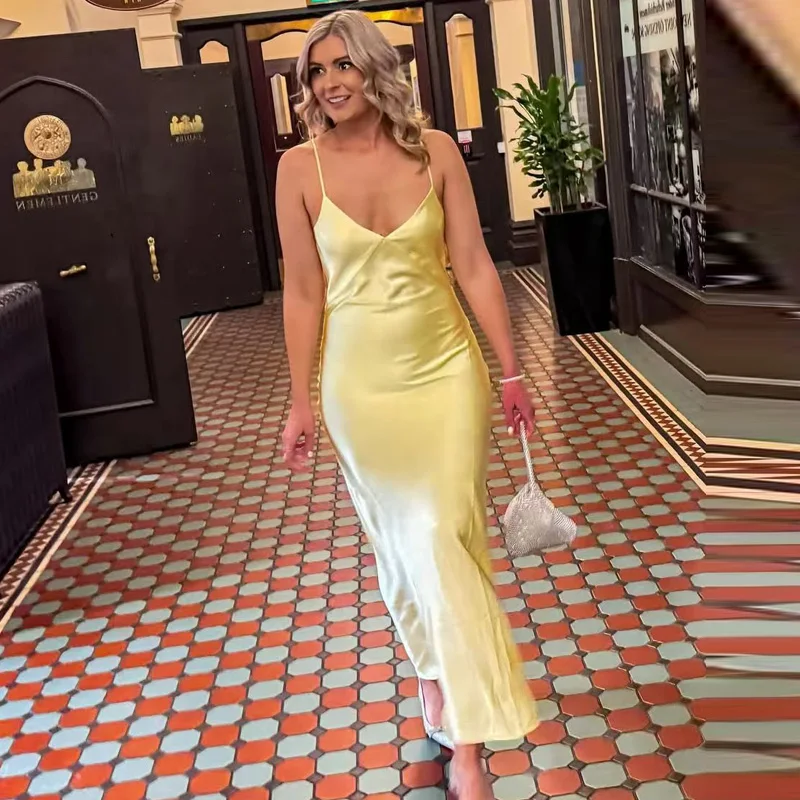 HXAO Womens Yellow Slip Dress Summer 2025 Woman Satin V-Neck Party Dresses Elegant Evening Sleeveless Backless Long Vestidos 066