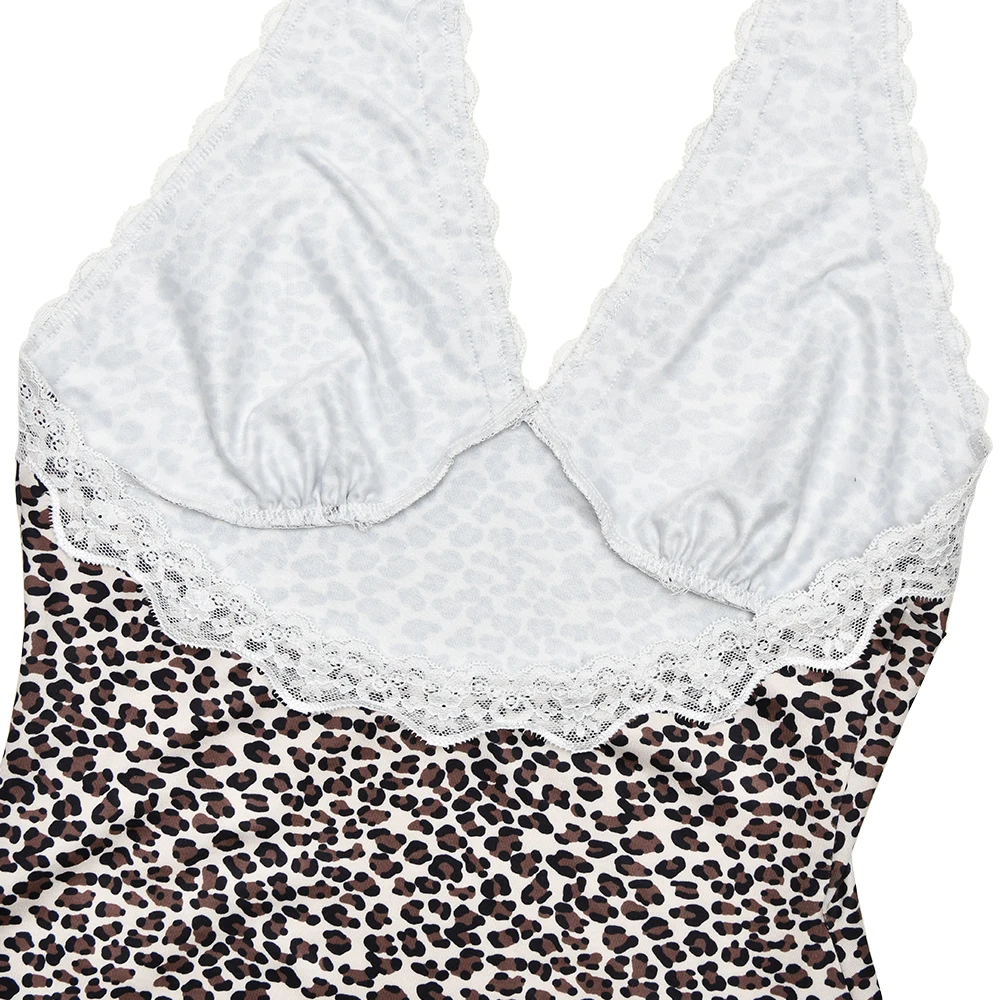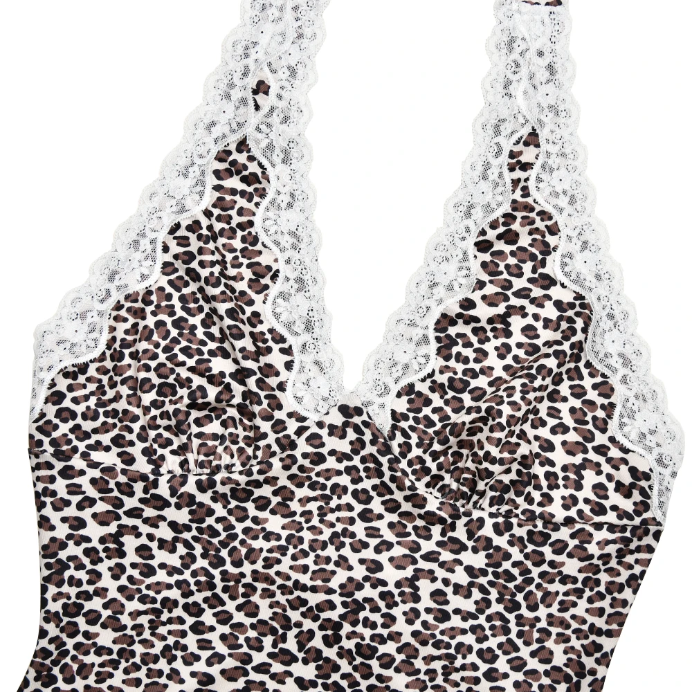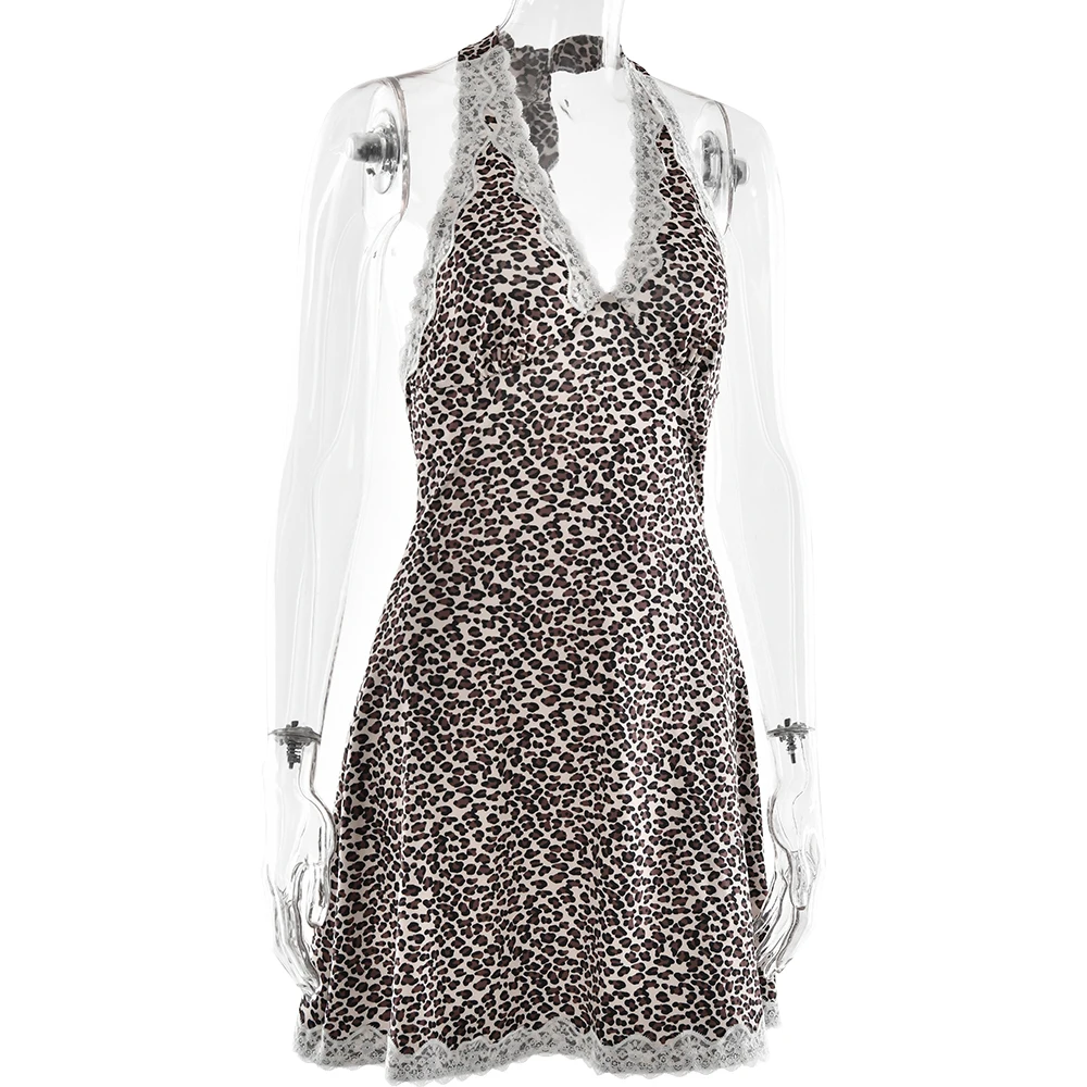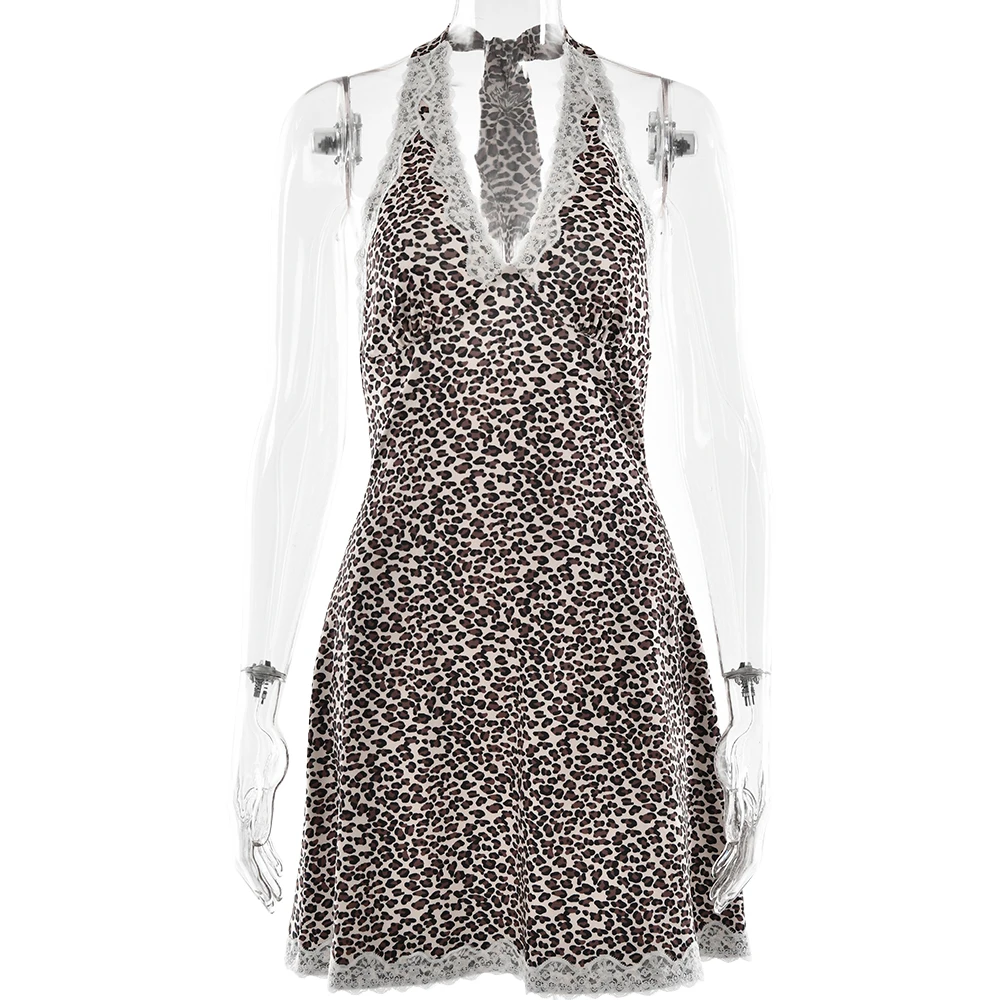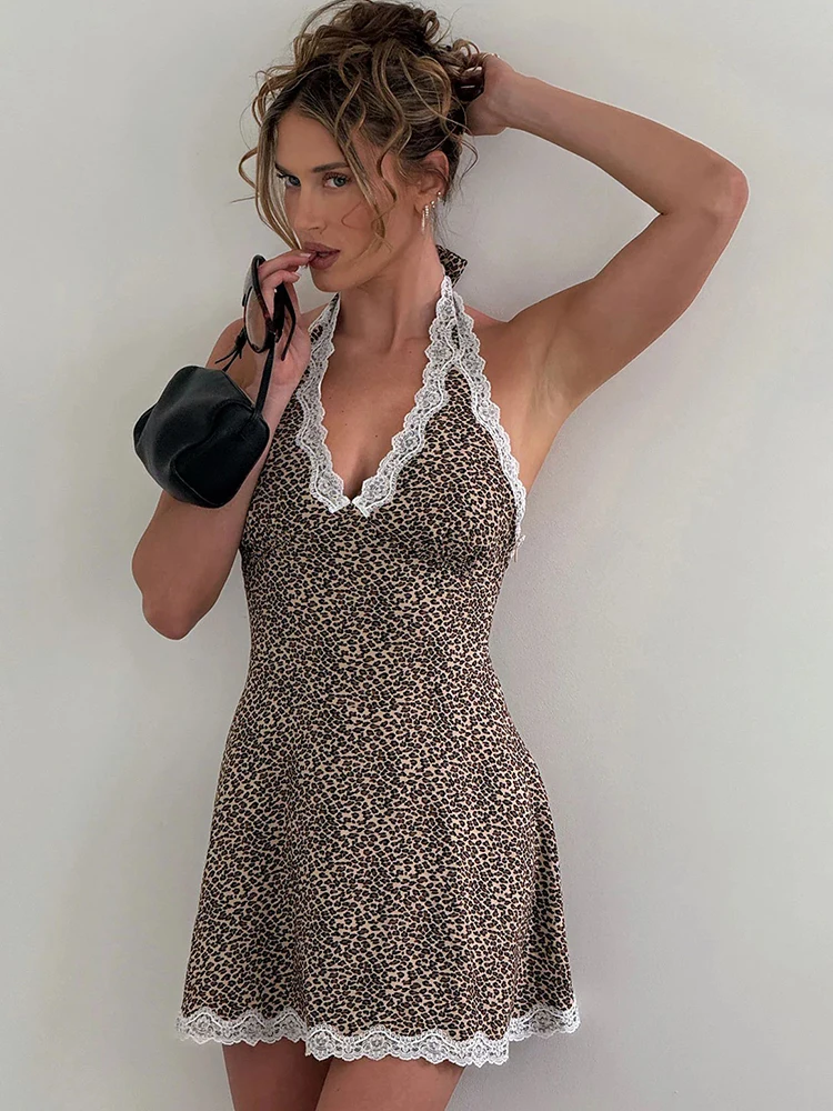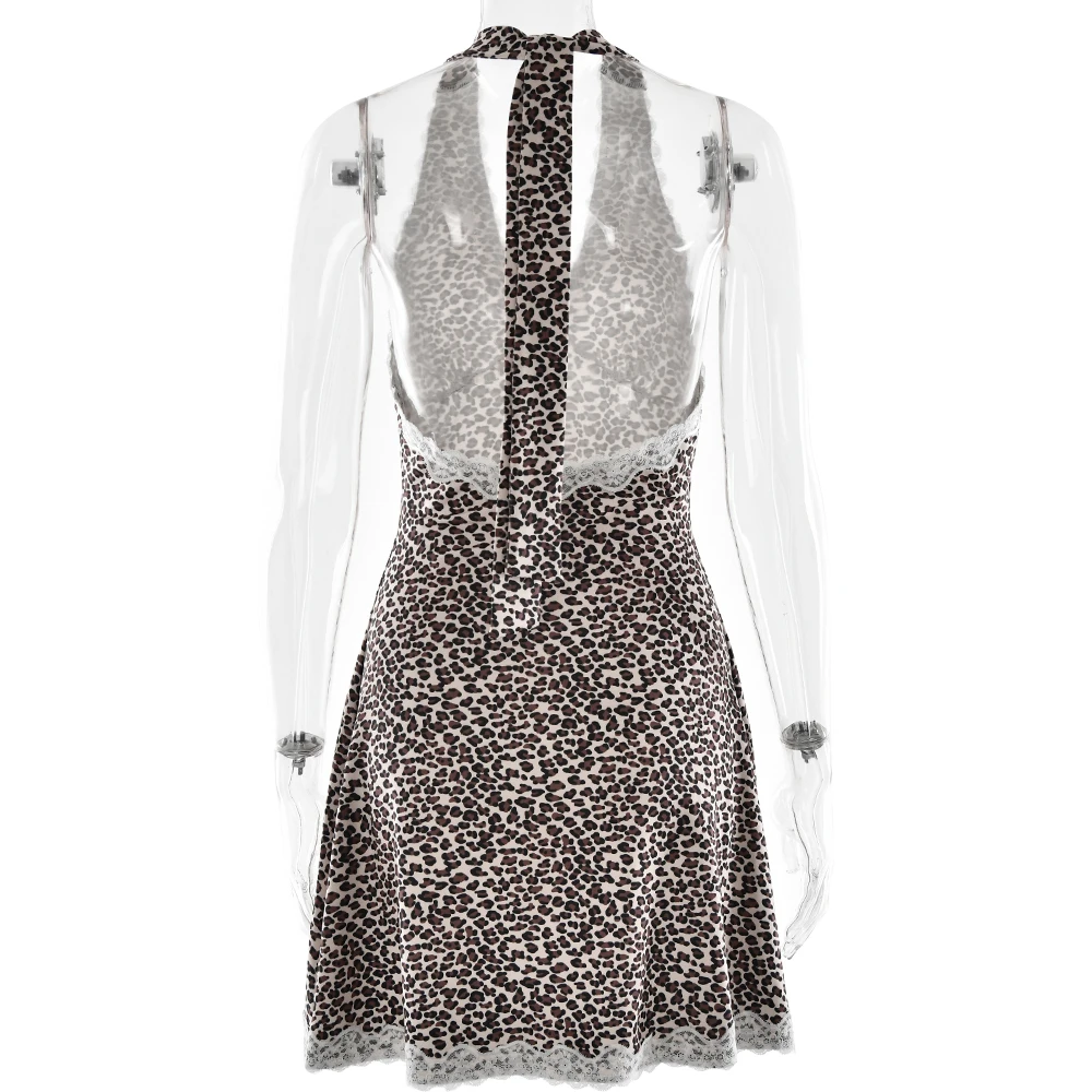 JULISSA MO Patchwork Sexy Backless Print Leopard Lace Women Dress High Waist Halter Dress Spring Skinny Elegant Party Beachwear