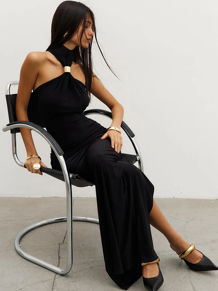 JULISSA MO Turtleneck High Slit Metal Ring Women Maxi Dress Black Sleeveless High Waist Dress Summer Slim Elegant Party Clubwear