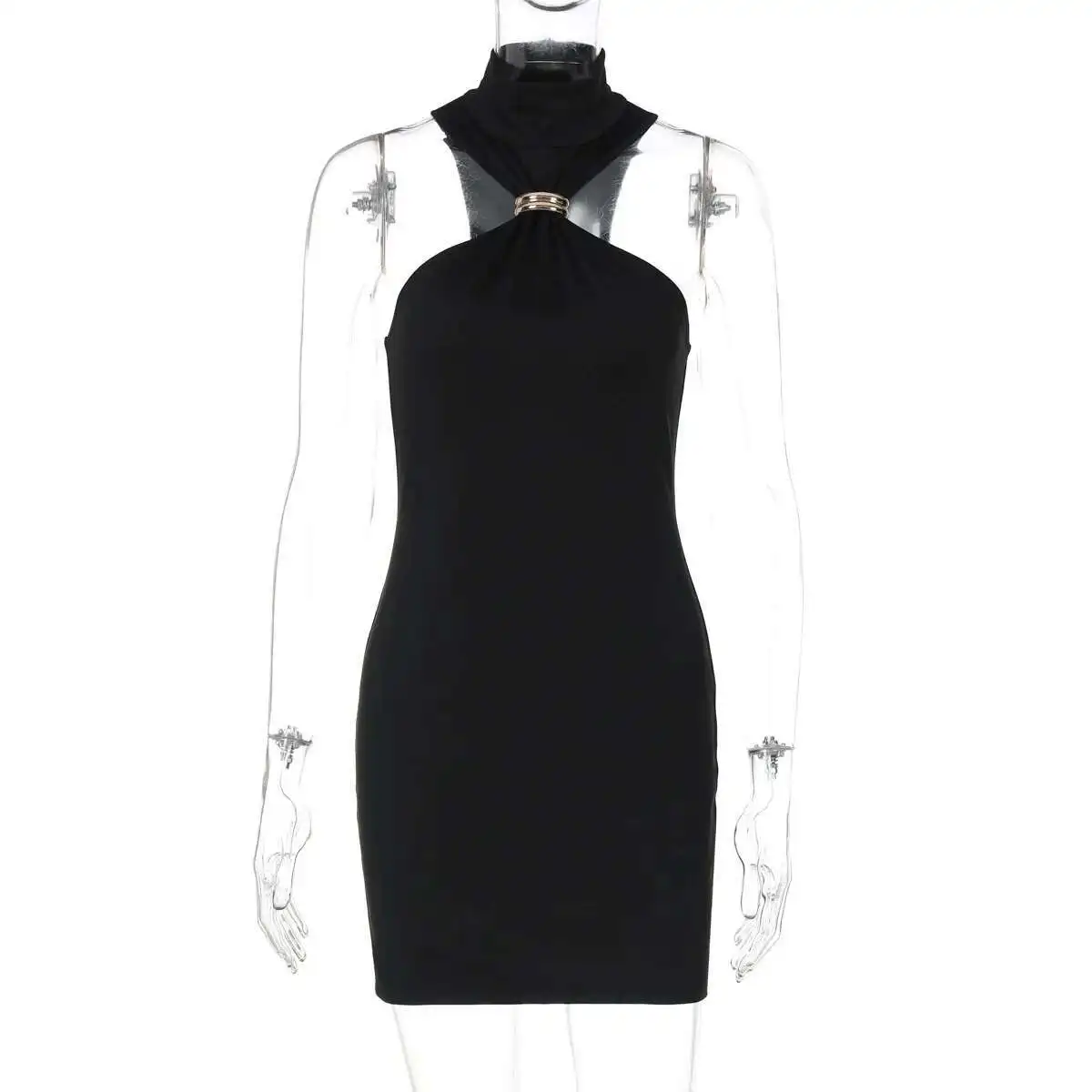 JULISSA MO Turtleneck Sleeveless Metal Rings Women Dress Black High Waist Mini Dress Female Summer Slim Elegant Party Club Dress
