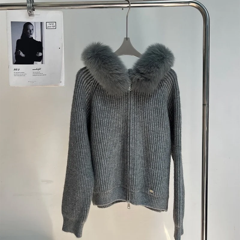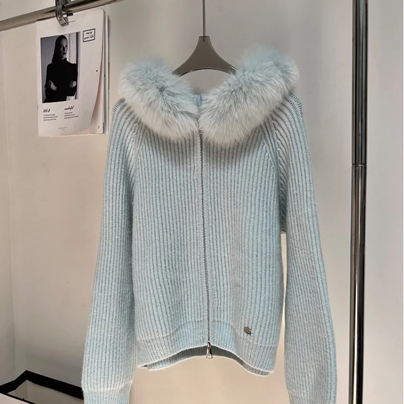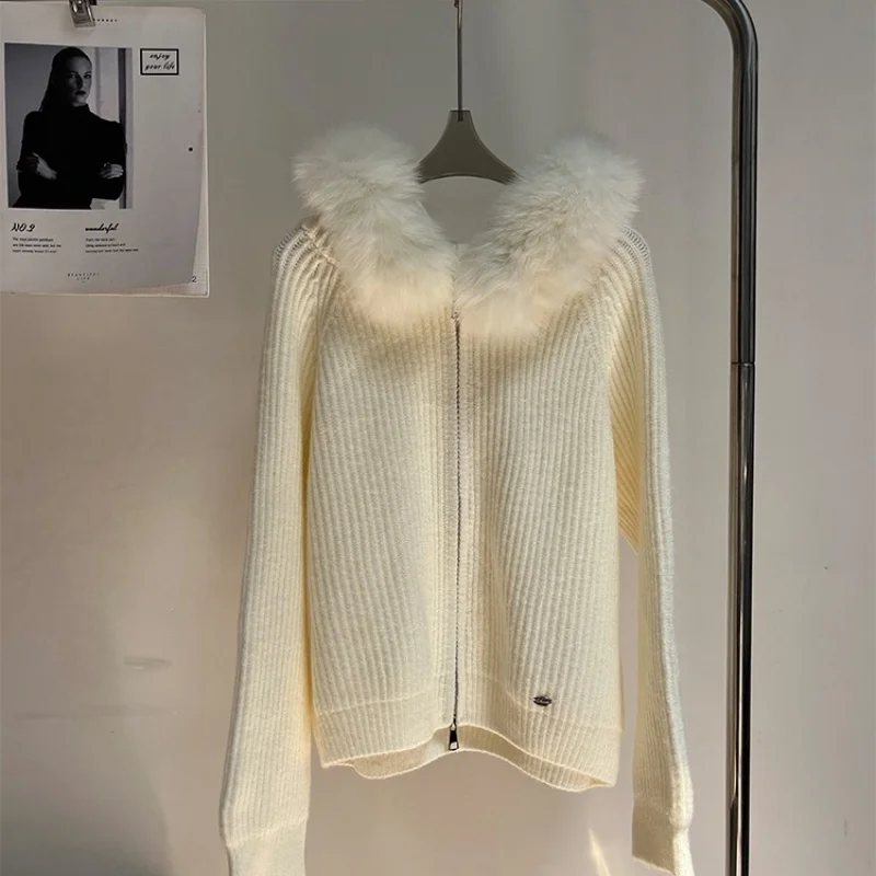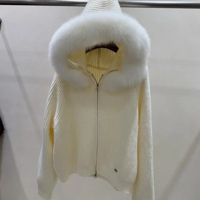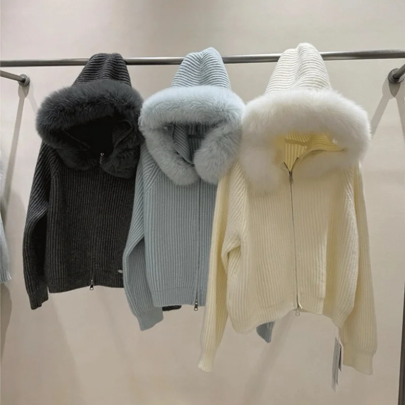 Korean Fashion Cashmere Thick Knit Coat Women Autumn Winter New Long Sleeve Sweater Zipper Jacket Hooded Outwear