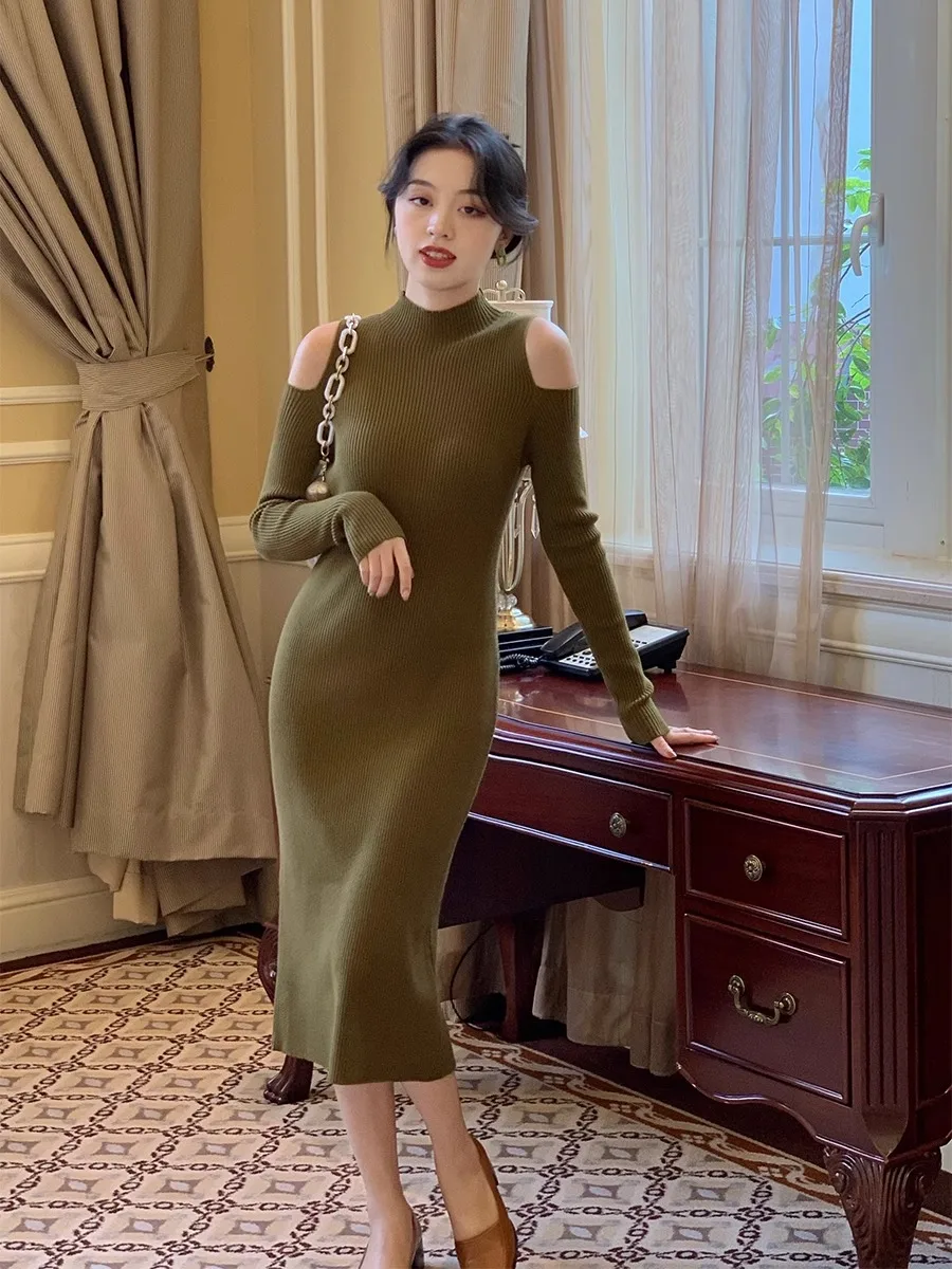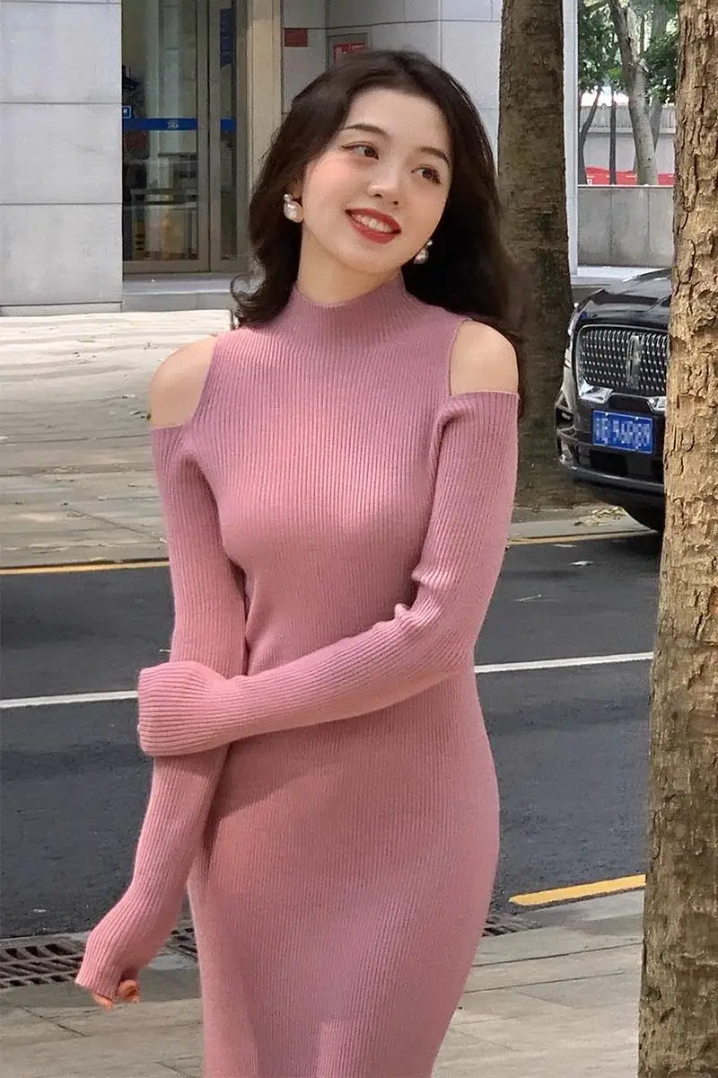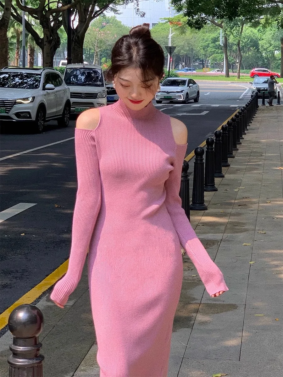 Korean Style Female Shoulderless Knitted Dress Solid Color Sexy Lady Long Sleeve Turtleneck Woman Inner Dress Slim Sweater Dress