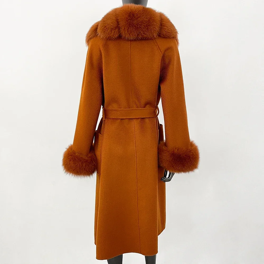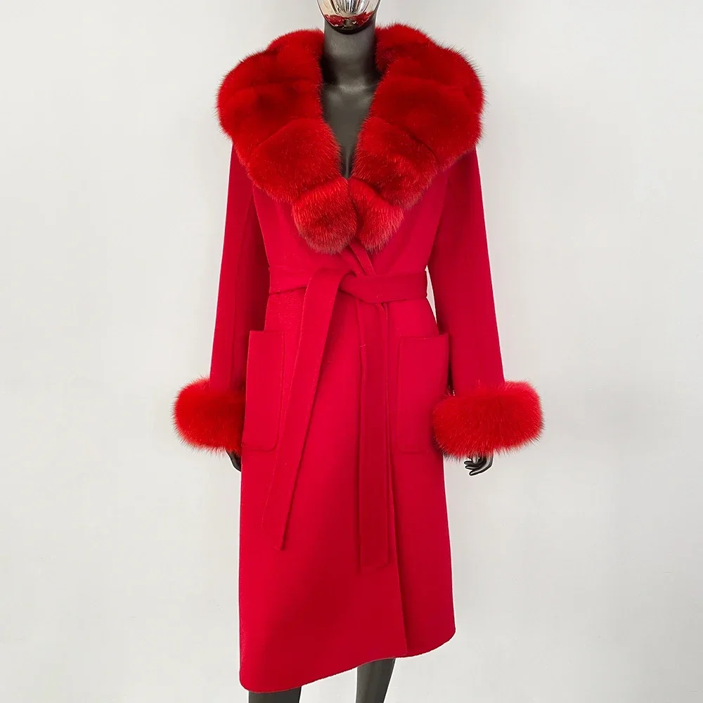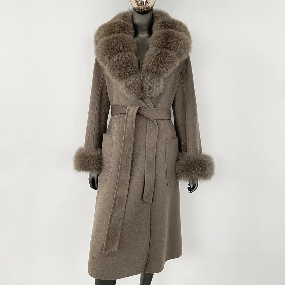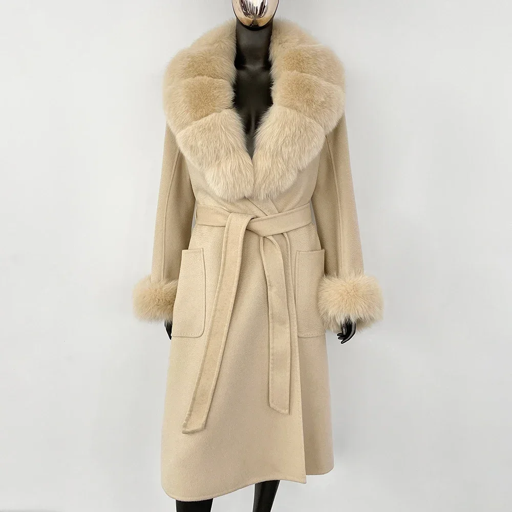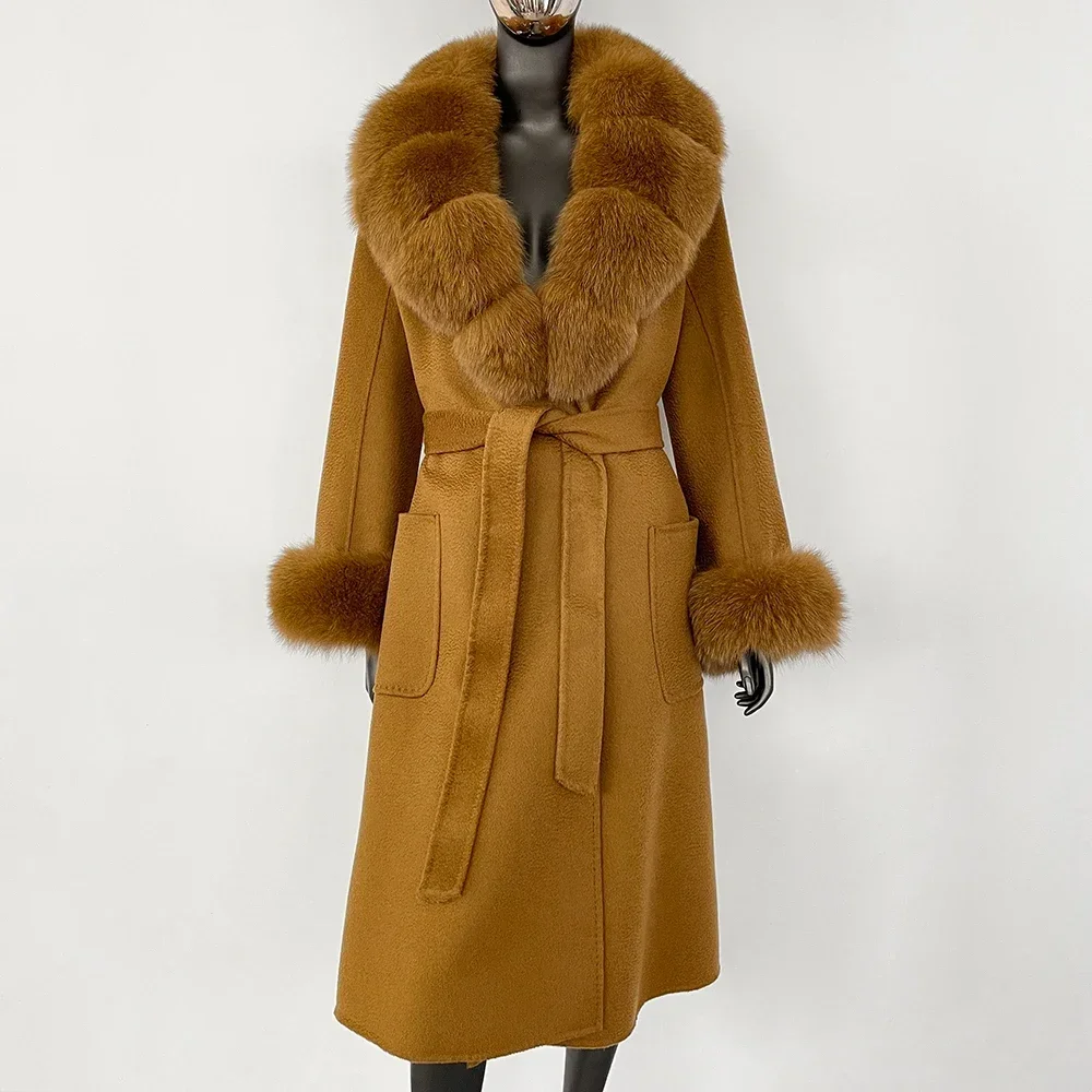 Long Loose Fashion Casual Natural Fox Fur Collar Women Autumn Winter Woolen Jacket Female Belt Warm Wool Women Real Fur Coat