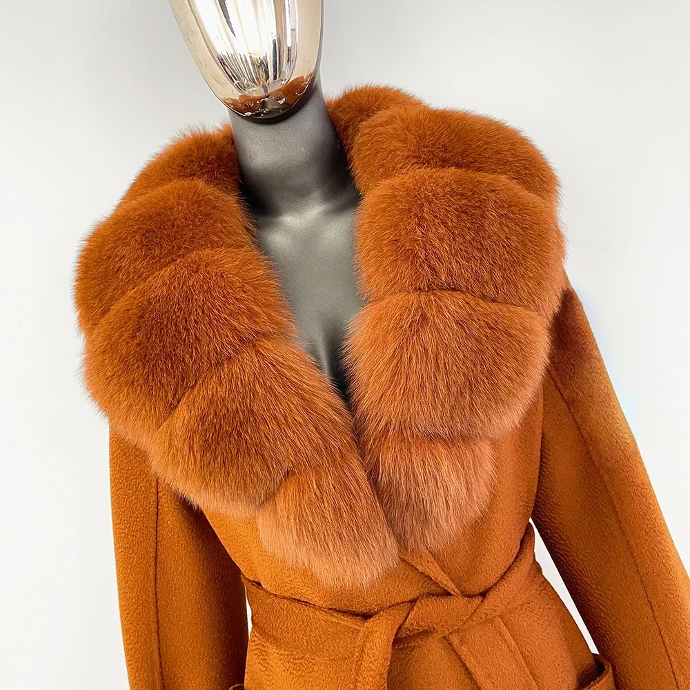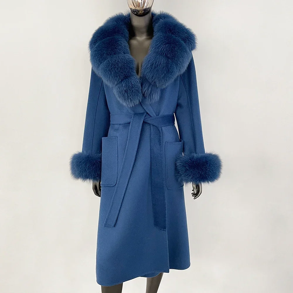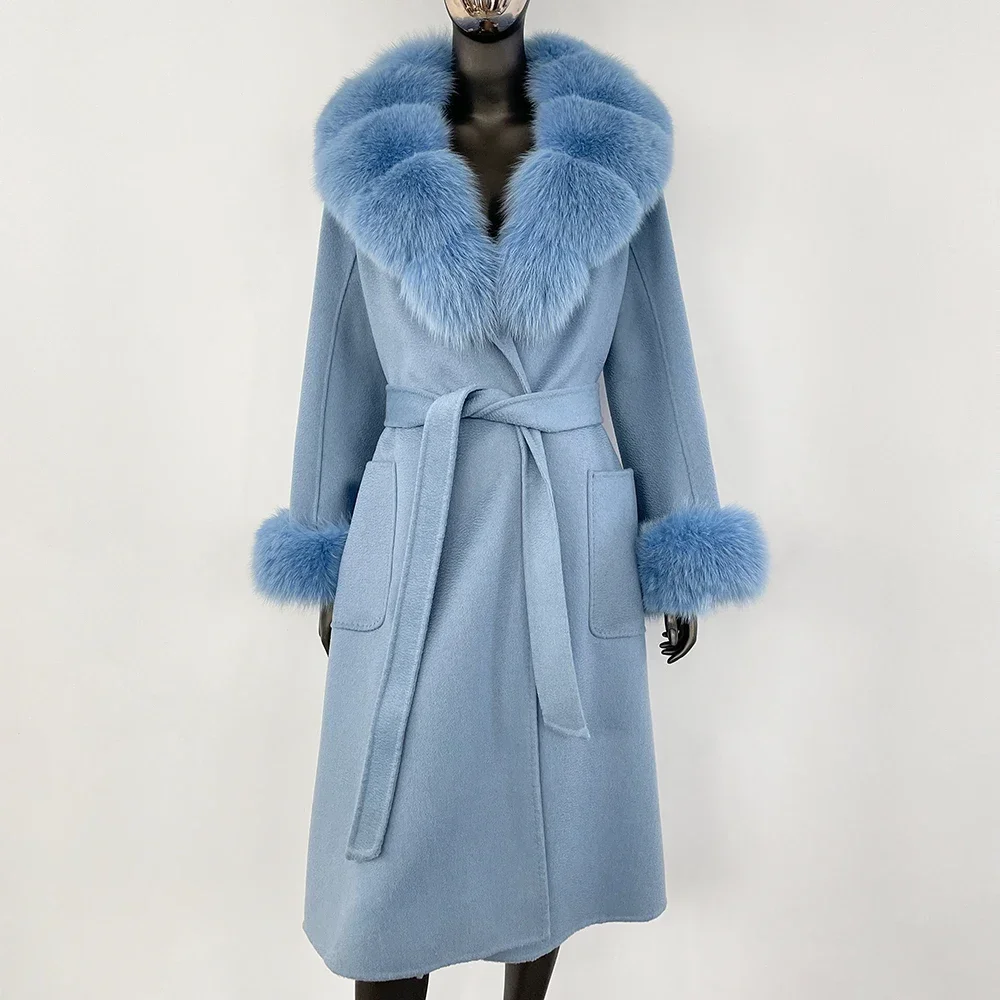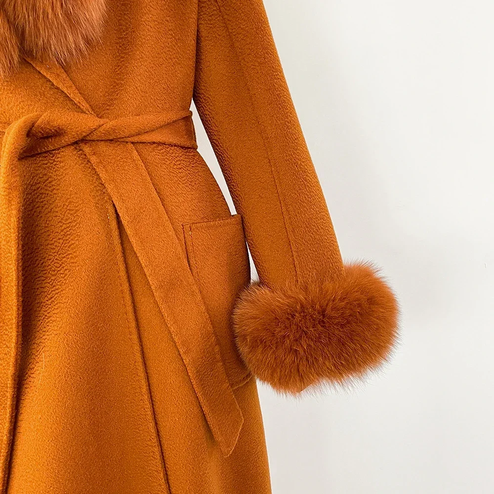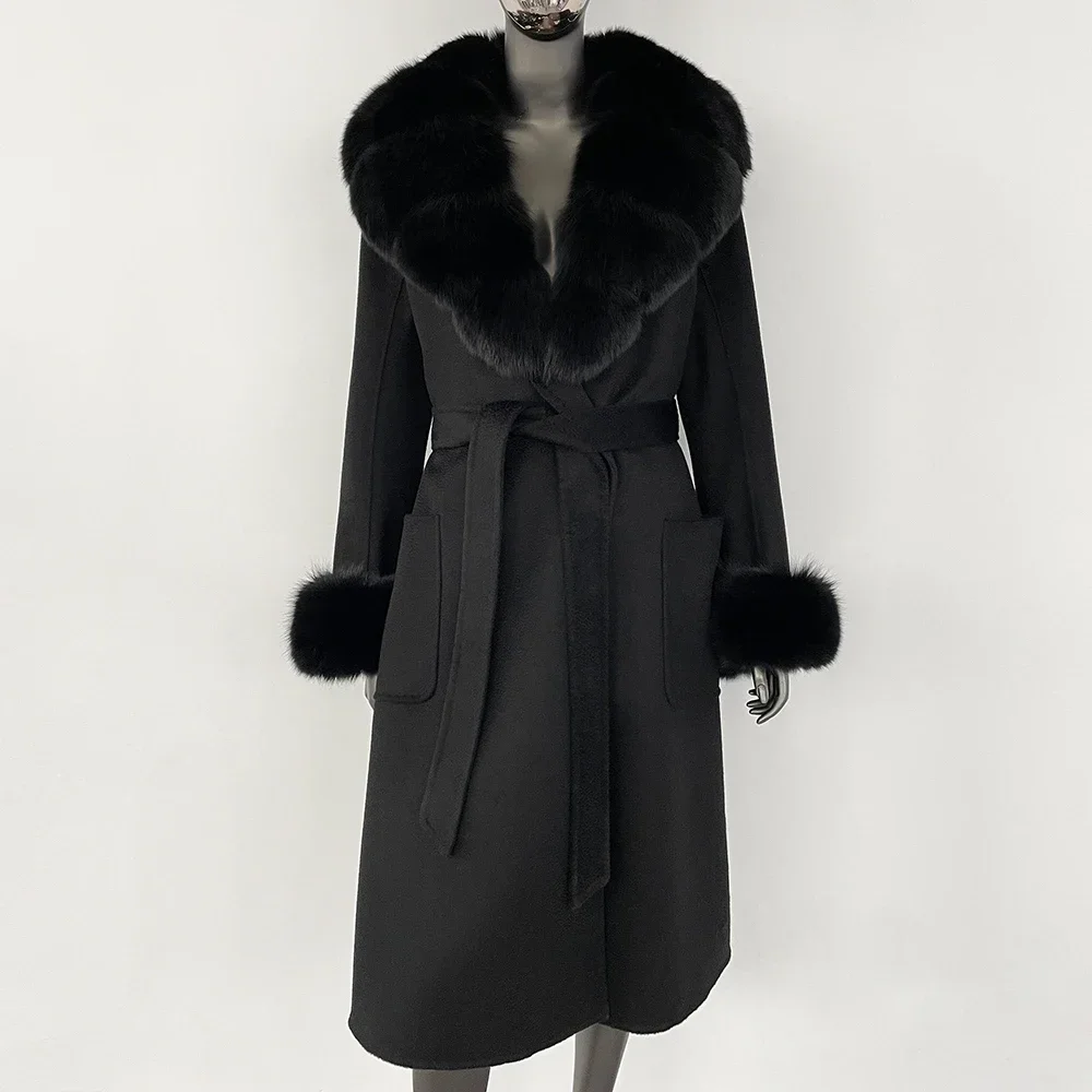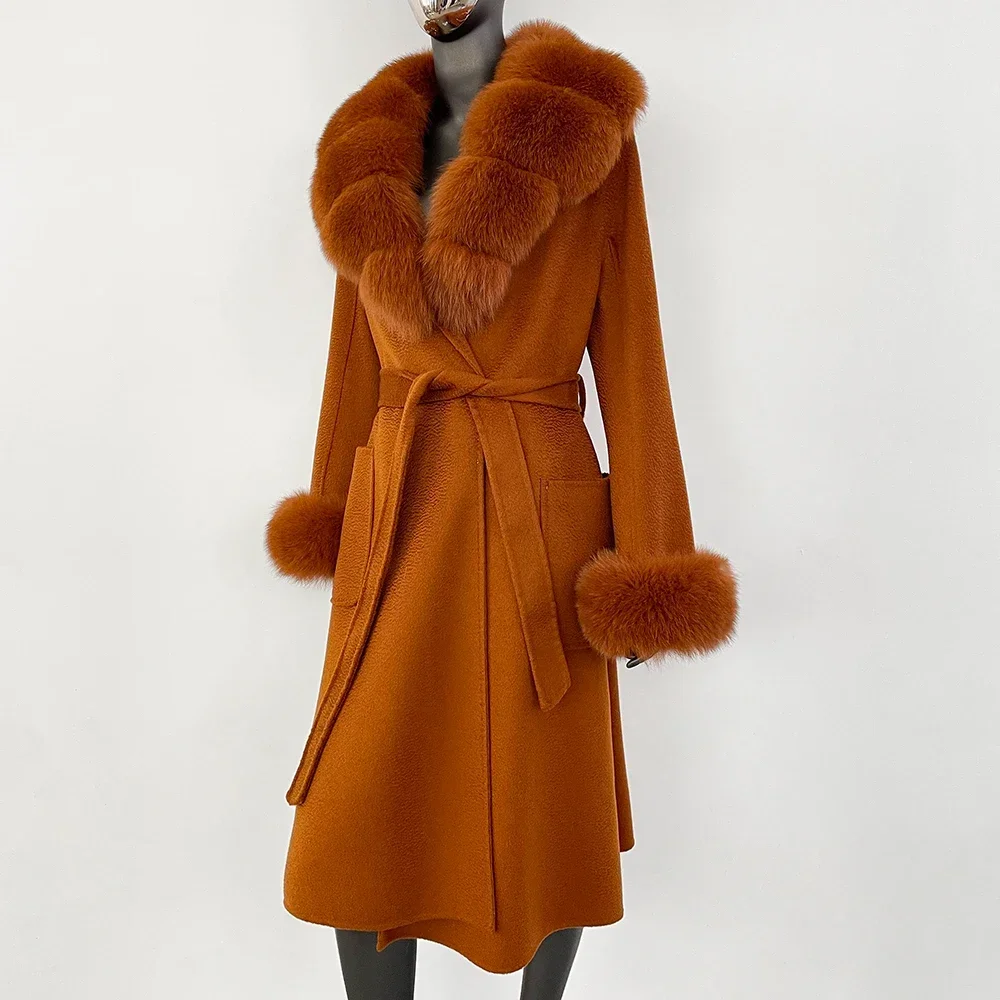 Long Loose Fashion Casual Natural Fox Fur Collar Women Autumn Winter Woolen Jacket Female Belt Warm Wool Women Real Fur Coat