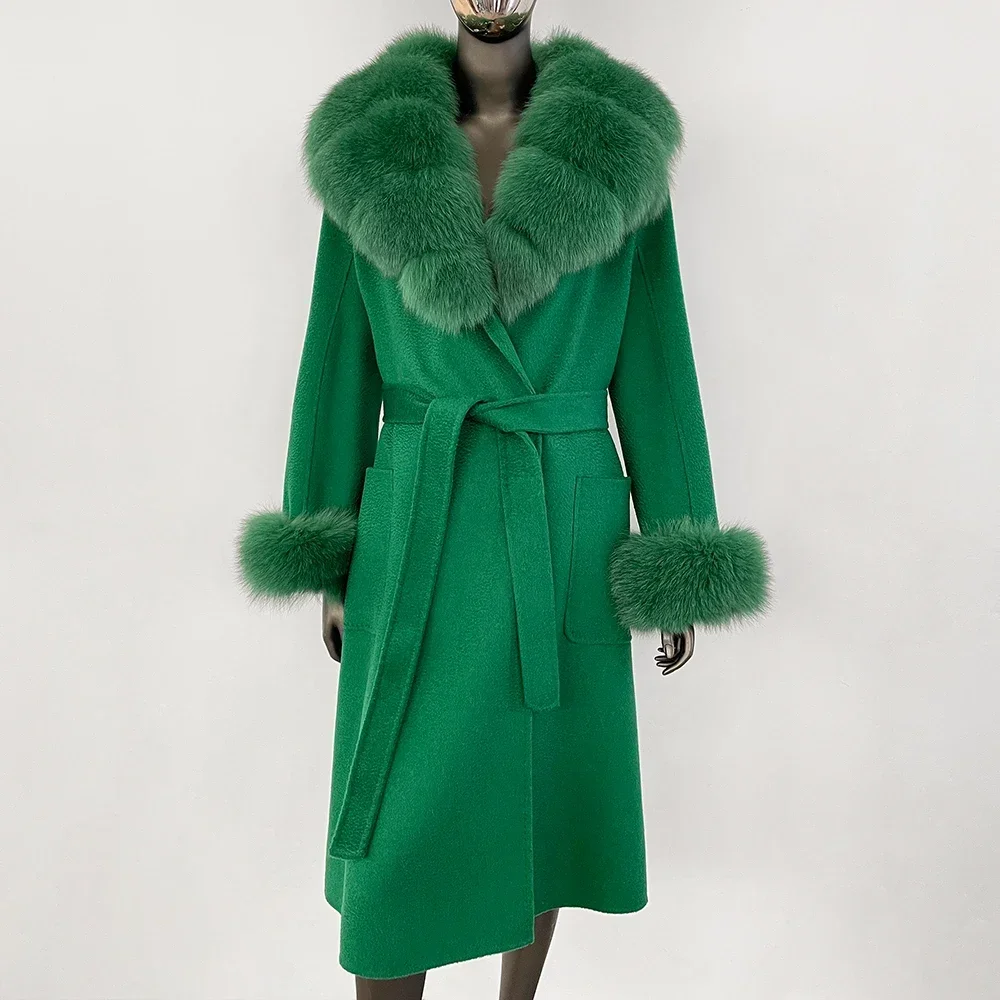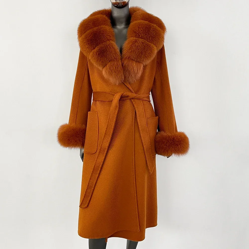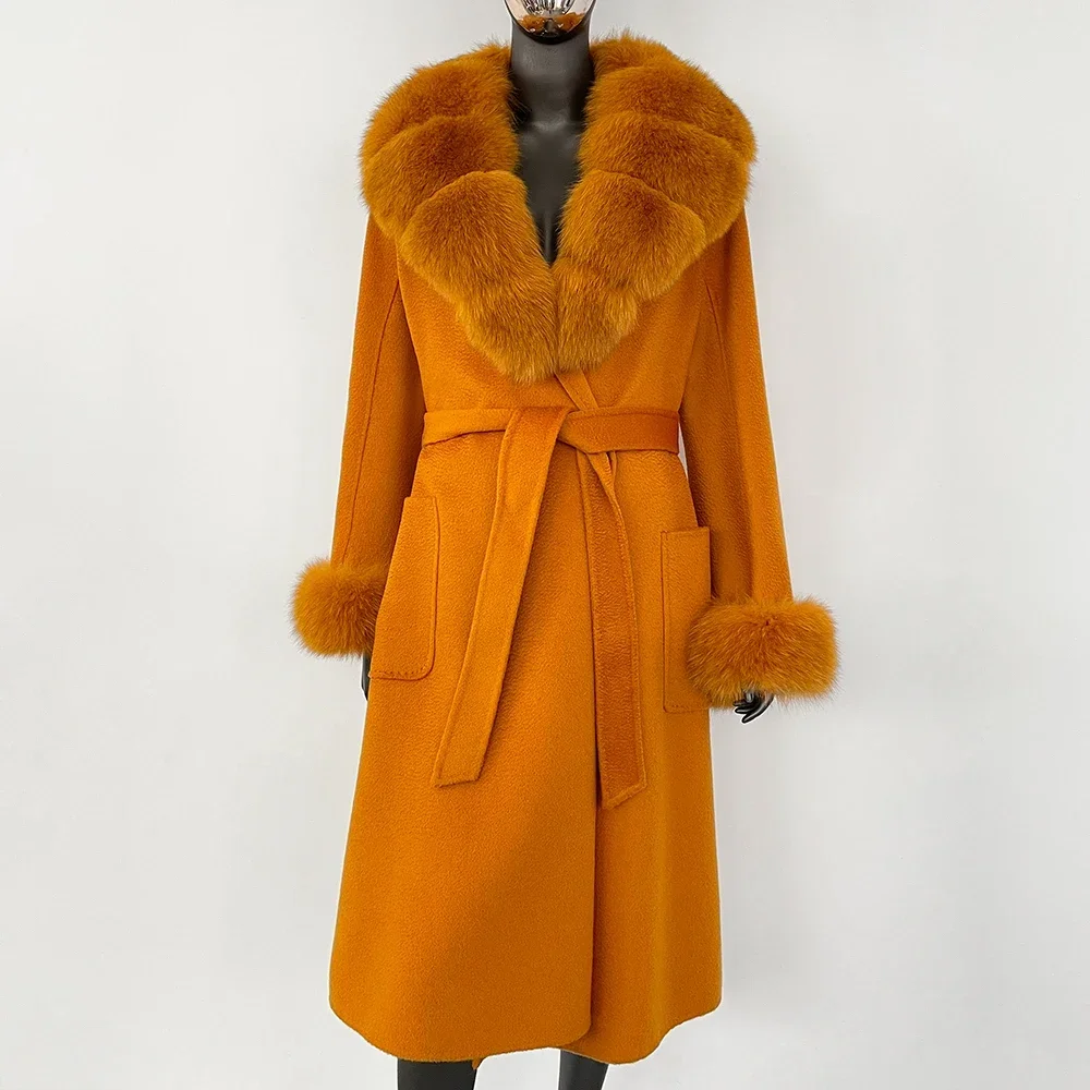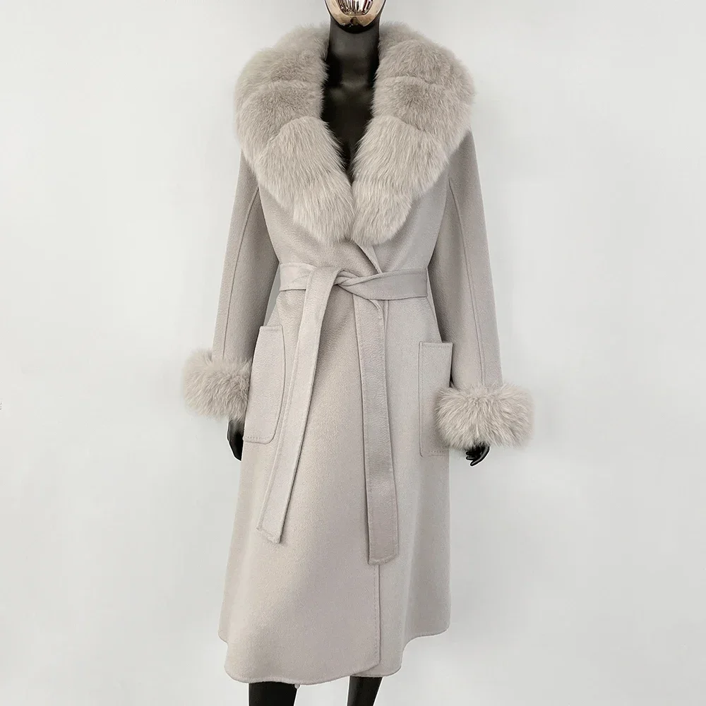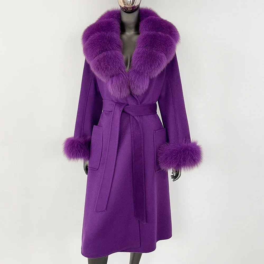 Long Loose Fashion Casual Natural Fox Fur Collar Women Autumn Winter Woolen Jacket Female Belt Warm Wool Women Real Fur Coat