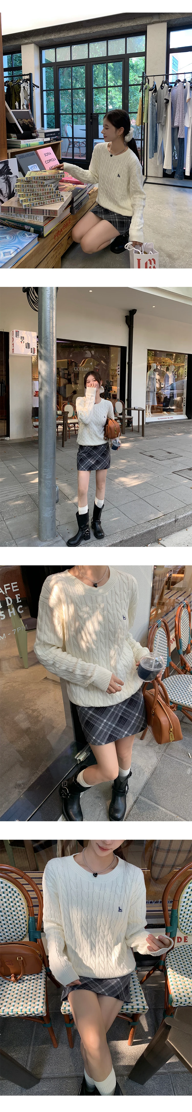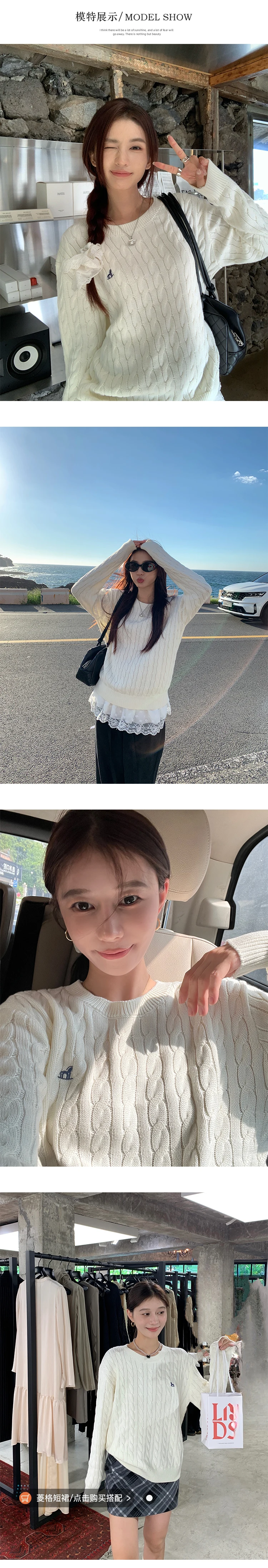 Loose Women's Knitted Sweater Miu Intellectual Series Twisted Knit Cotton Crew Neck Full Sleeve Soft Embroidered Top