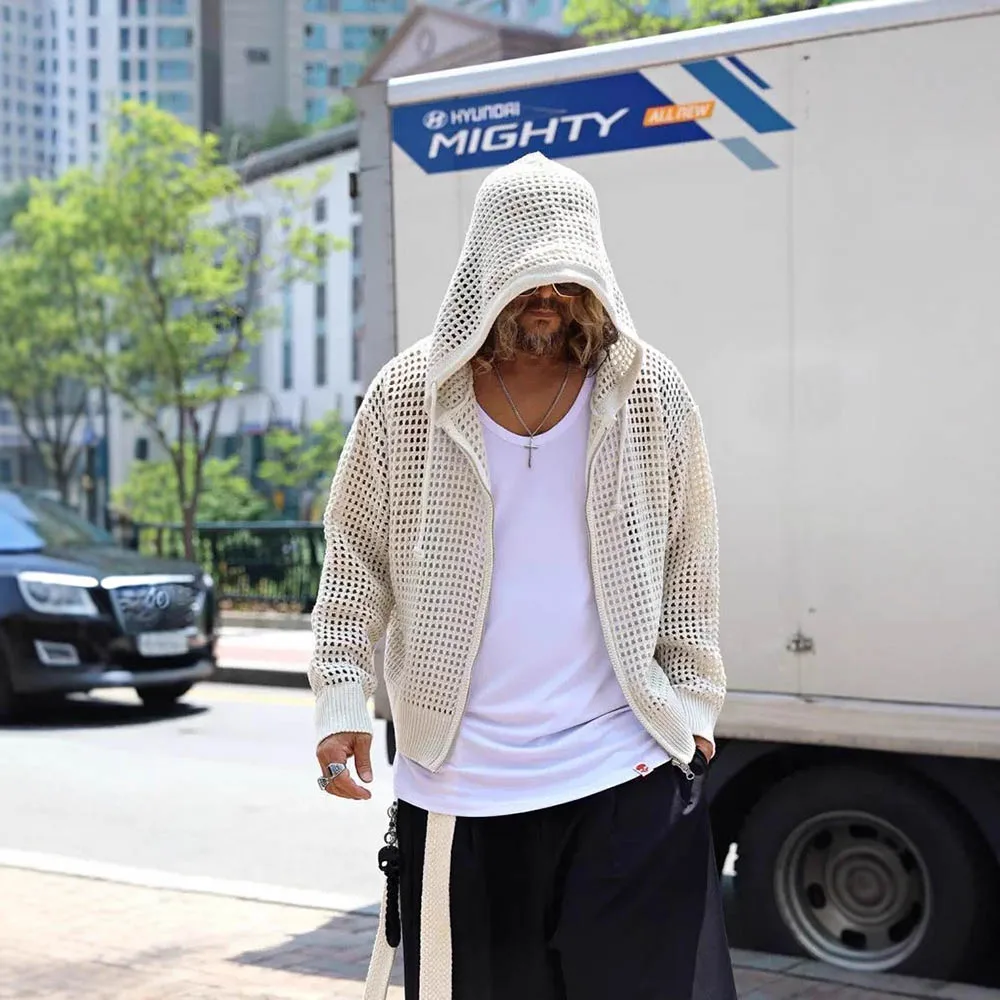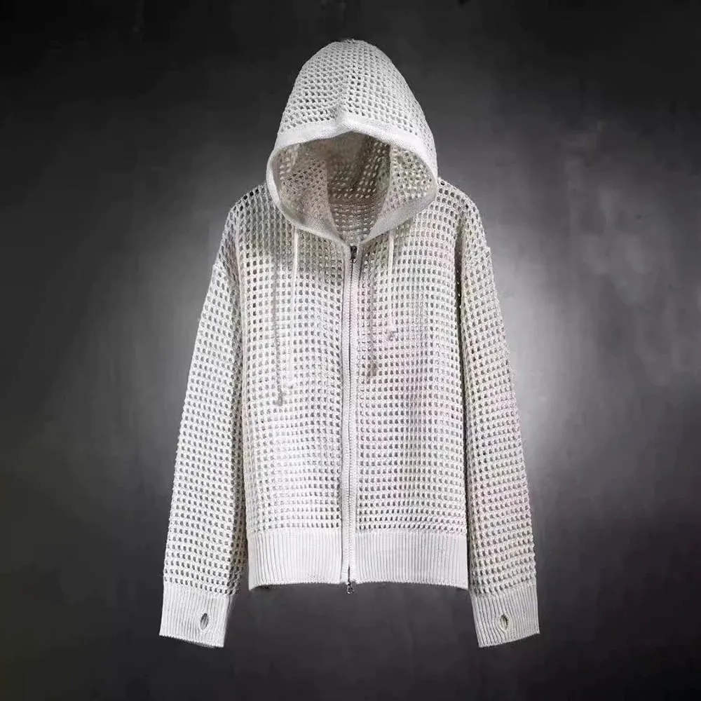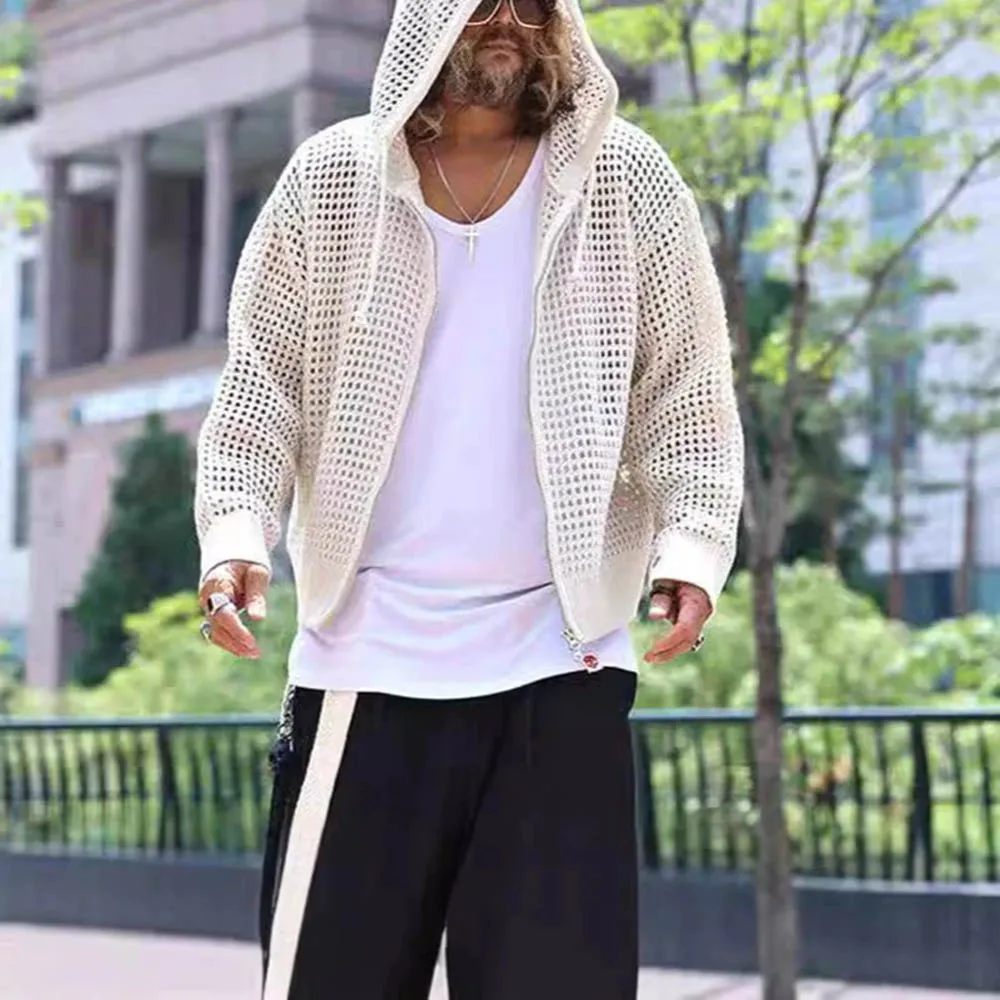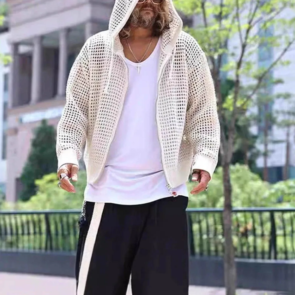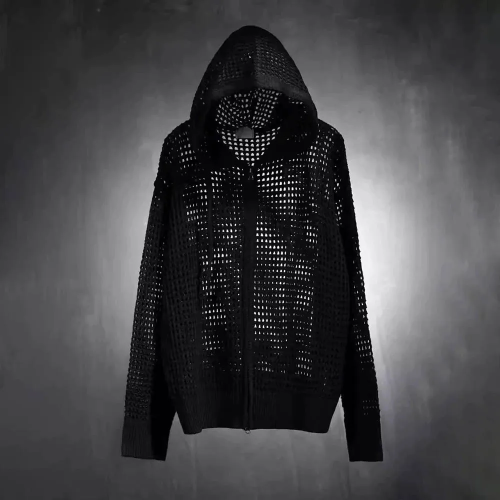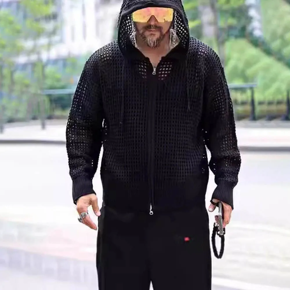 Men's Hooded Hollow Long-Sleeved Jacket American Retro Fashion Trend Loose Breathable Niche Spring And Autumn New Men's Tops