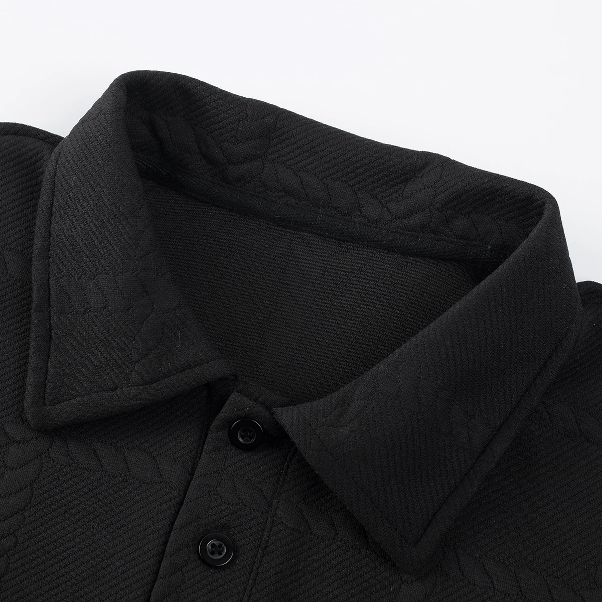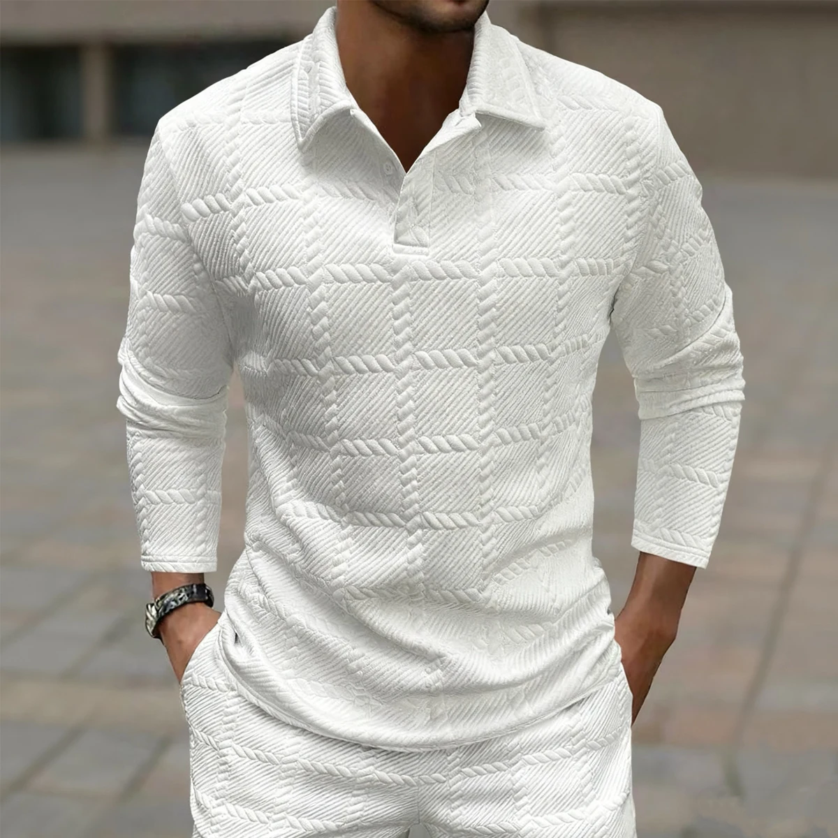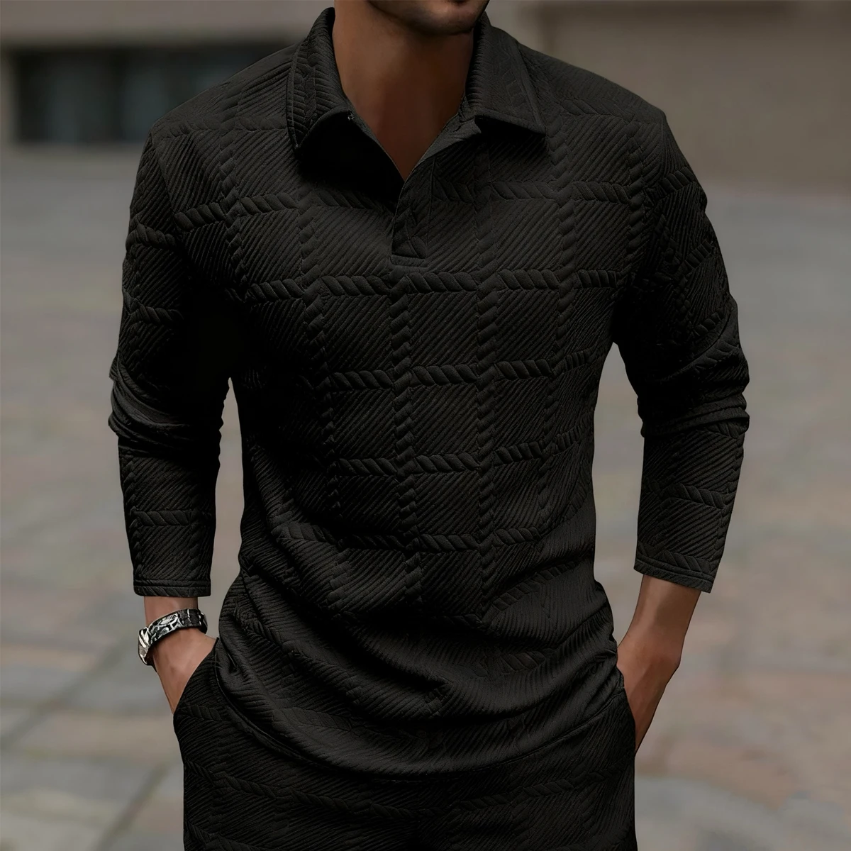 Men's Long Sleeve Textured Polo Shirt & Pants Set: Knitted Pattern Outfit for Smart Casual Style