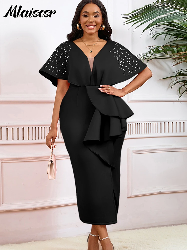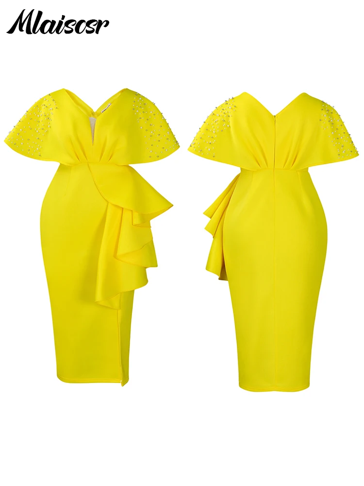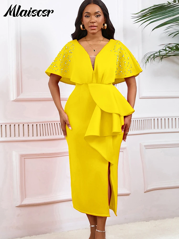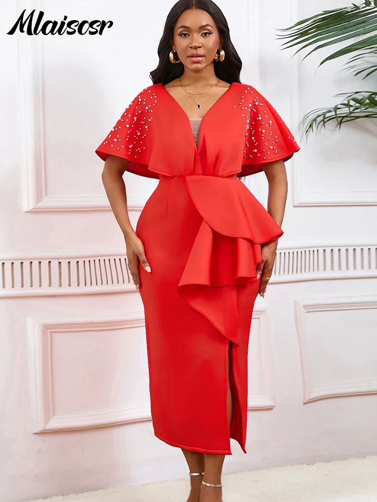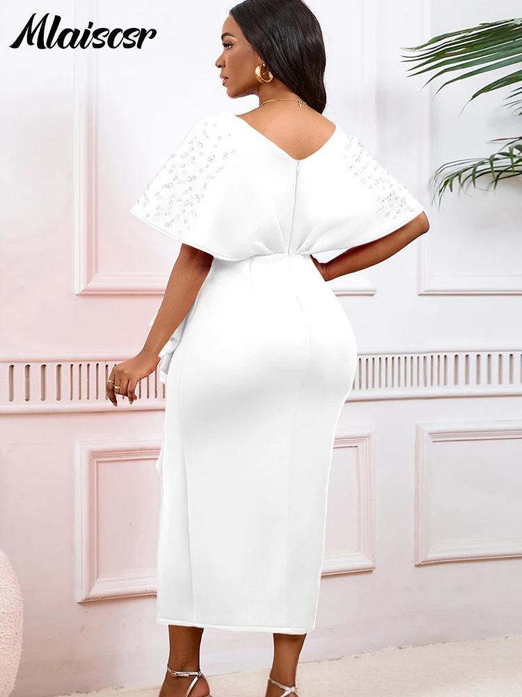 Mlaiscsr Elegant V Neck Beading Ruffles Slit Wedding Guest White Dress Women Luxury Formal Birthday Party Evening Celebrate Gown