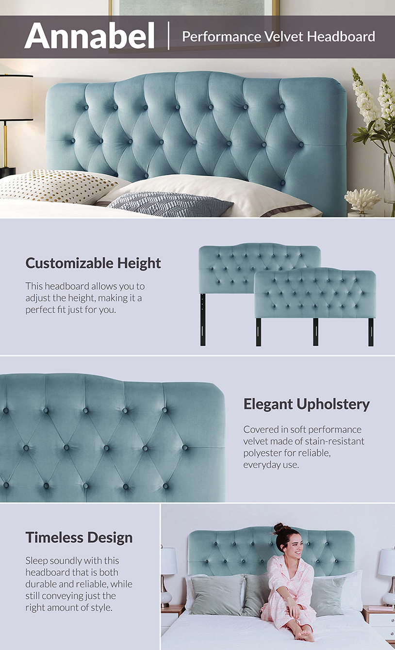 Follow the gentle curves and winsome style of the Annabel Diamond Tufted Performance Velvet Queen Headboard. Annabel features elegant diamond tufting within a slightly curved silhouette for plush vintage glamour and ageless charm. A delightful focal point for any master suite or guest room, this upholstered velvet headboard for queen bed frames provides a soft, stain-resistant update for luxurious comfort while relaxing, reading, or conversing in bed. Solidly constructed from plywood and fiberboard with dense foam padding, this queen size velvet headboard comes with five mounting positions that are height adjustable from 45" - 52.5".