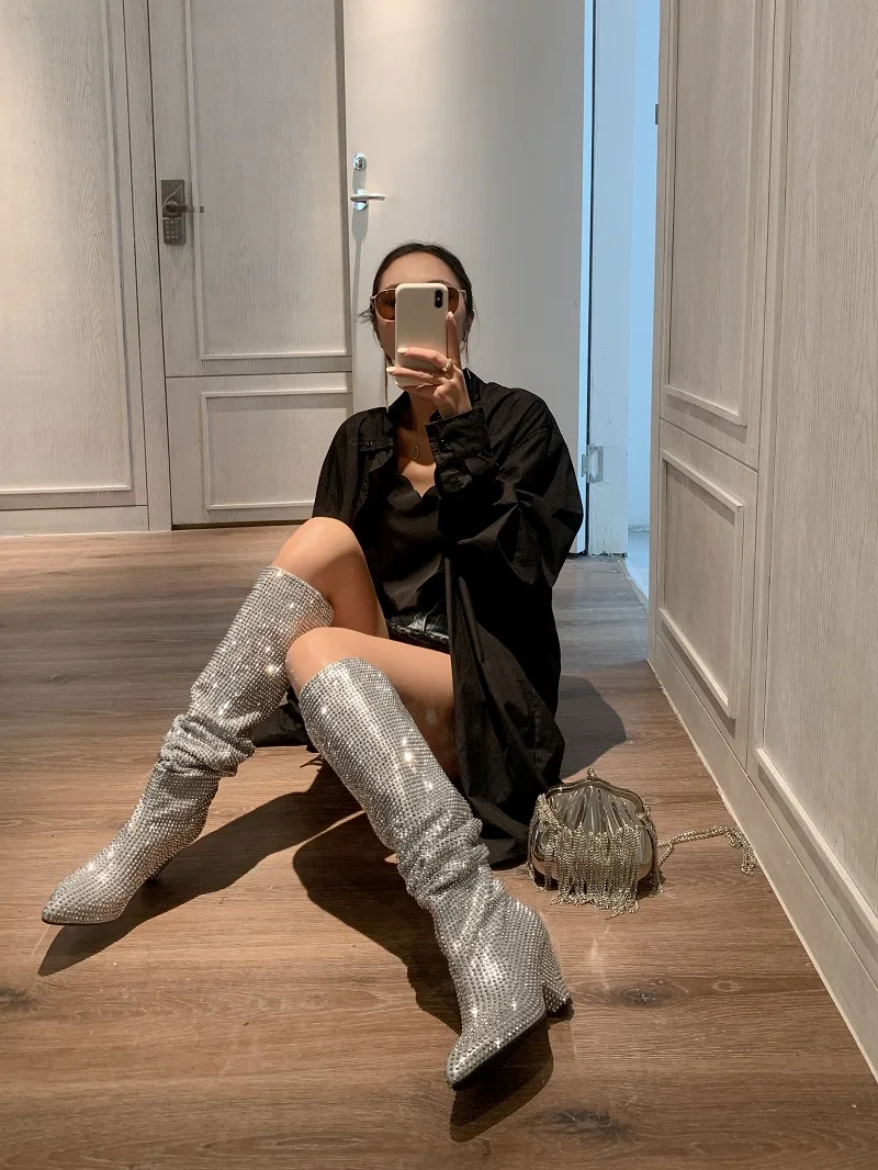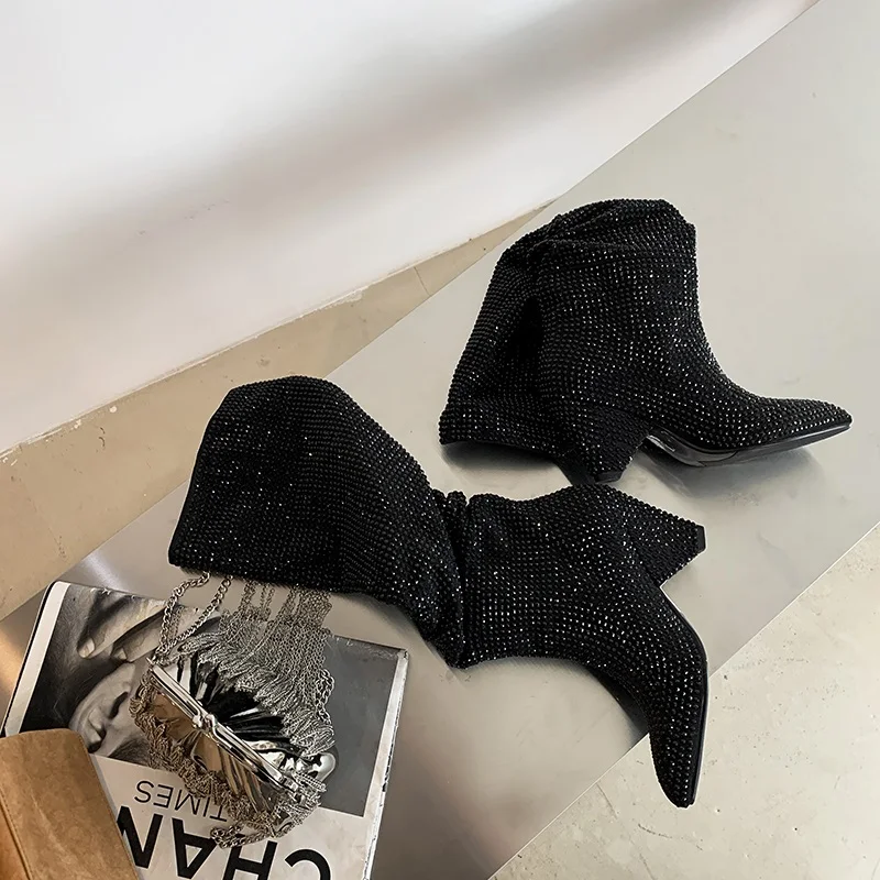 New Crystal Shoes Woman Pointed Toe Mid Calf High Boots Sexy Rhinestone Chunky Spike Heel Boots Ladies Shoes Botas Mujer