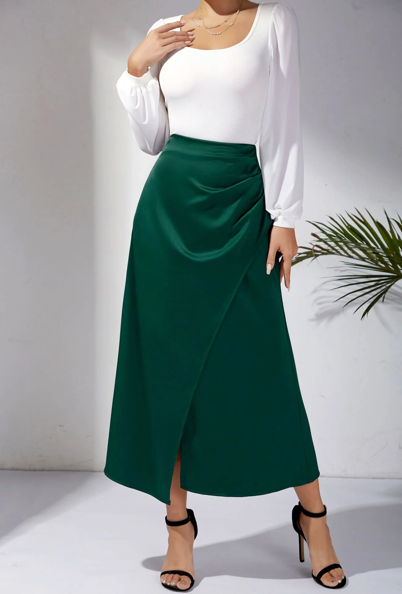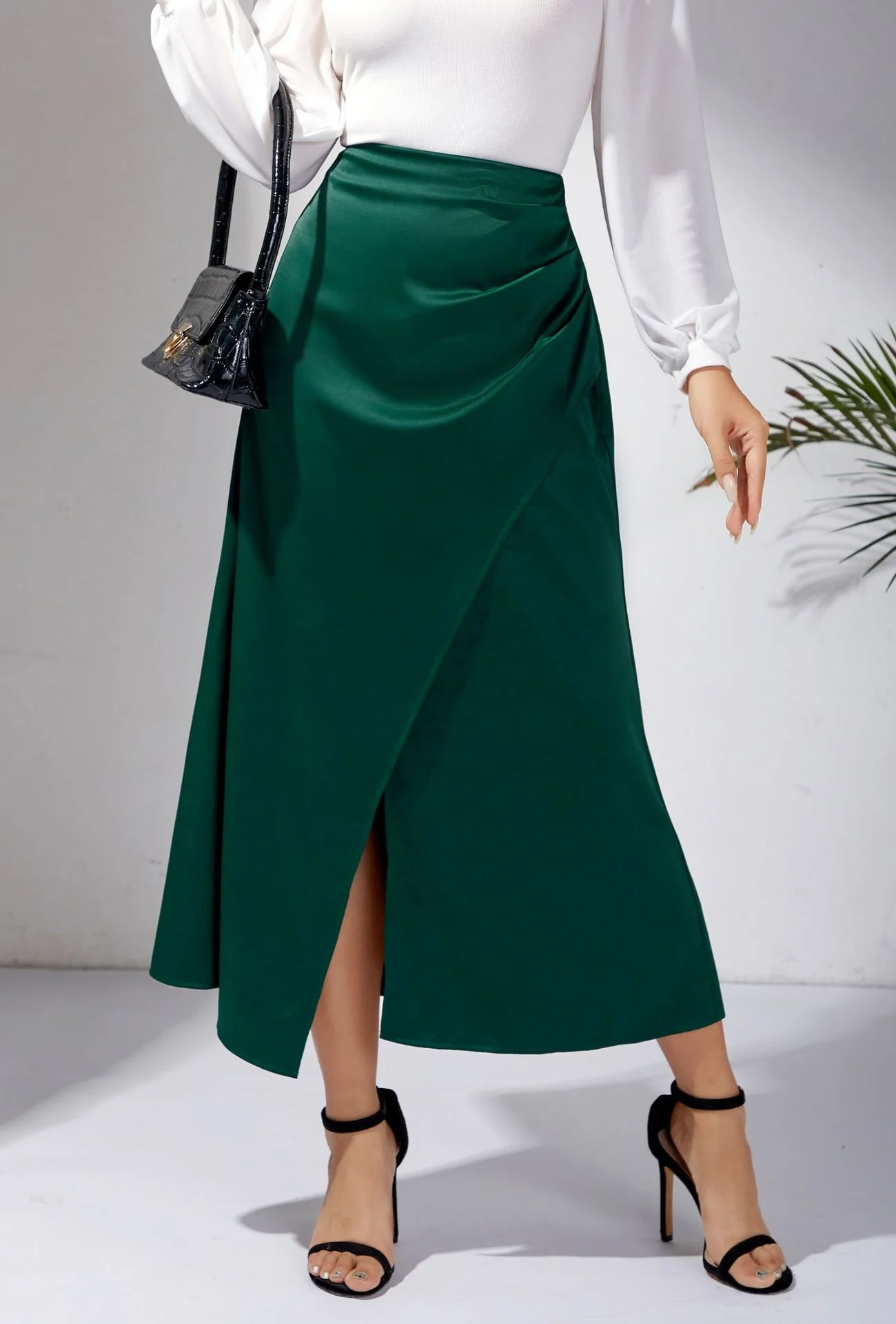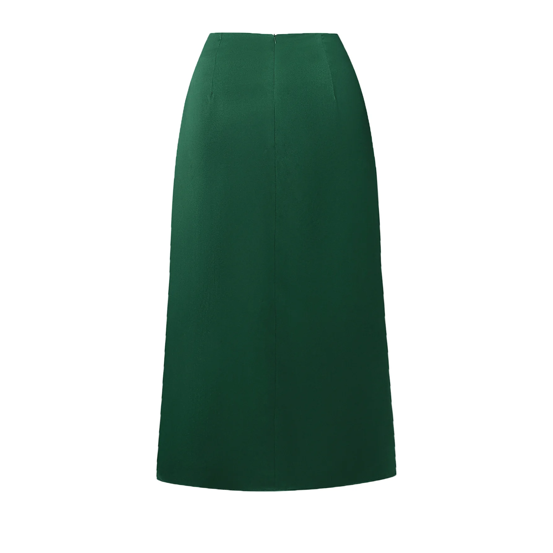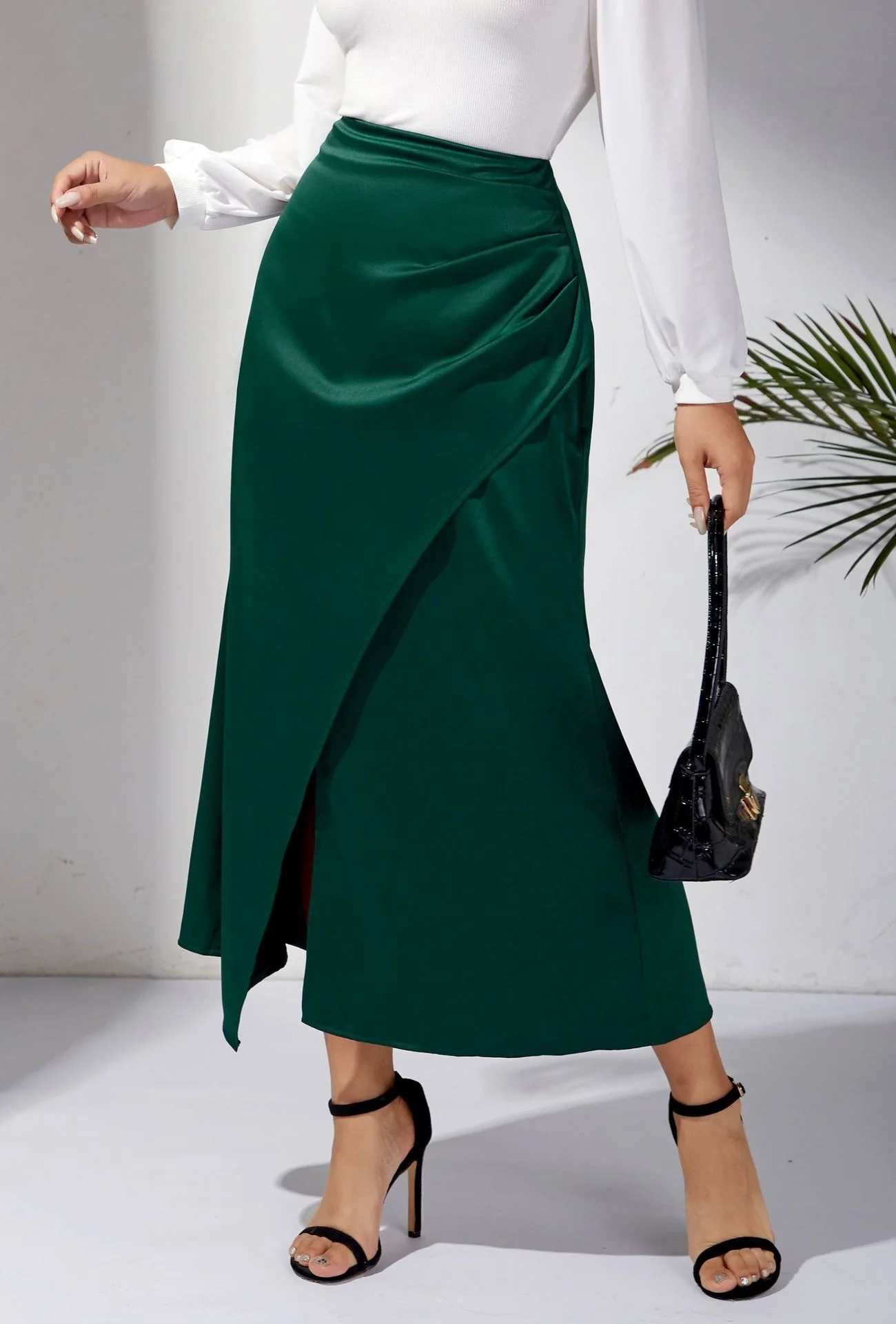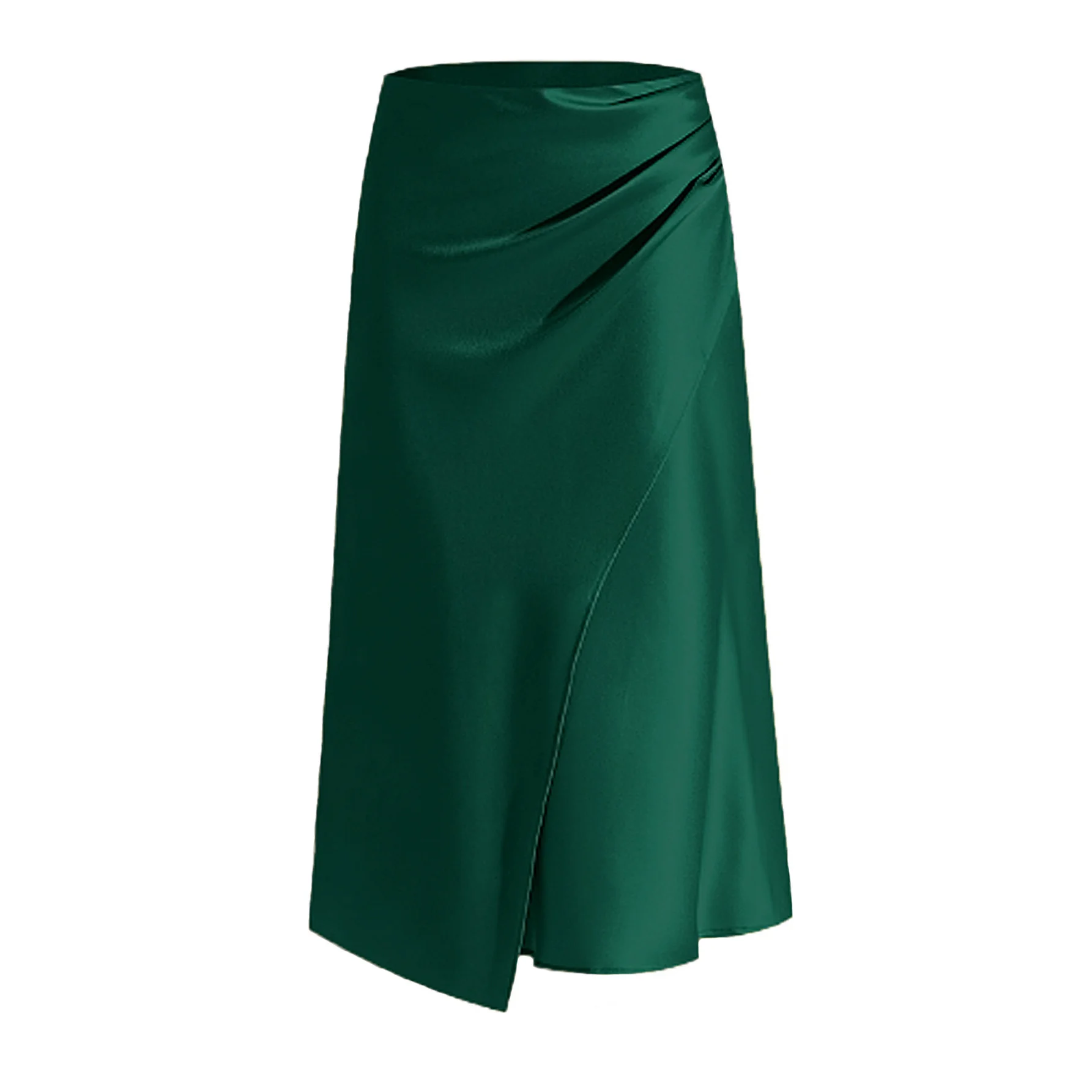New In 2025 Women's Summer High Waist Satin Pleated Split Green Long Skirt Solid Color Zipper Office Lady Party Elegant Skirts