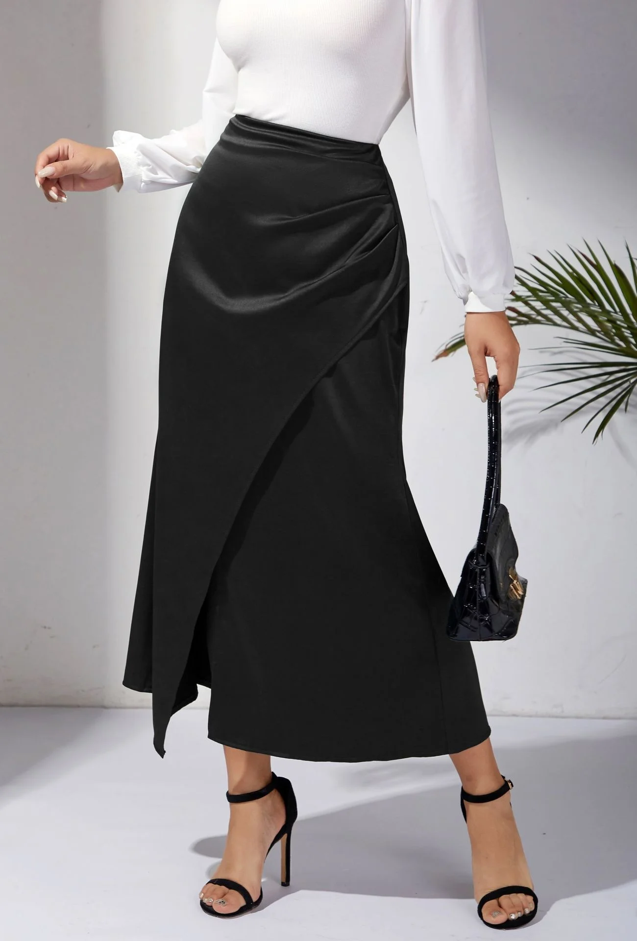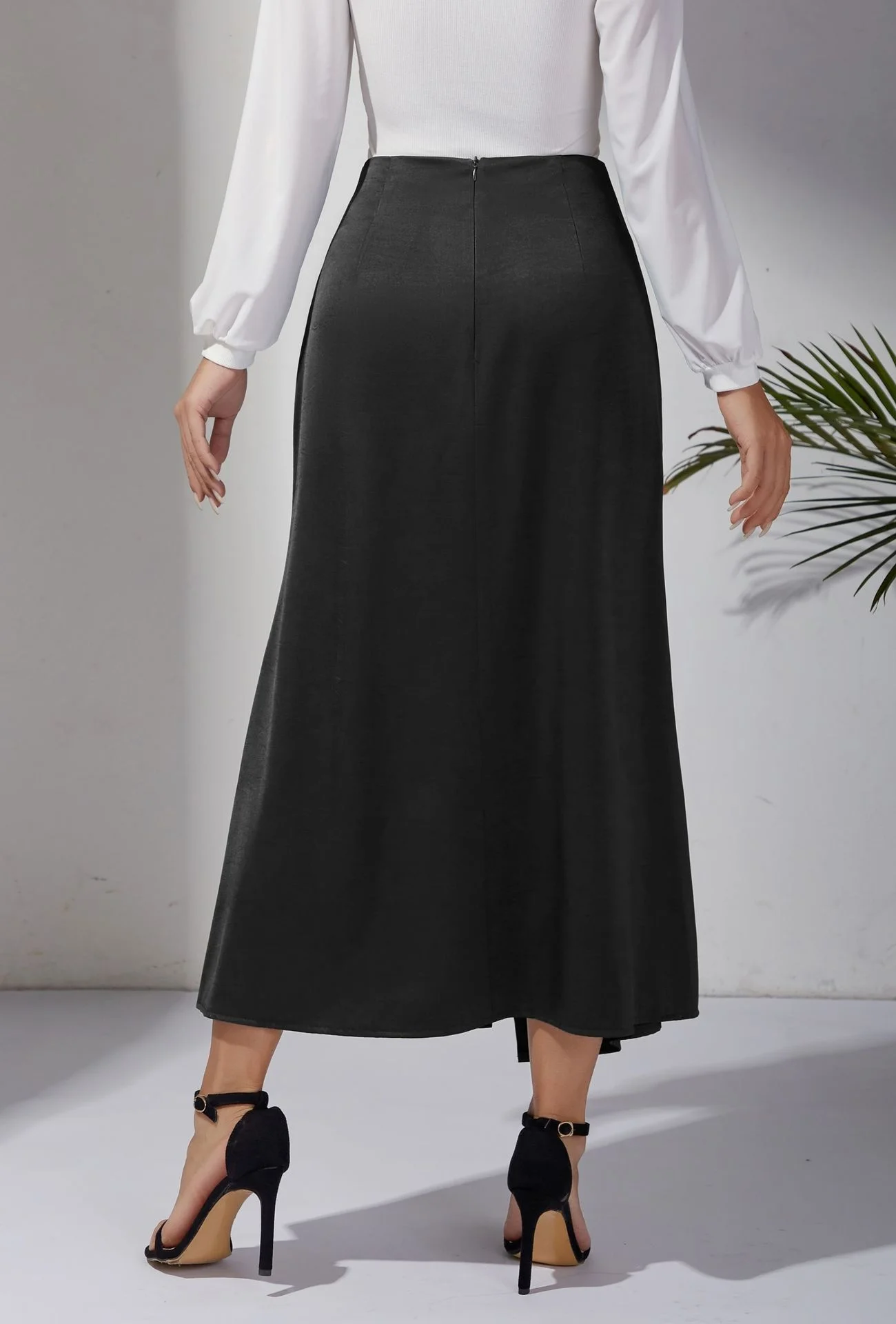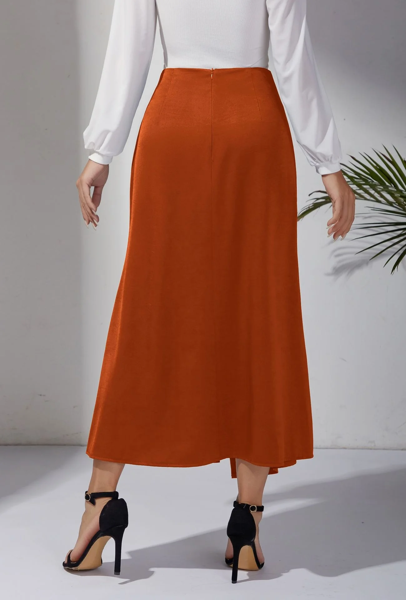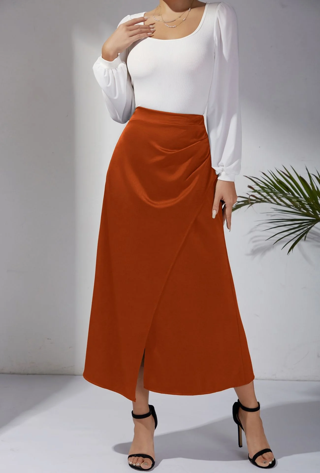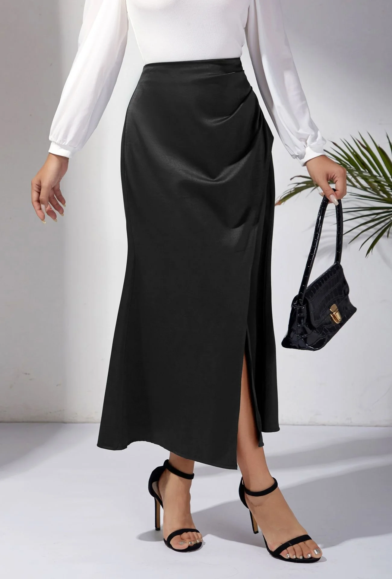 New In 2025 Women's Summer High Waist Satin Pleated Split Green Long Skirt Solid Color Zipper Office Lady Party Elegant Skirts