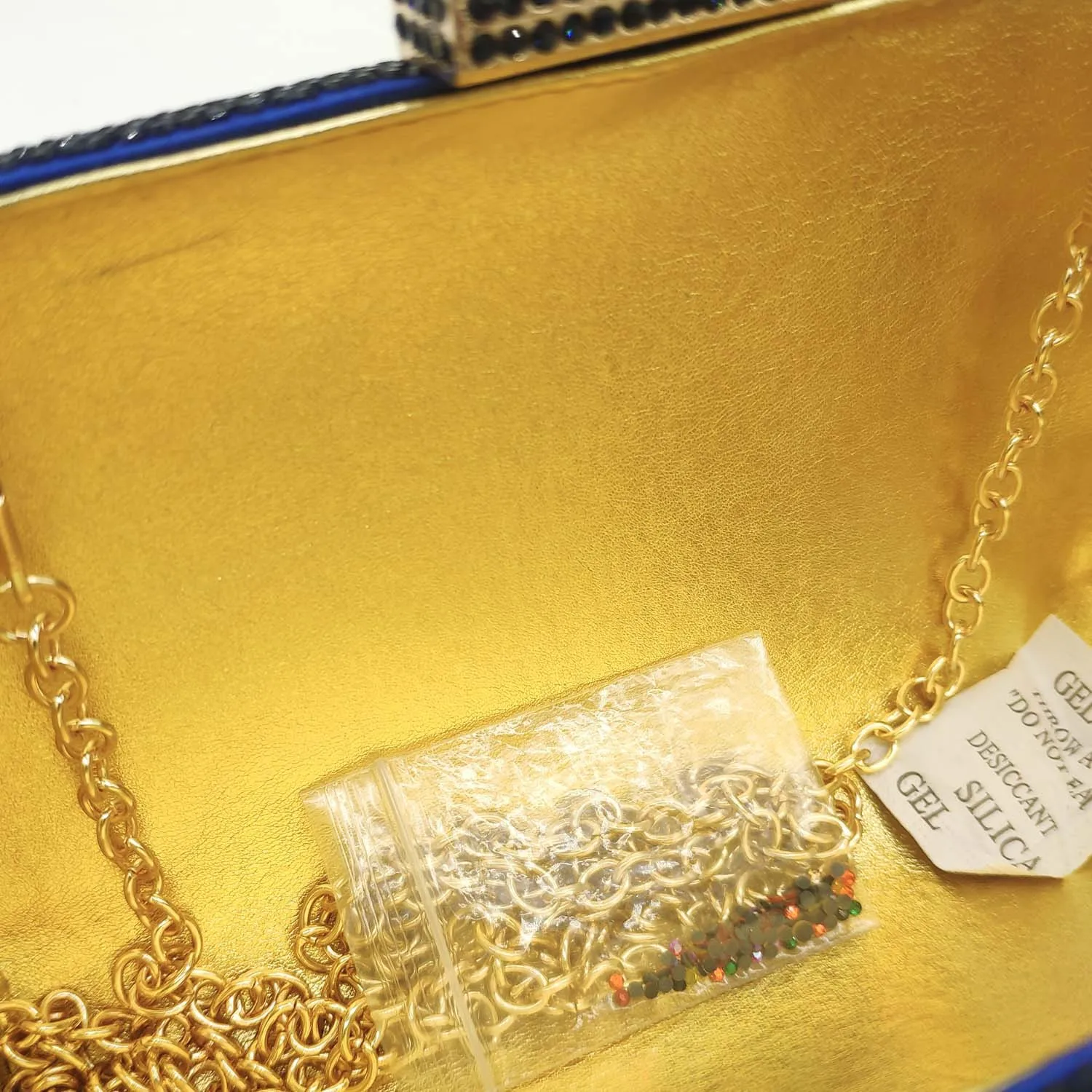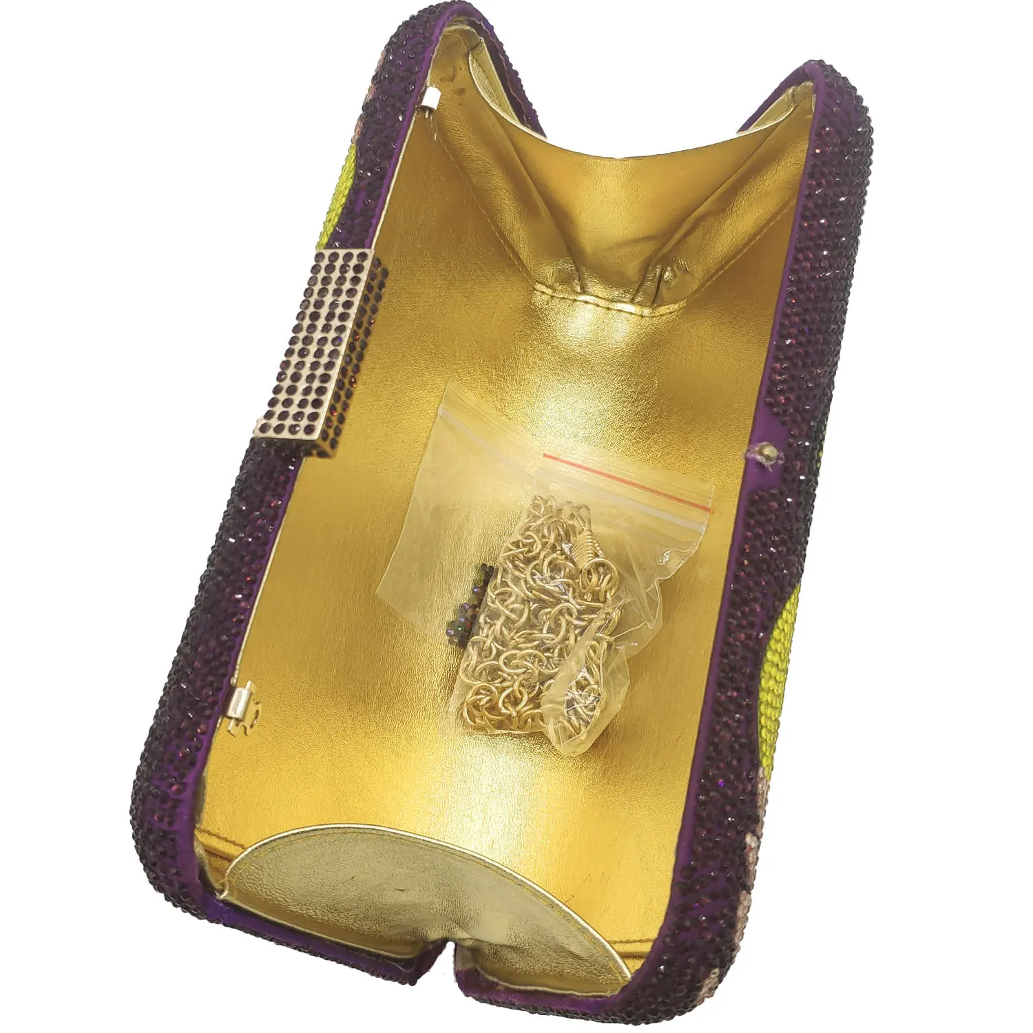 Featuring intricate rhinestone and diamond chain decoration, this bag adds a touch of elegance to any outfit.