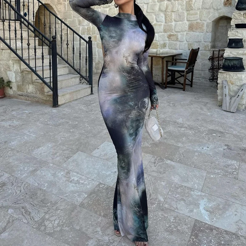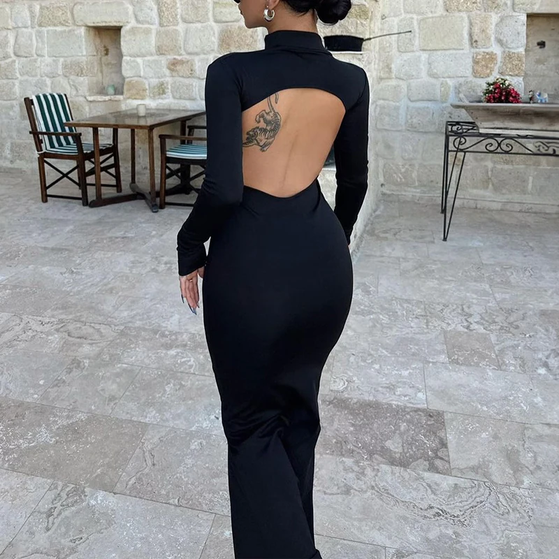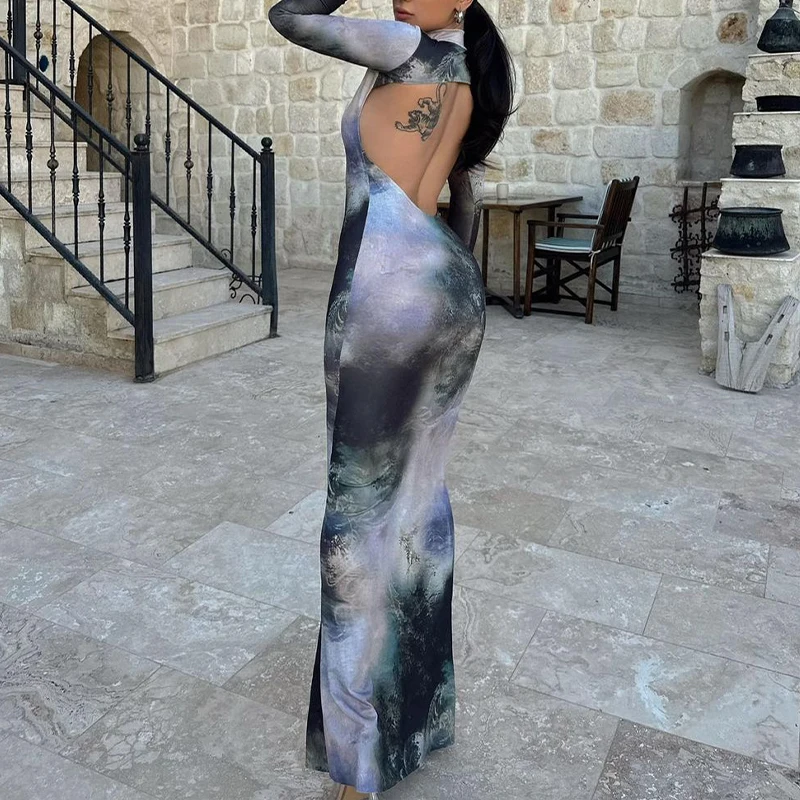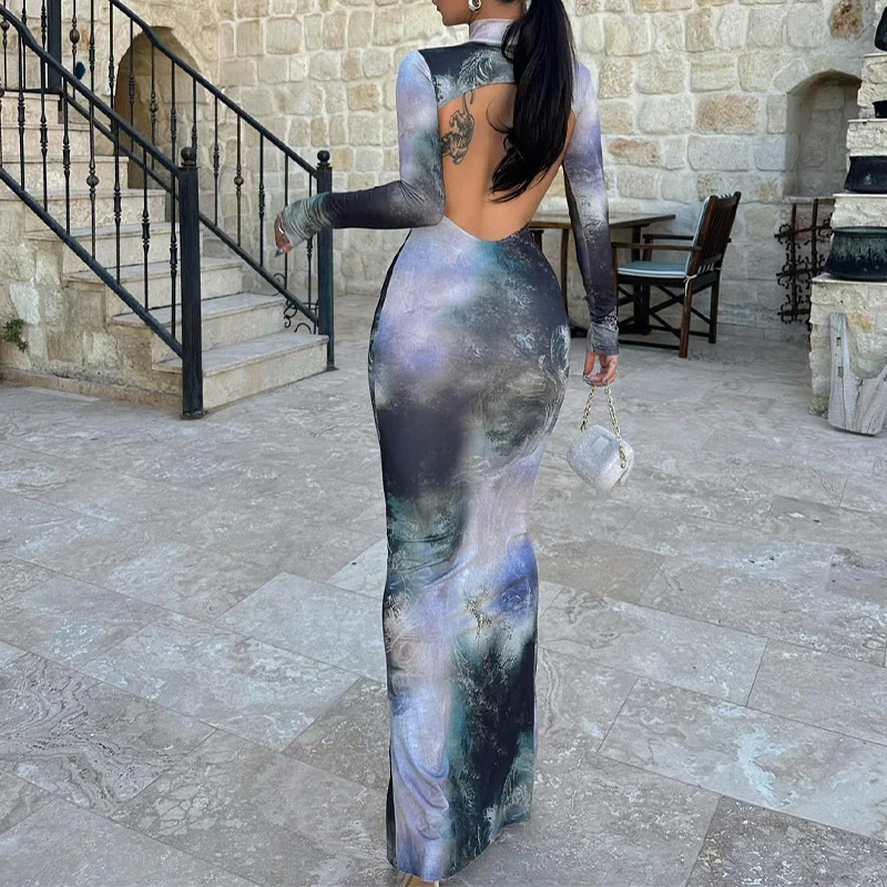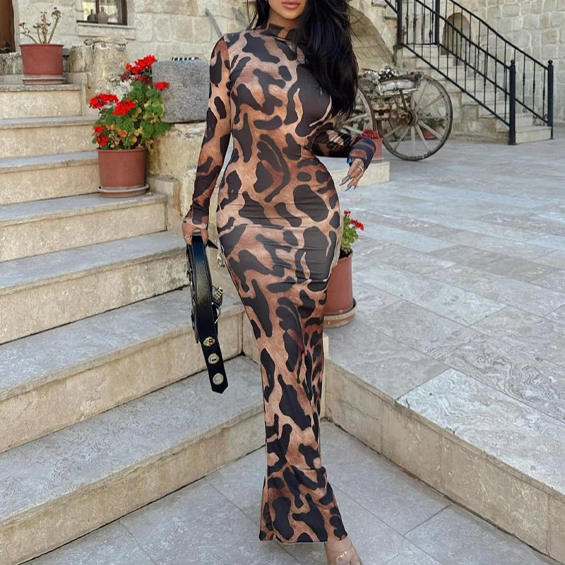 OMSJ Open Back Fashion Sexy Leopard Printed Long Sleeve Bodycon High Waist Wrapped Hip Long Style Women's Dresses Party Clothing