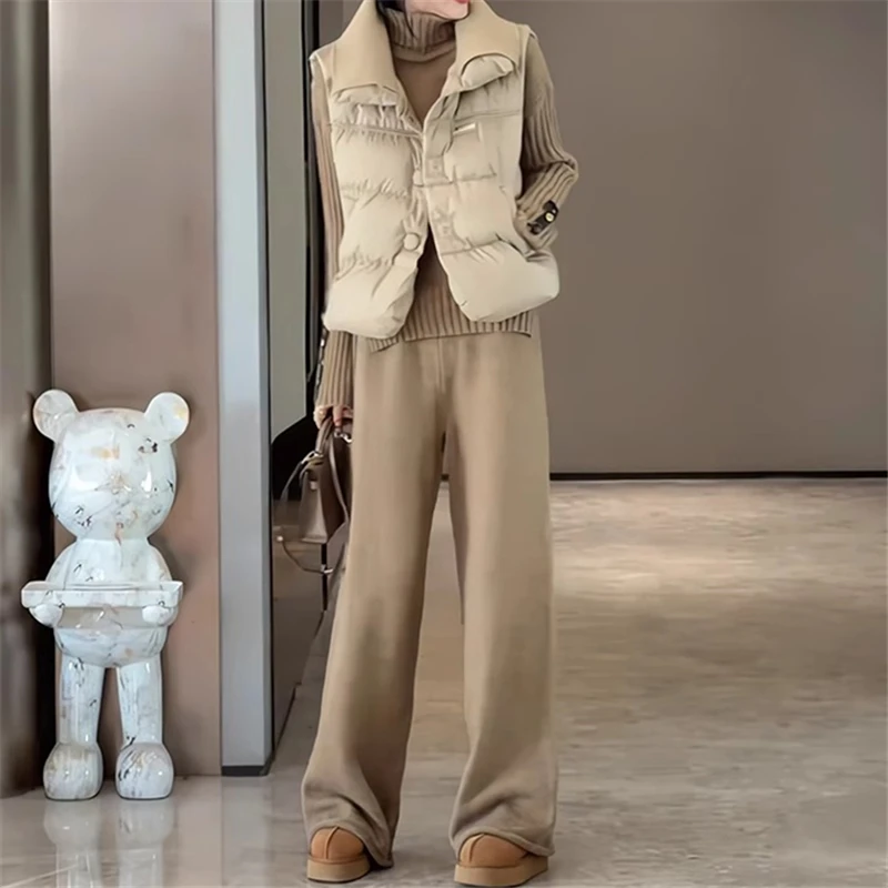 REALEFT 2024 New Autumn Winter 2 Pieces Women's Sets Knitted Tracksuit Turtleneck Split Sweater and Straight Jogging Pants Suit