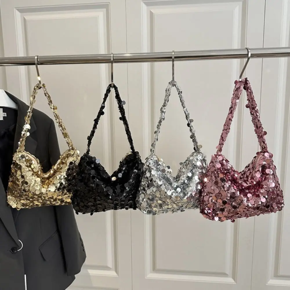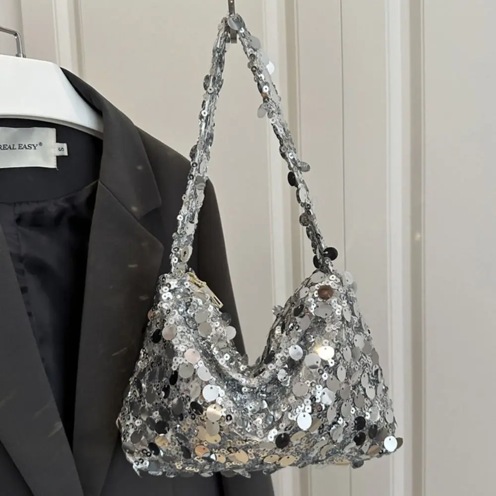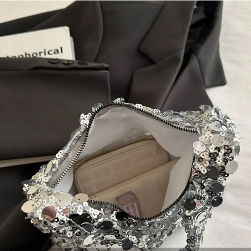 Retro Shiny Silver Sequin Wrist Bag Zipper Handbag Blingbling Handbag Magnetic Small Purse Evening Banquet Bag Party