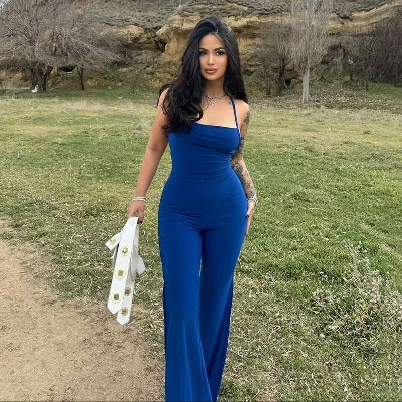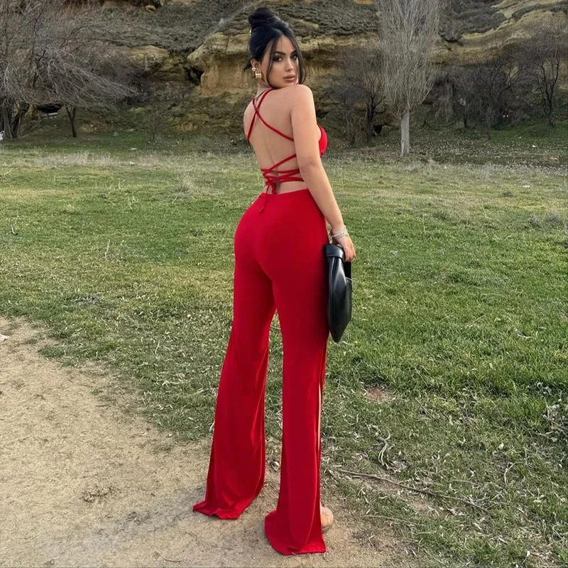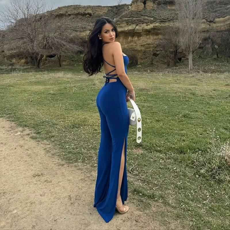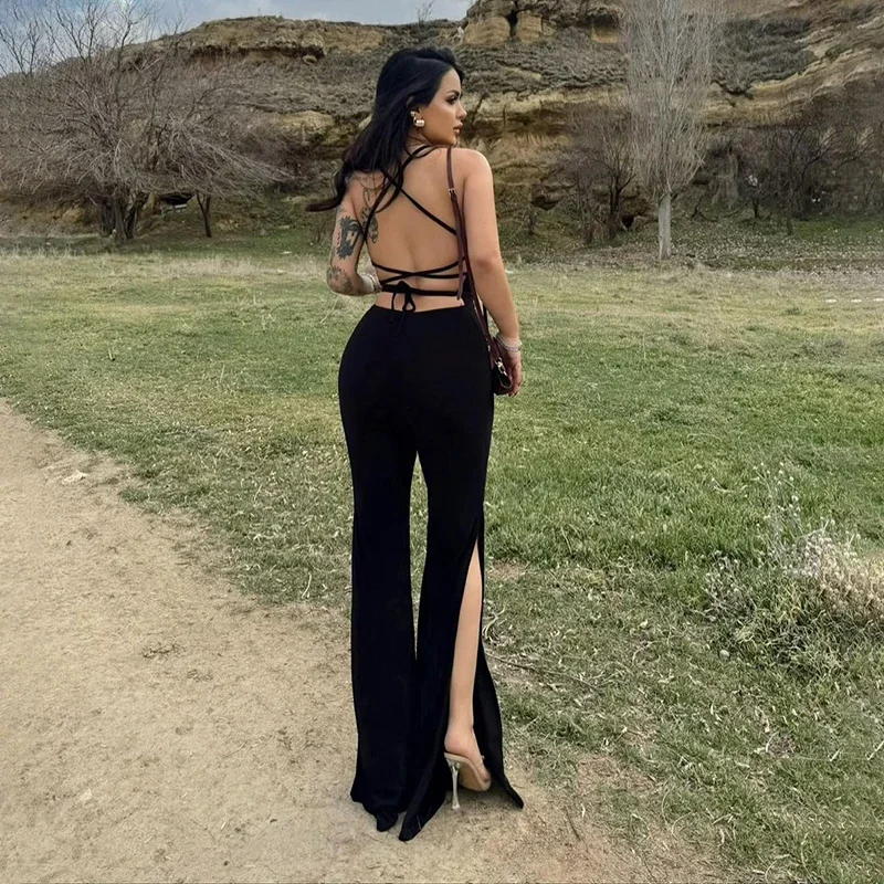 Sexy Backless Jumpsuits Women Summer New Fashion Bandage Slim Split Sleeveless Solid Rompers Streetwear Casual Sporty Overall