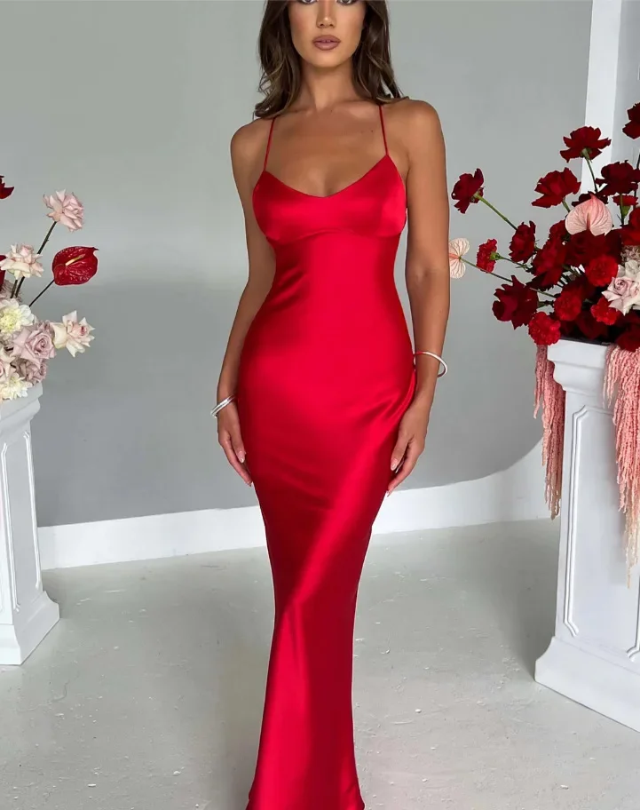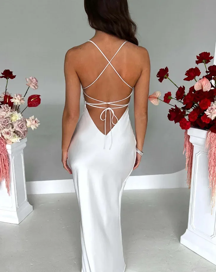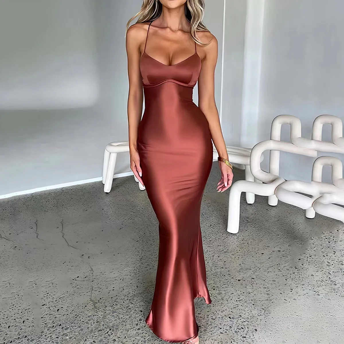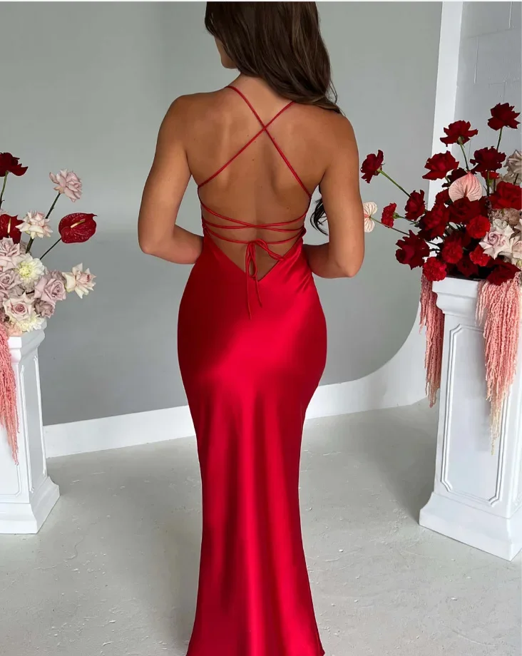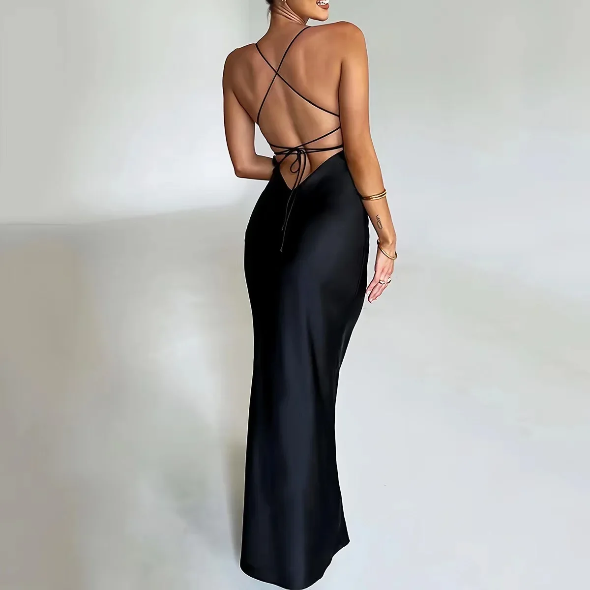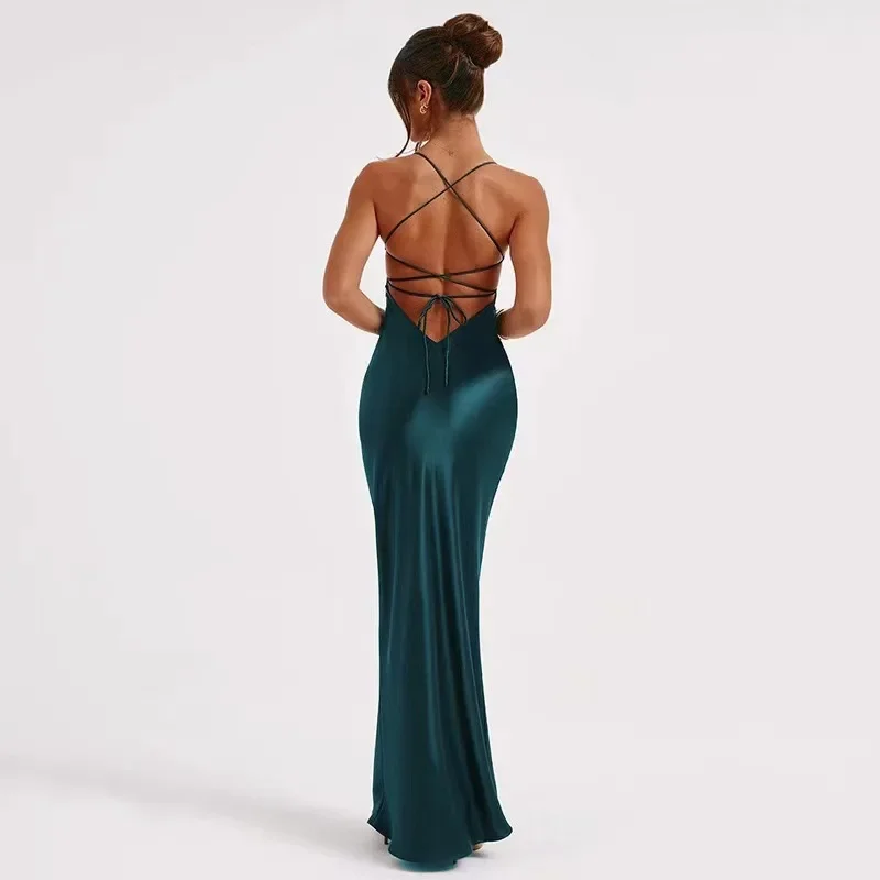 Sexy Strap Satin Fashion Backless Waist Cinched Evening Gown Dress Cross-Border Women's Clothing Regular Waistline Ankle-Length