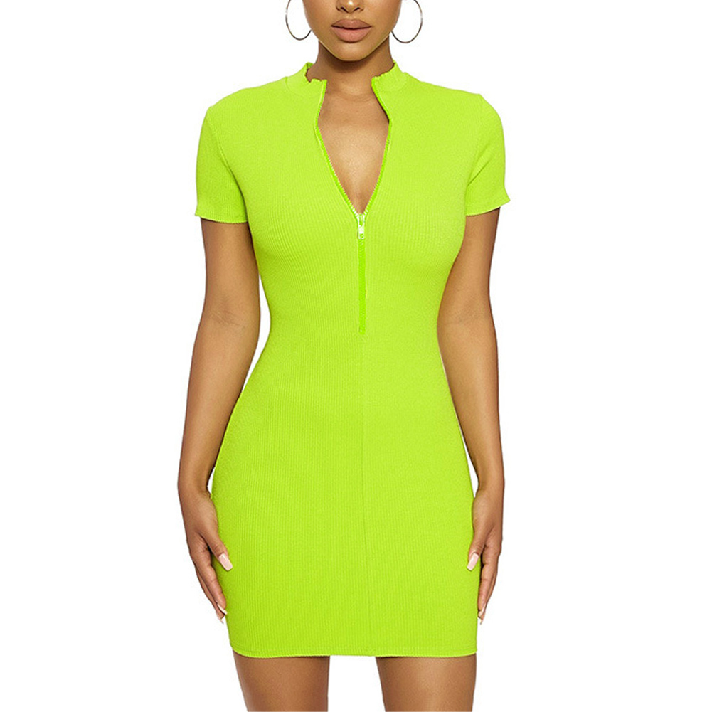 Summer Women Sexy Vestidos Solid Color Mock Neck Short Sleeve Ribbed Zip Bodycon Mini Short Dress Women Clothes Party dresses