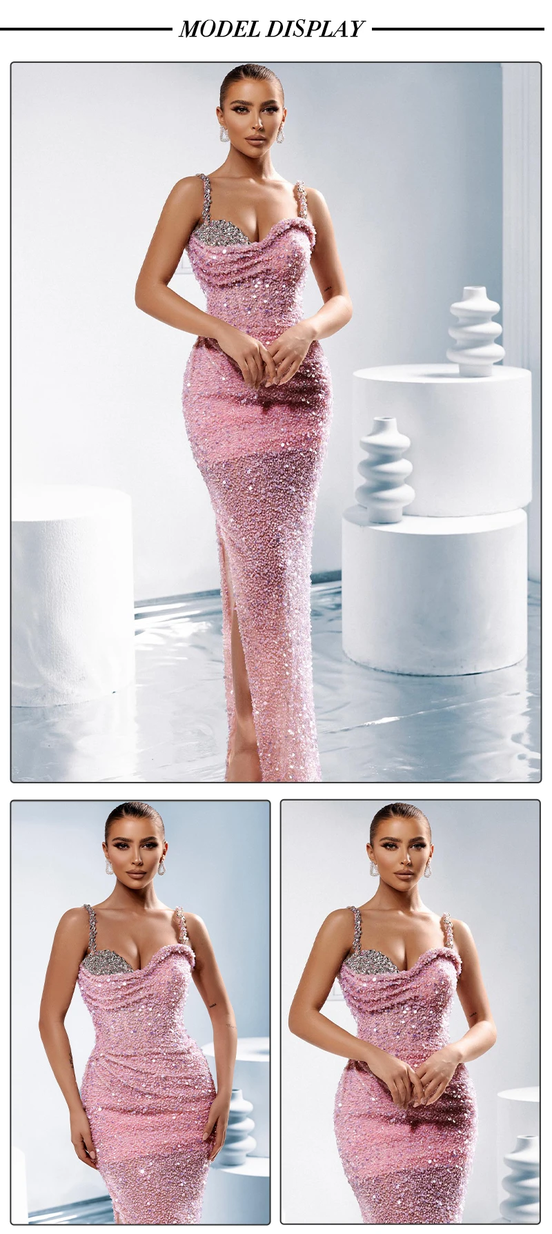 VC Pink Glitter Slip Long Dress For Women Crystal Spaghetti Straps Sleeveless Celebrity Prom Cocktail Party Evening Gowns