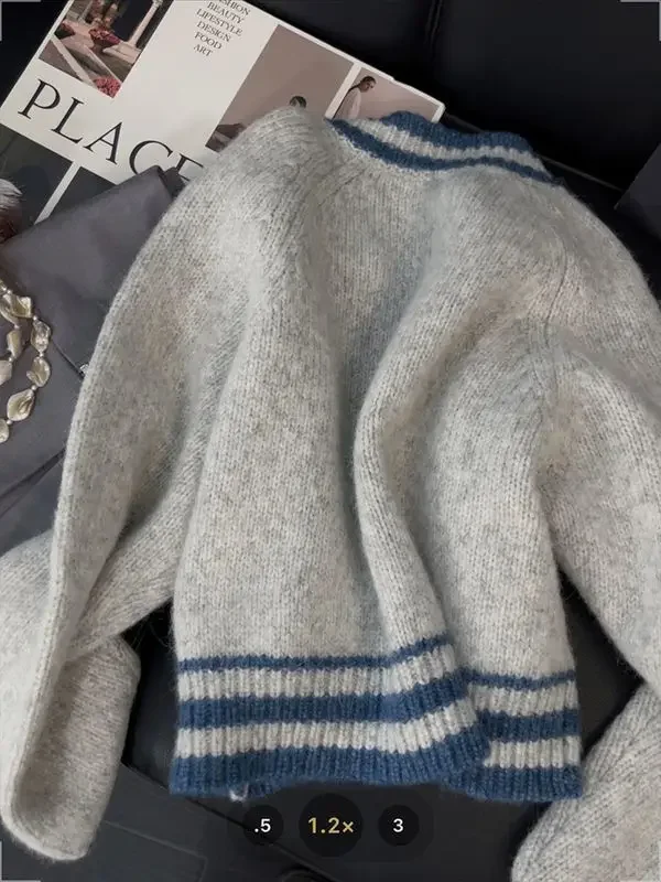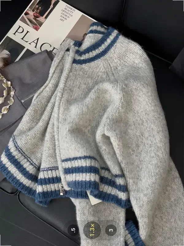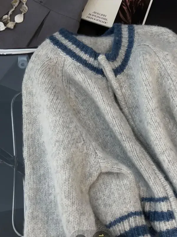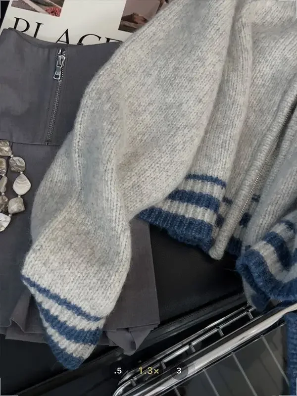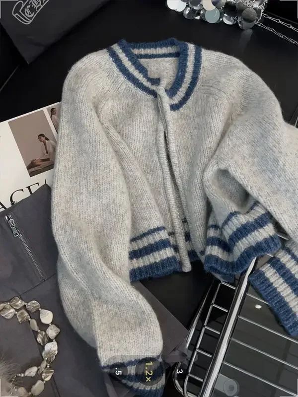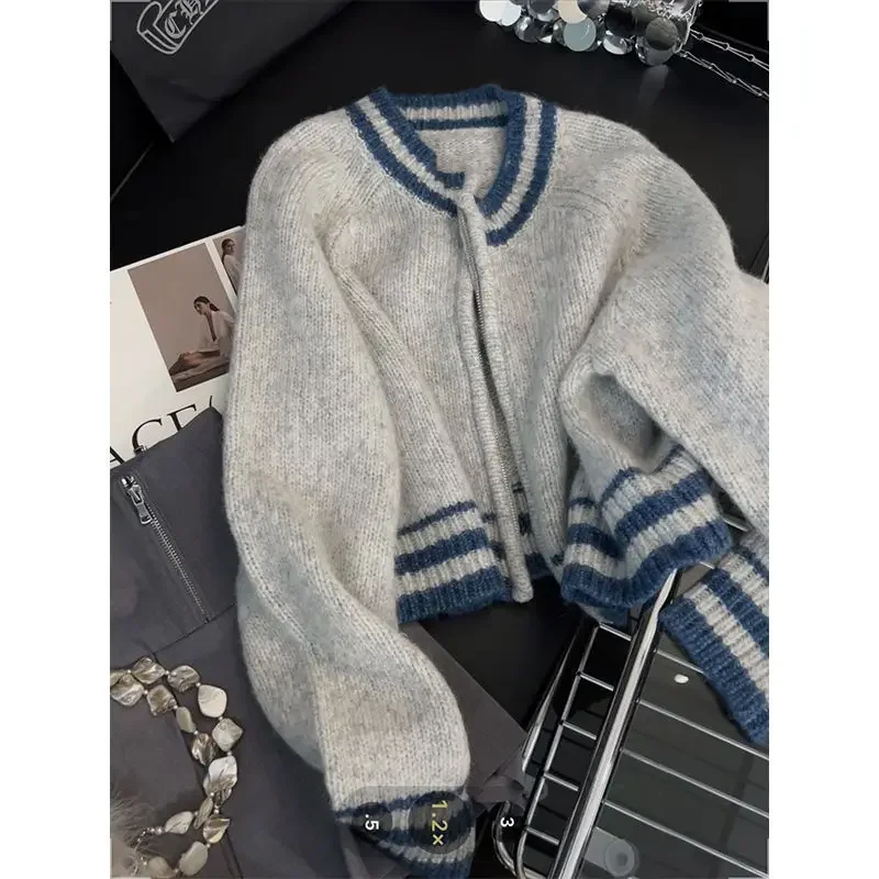 Versatile Short Knitted Sweater Women's Zipper French Contrast Color Lazy Style Autumn Winter New Arrival Elegant Cardigan
