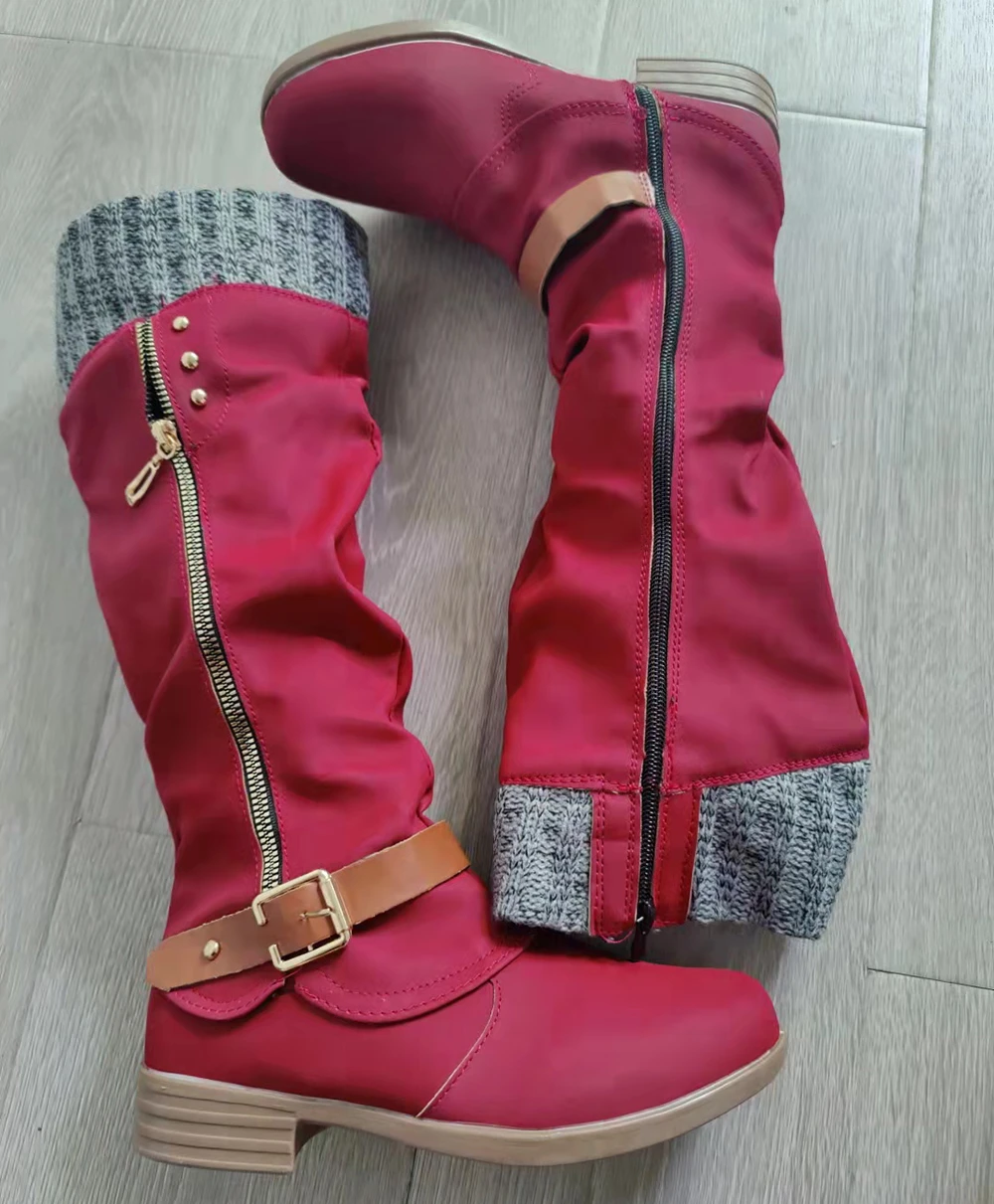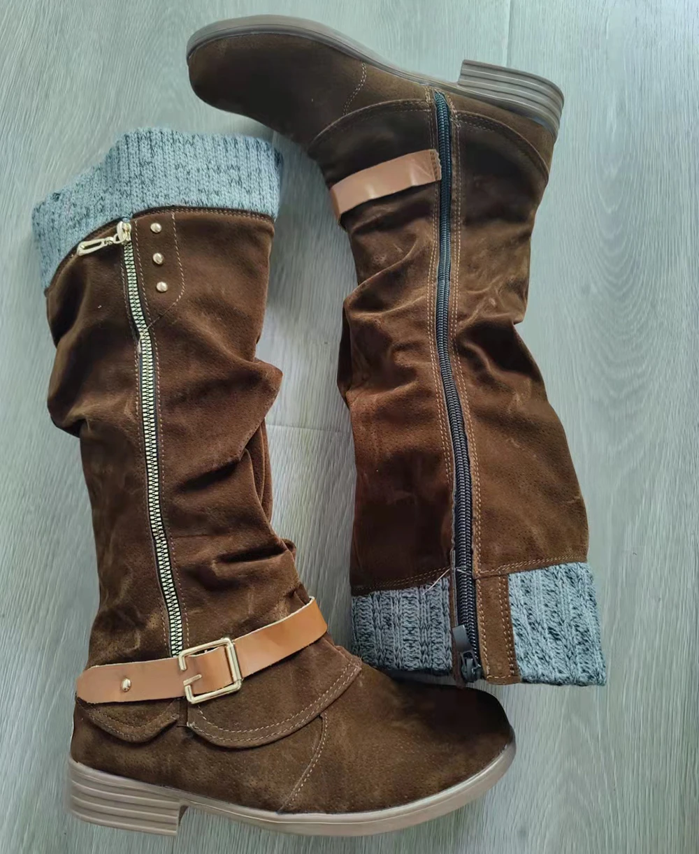 Winter Women Long Boots Round Toe Low Heel Mid-Calf Boots Knitted Patchwork Side Zipper Lace-Up Female Motorcycle Boots Botas