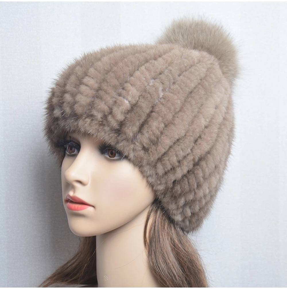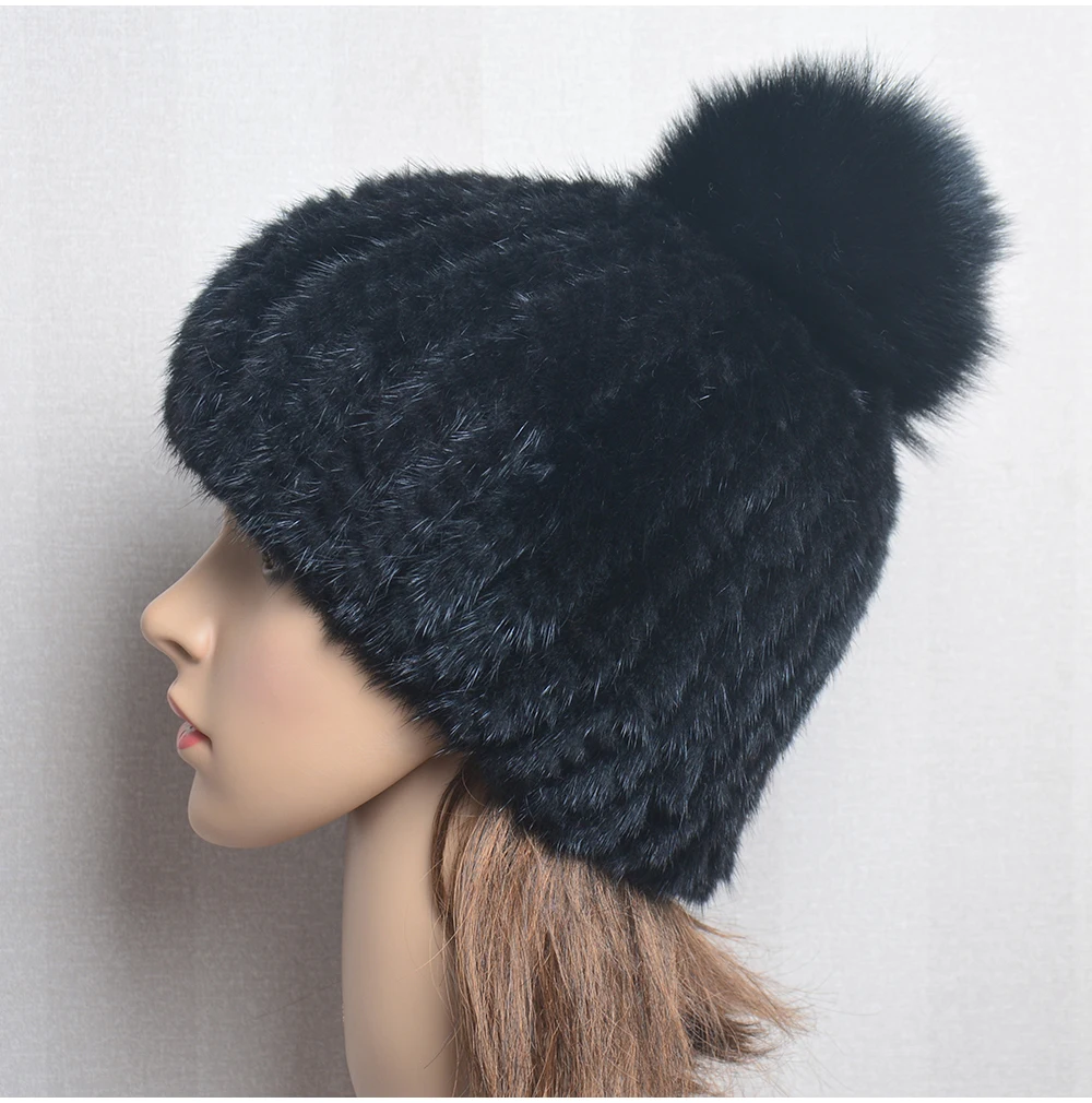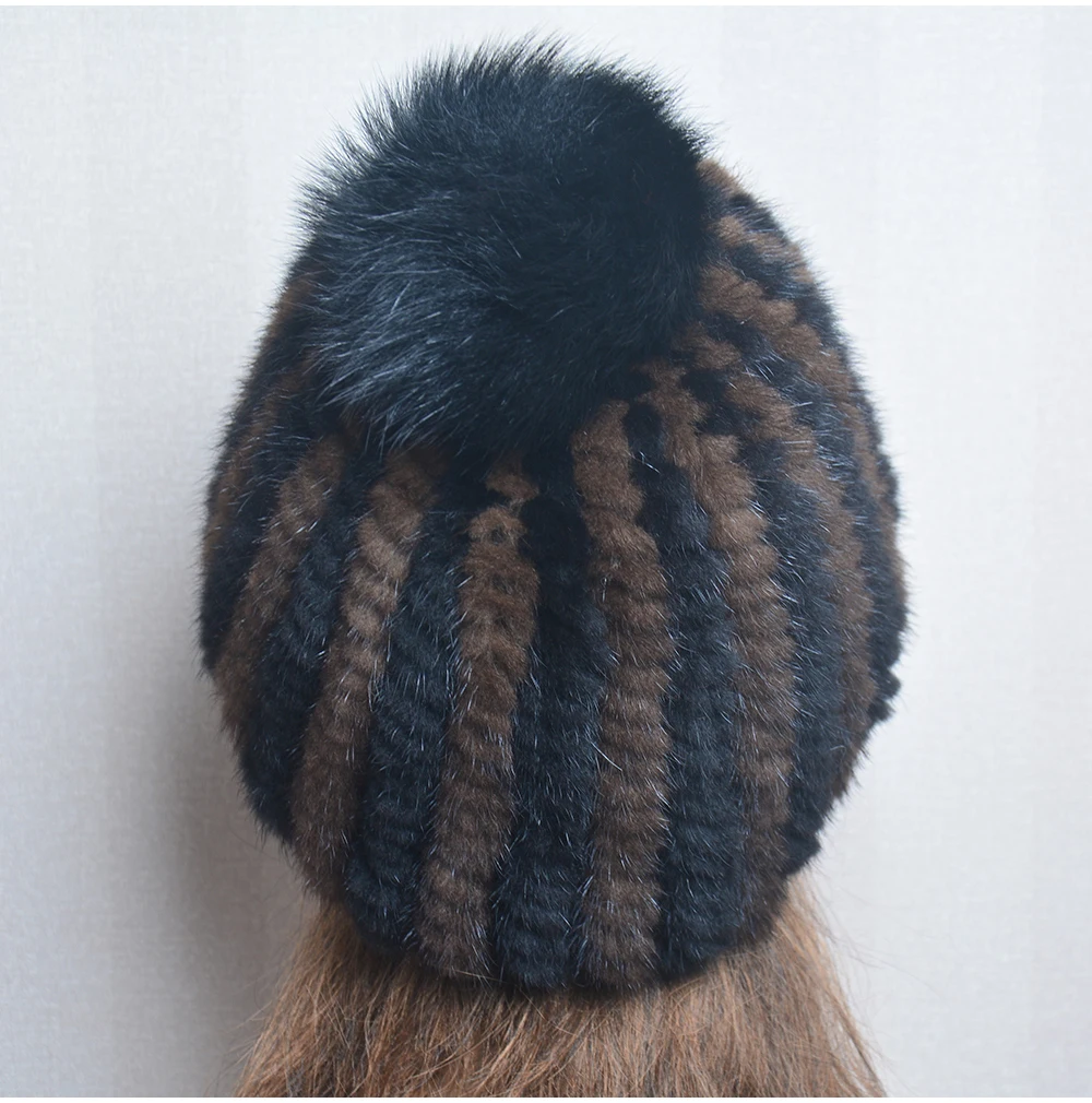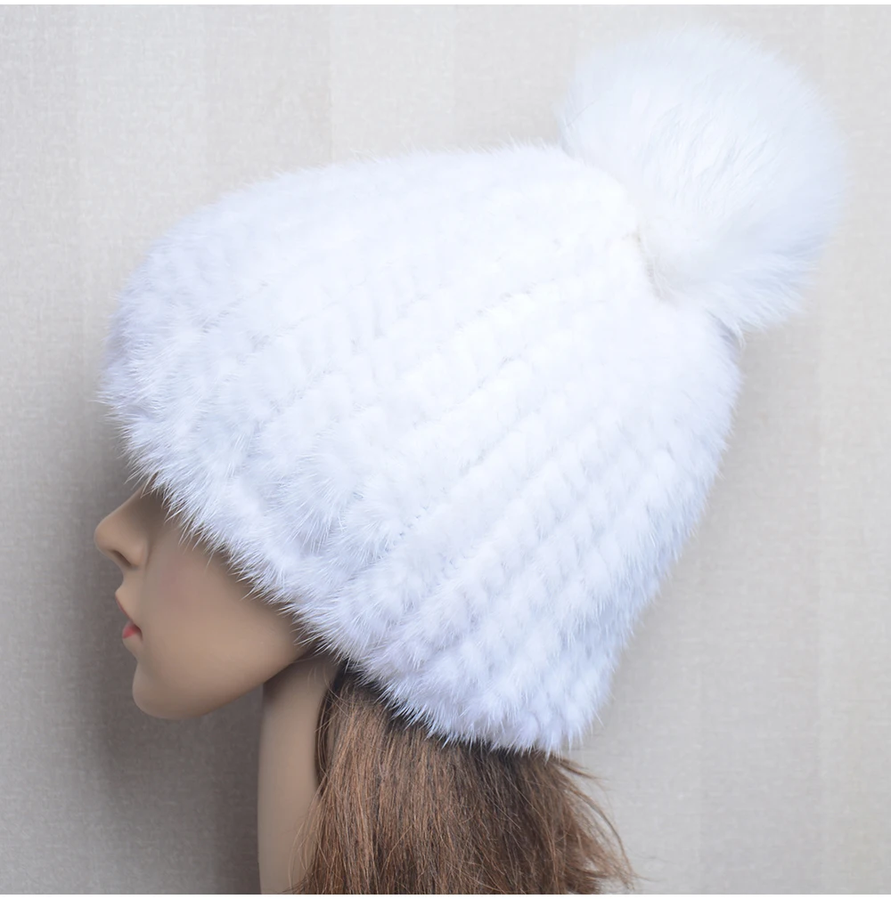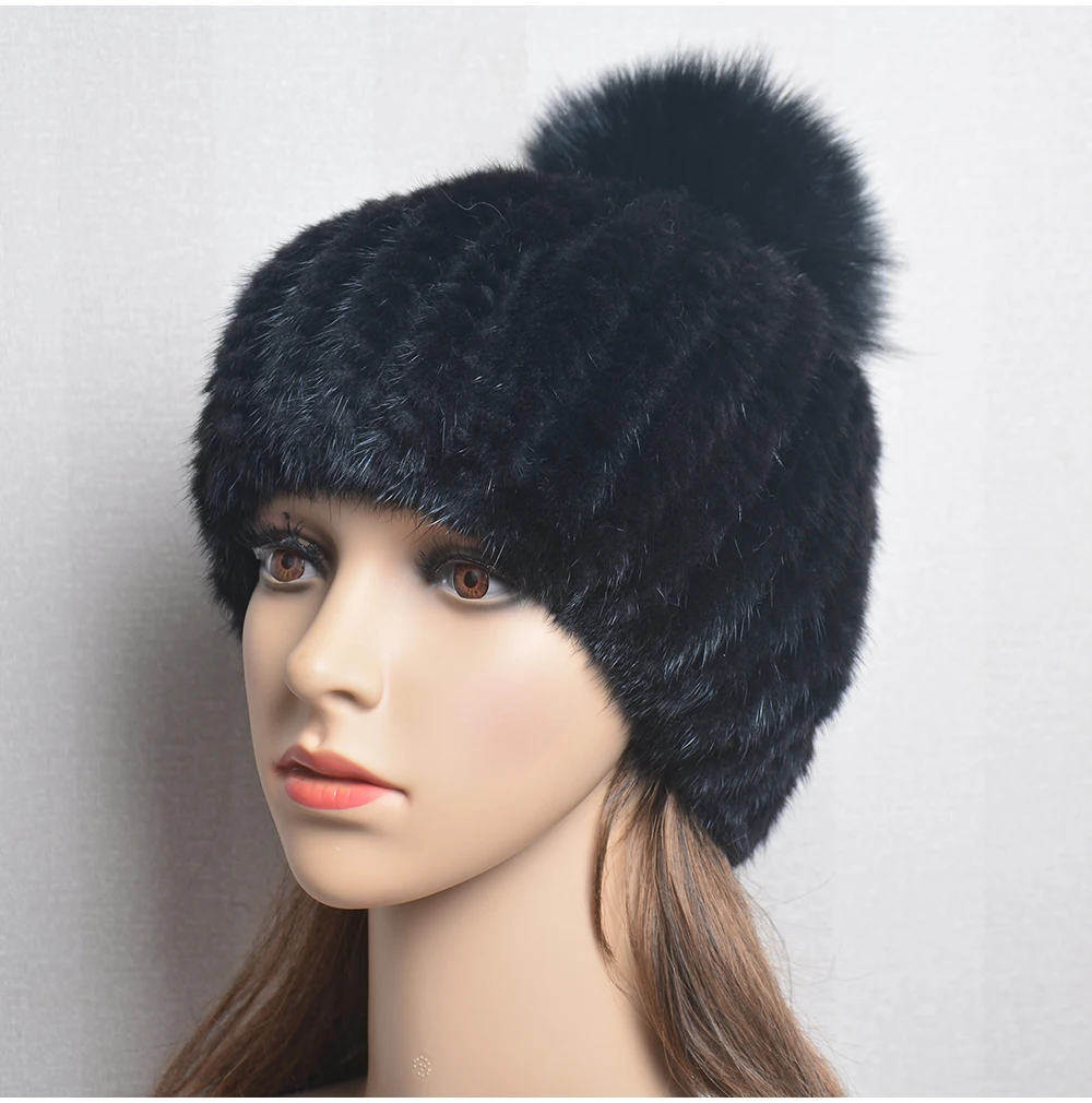 Winter Women Natural Mink Fur Hat Hand Knitted Warm 100% Genuine Mink Fur Cap Russia Lady Real Mink Fur And Fox Fur Pompoms Hats