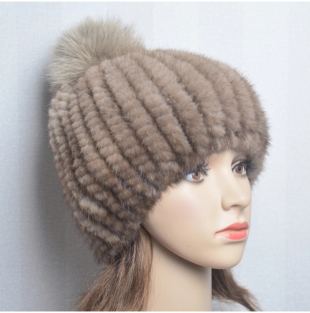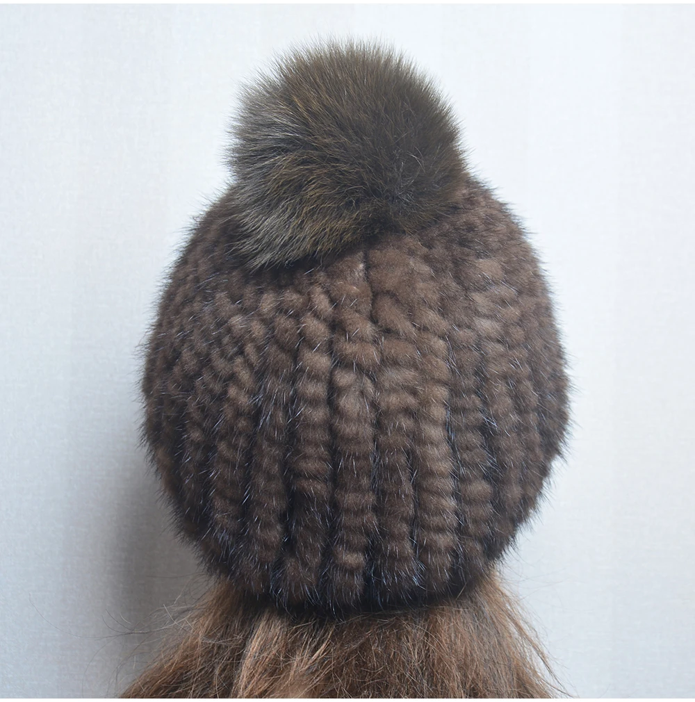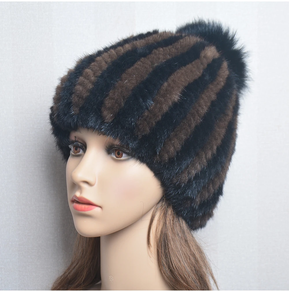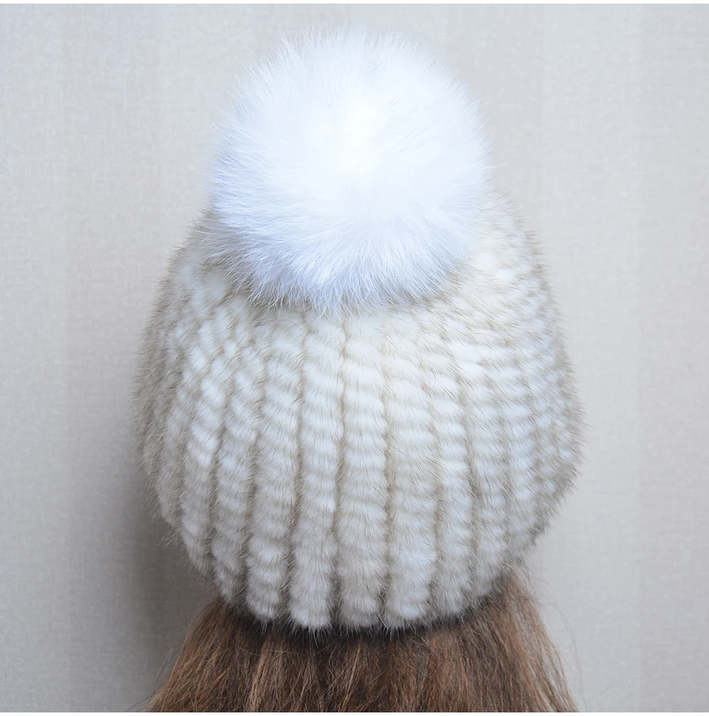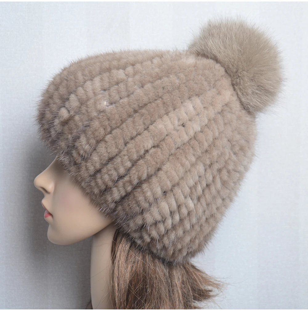 Winter Women Natural Mink Fur Hat Hand Knitted Warm 100% Genuine Mink Fur Cap Russia Lady Real Mink Fur And Fox Fur Pompoms Hats