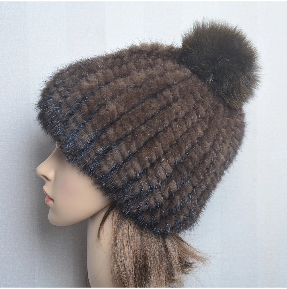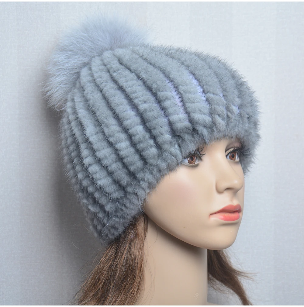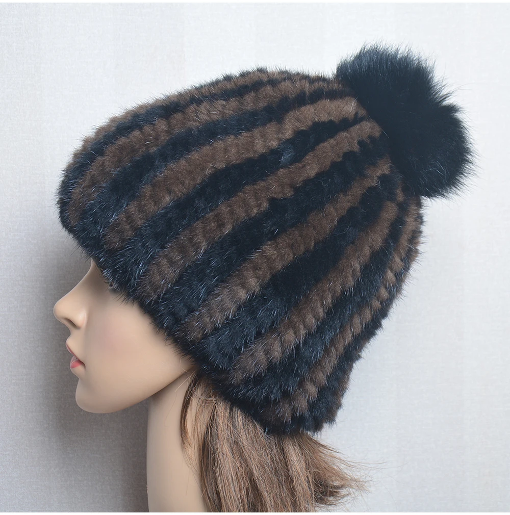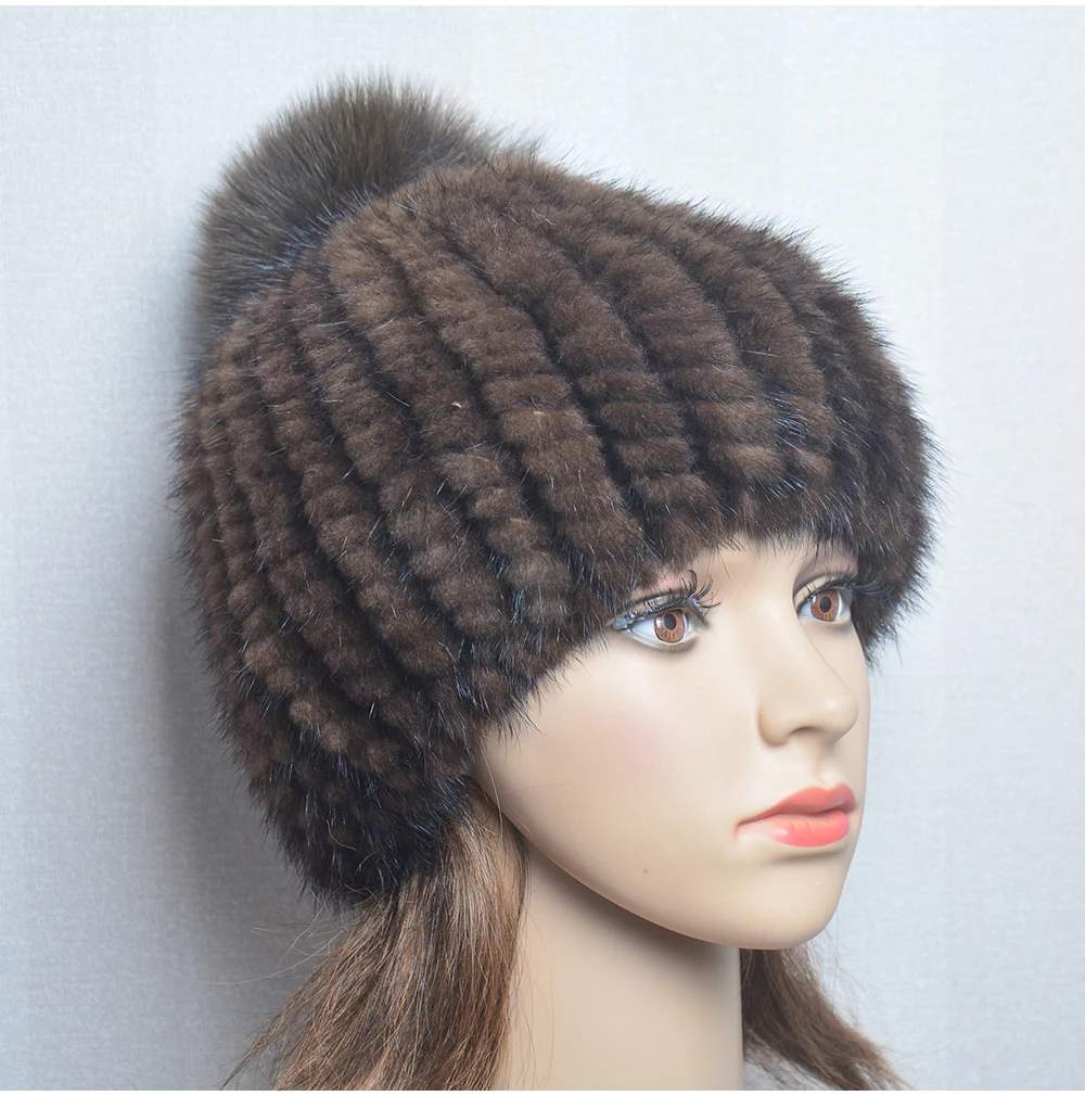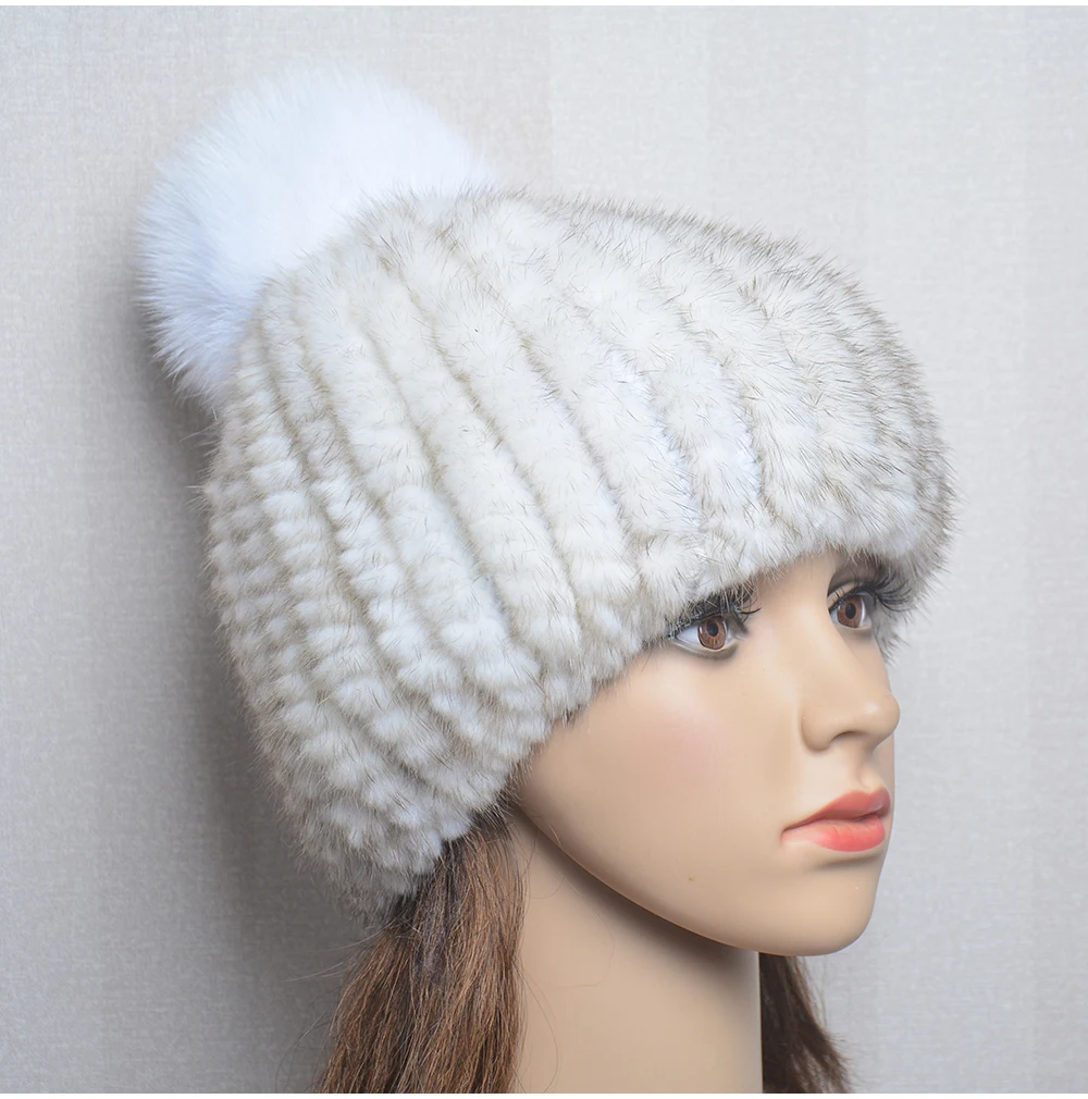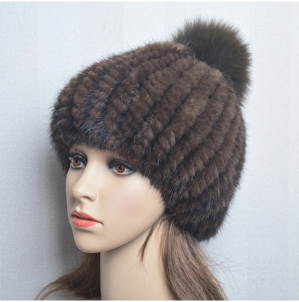 Winter Women Natural Mink Fur Hat Hand Knitted Warm 100% Genuine Mink Fur Cap Russia Lady Real Mink Fur And Fox Fur Pompoms Hats