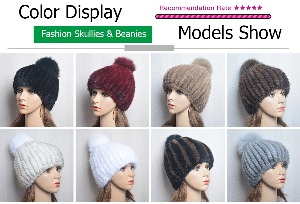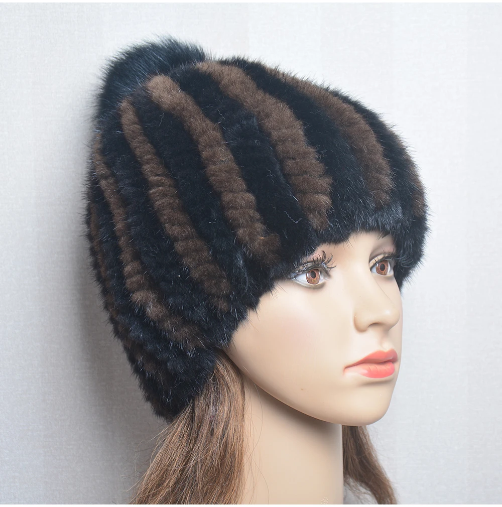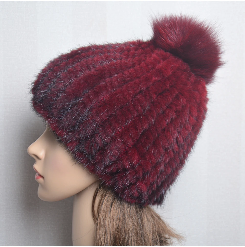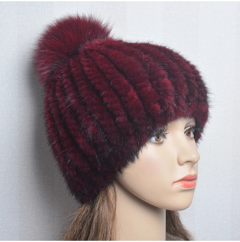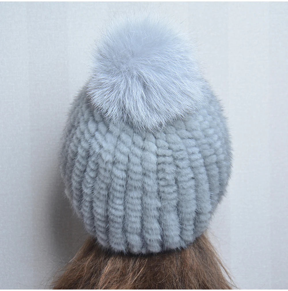 Winter Women Natural Mink Fur Hat Hand Knitted Warm 100% Genuine Mink Fur Cap Russia Lady Real Mink Fur And Fox Fur Pompoms Hats
