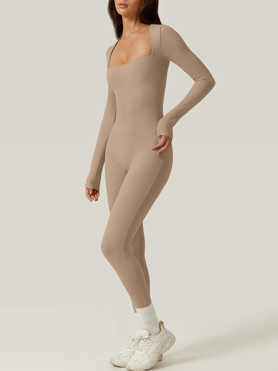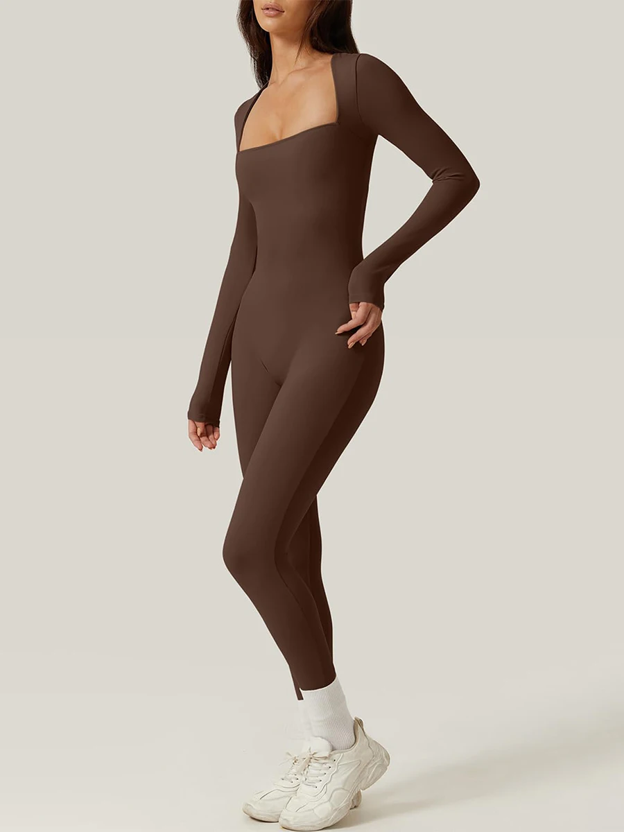 Mono largo ajustado de primavera para mujer, mono deportivo de color liso con escote cuadrado y manga larga