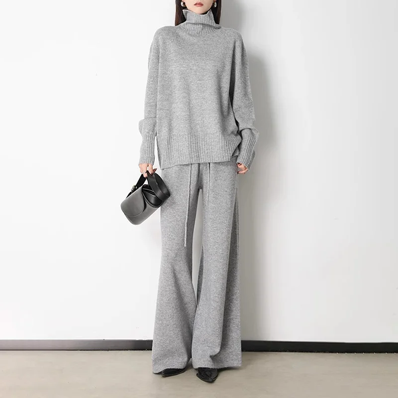 Women's 100% Wool Knitted Sweater Set Lady Fashion High Neck Soft Warm Winter Autumn Tracksuit