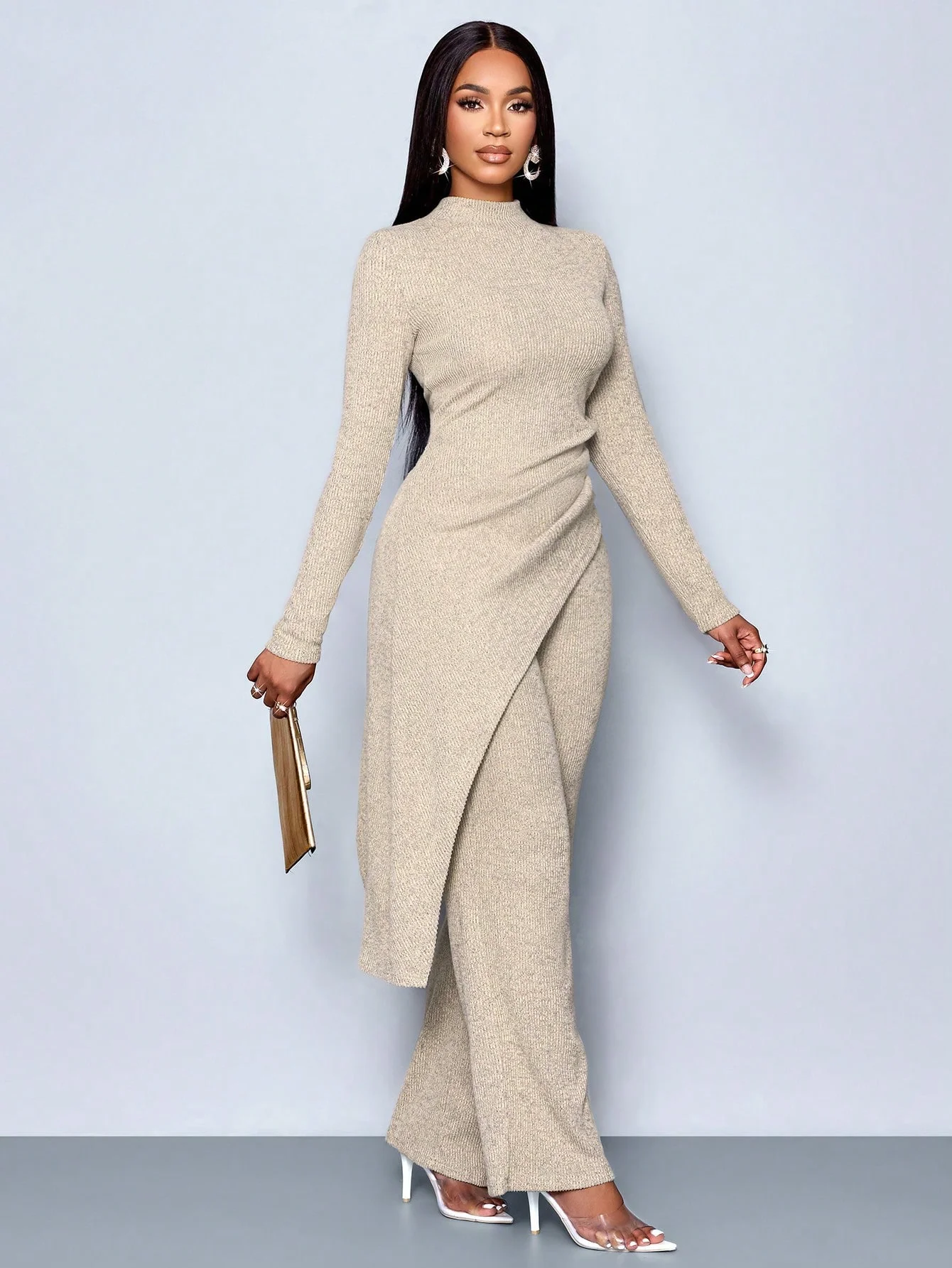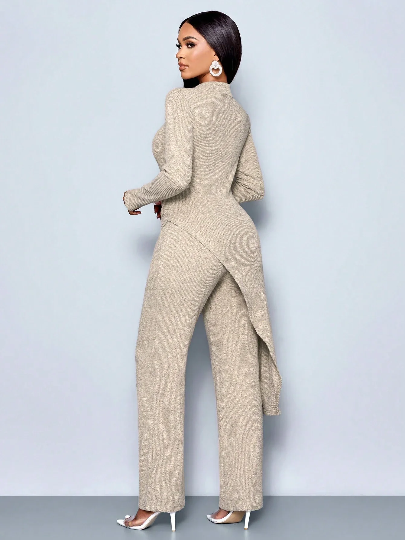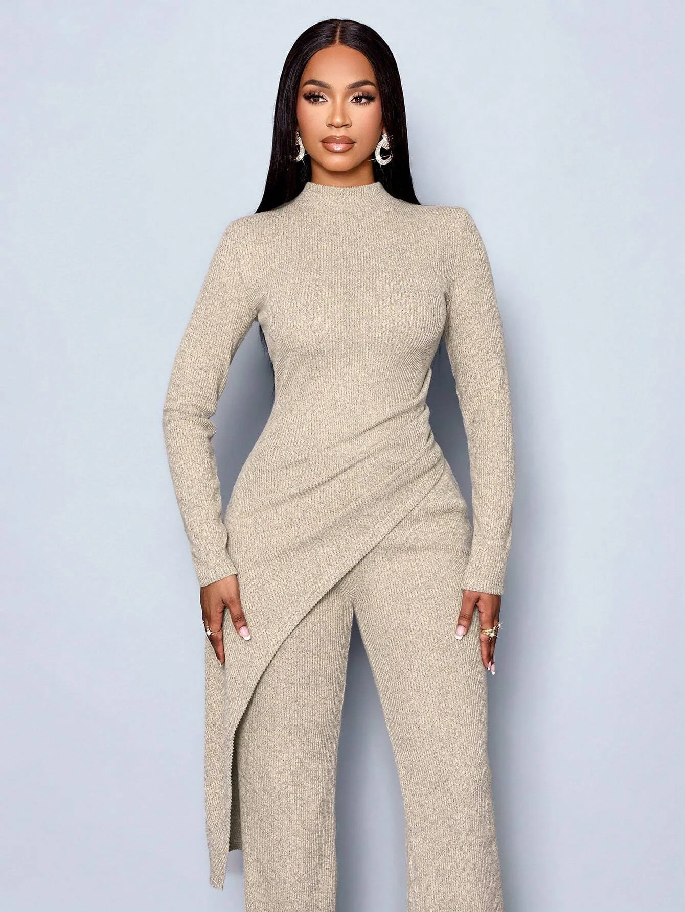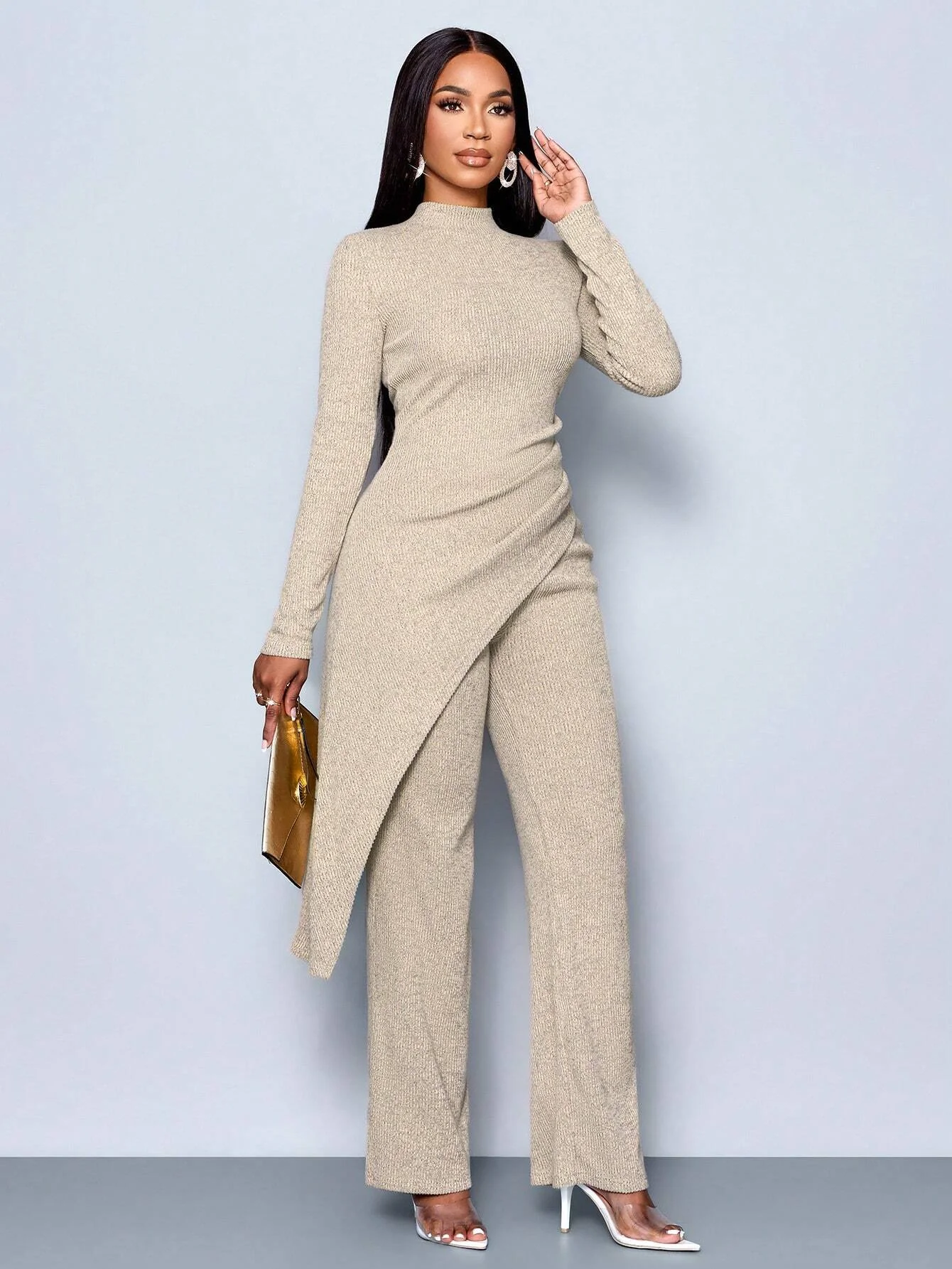 Women's Autumn/Winter Elegant Asymmetric High-neck T-shirt and Pants Set