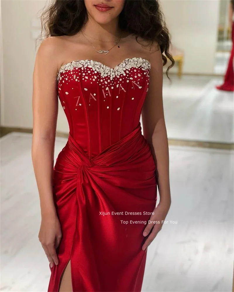 Xijun Gogerous Red Satin Evening Dresses Crystals Mermaid Prom Dresses Formal Prom Gowns Side Slit 2023 Saudi Arabric For Women